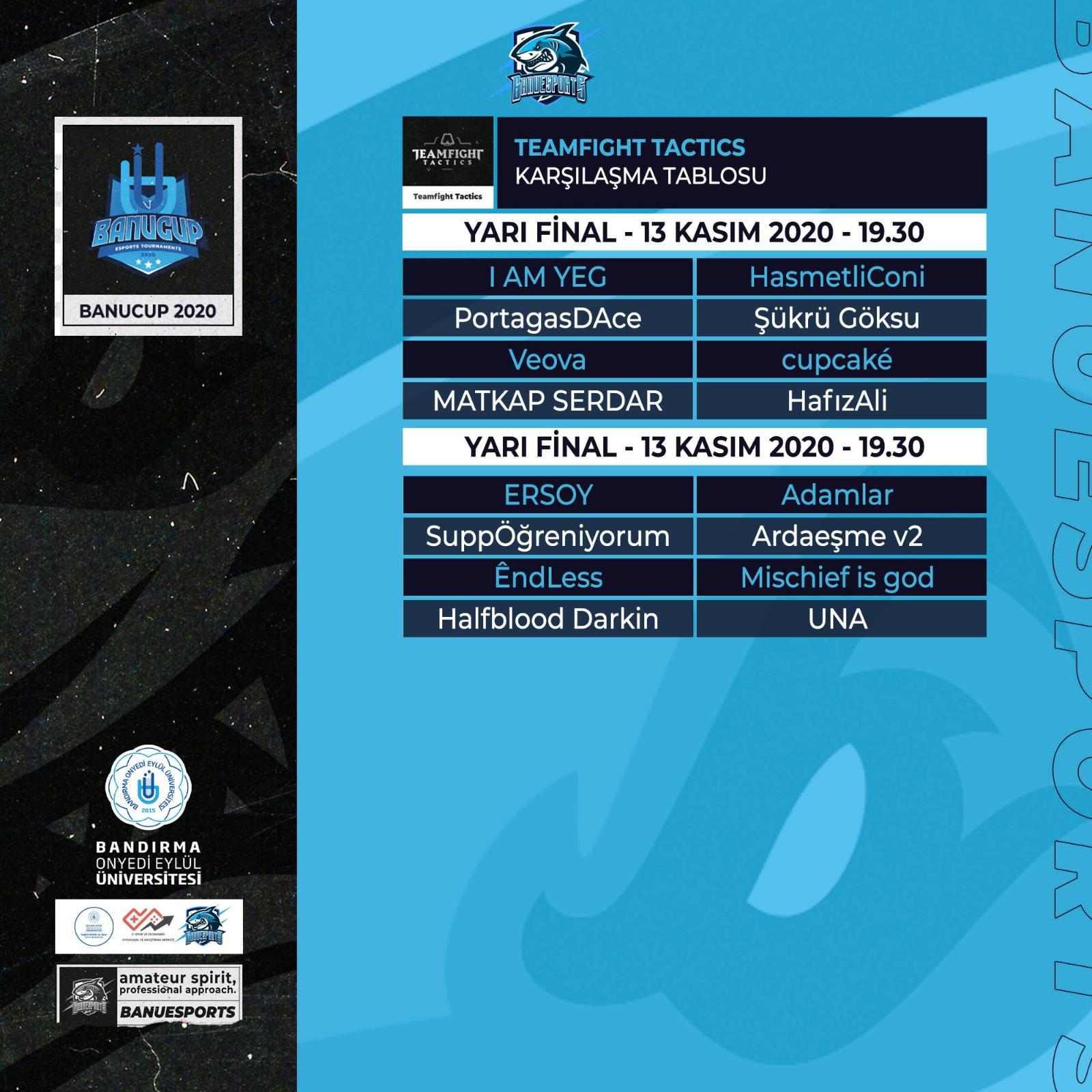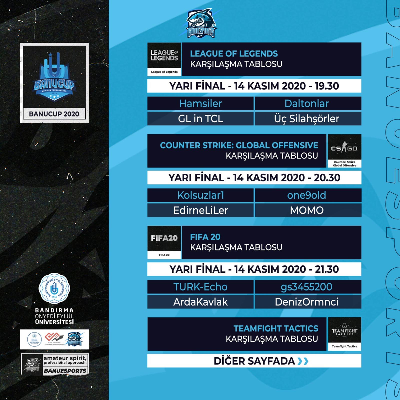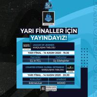 Birinci ve ikinci turları başarıyla tamamlayan ve bir üst tur için adını yazdırmayı başaran takım ve oyuncular, 14 Kasım Cumartesi günü, bugün saat 19.30’dan itibaren yarı final karşılaşmalarında mücadele etmeye başlayacak. League of Legends ve Counter Strike: Global Offensive yarı final karşılaşmaları Talking Esports (https://www.youtube.com/channel/UCEvmdZFAFITod13zUwH8Olg ) YouTube adresi üzerinden canlı olarak yayınlanacaktır.