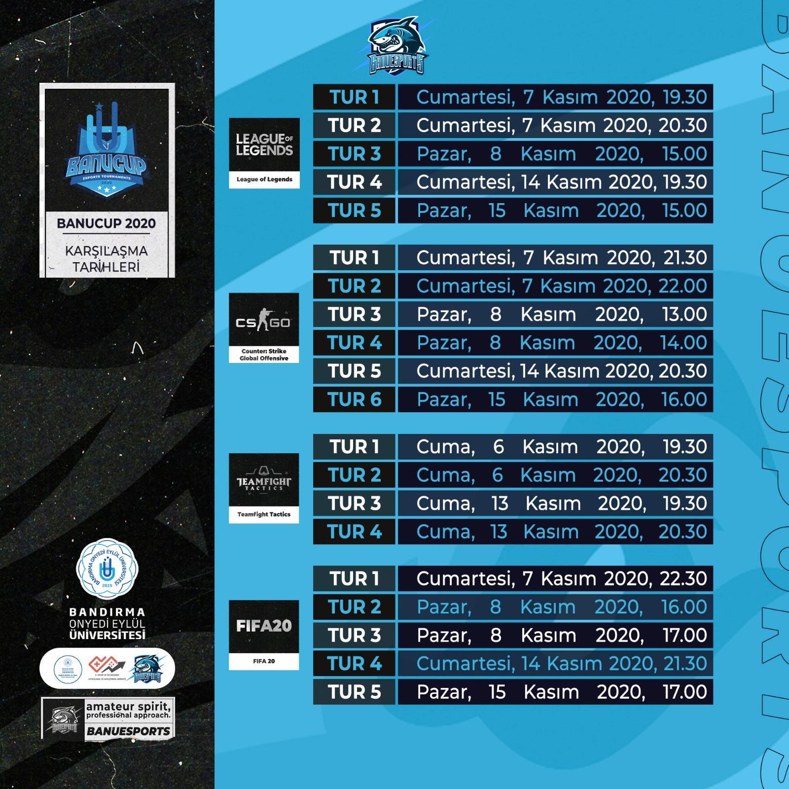 Farklı oyun karşılaşmaları ile uzun süredir birlikte olamayan Espor tutkunu öğrencilerimizi bir araya getirmeyi ve dostça rekabetin ardından ödüllendirmeyi amaçlayan BANUCUP 2020’nin, League of Legends 3V3, Counter Strike: Global Offensive 2V2, Teamfight Tactics ve FIFA 20 oyunlarının ilk ve ikinci tur karşılaşmaları geçtiğimiz günlerde tamamlandı.