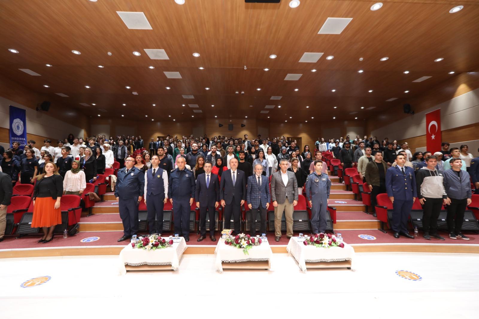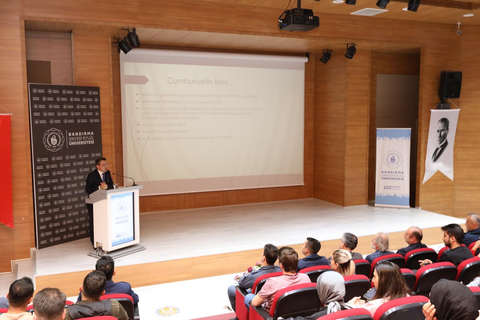 Cumhuriyet’in kuruluş aşamalarının detaylı bir şekilde dinleyicilere sunulduğu konferansa Rektörümüz Prof. Dr. Süleyman Özdemir de katıldı. Programa Rektör Yardımcımız Prof. Dr. Feyzullah Temurtaş, İnsan ve Toplum Bilimleri Fakültesi Dekanımız Prof. Dr. Zekai Mete, öğretim üyelerimiz, öğrencilerimiz ve konuklar katıldı.