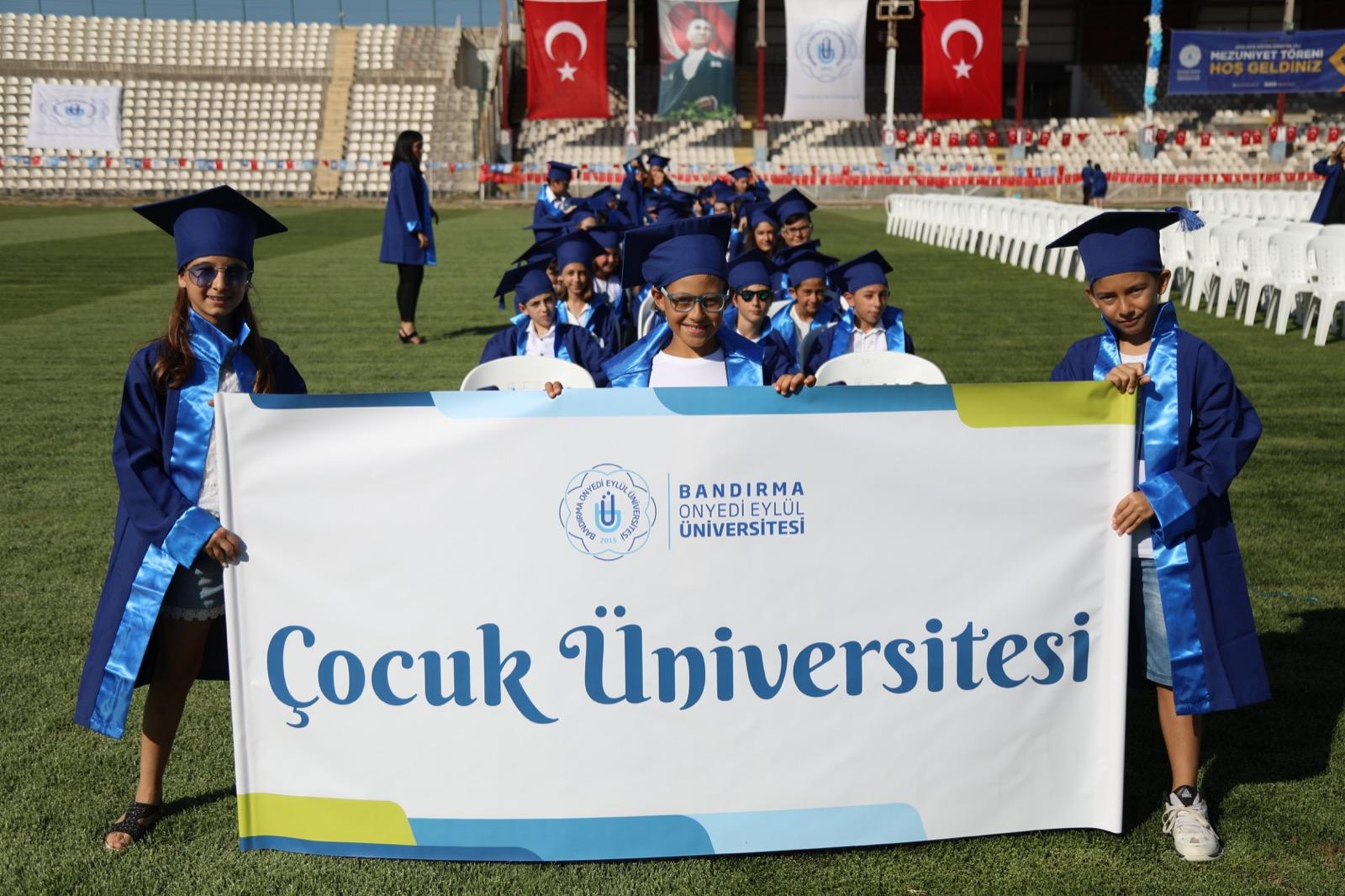 Protokol konuşmaları sonrasında üniversitemiz Çocuk Eğitimi Uygulama Ve Araştırma Merkezimizin (BANÜ-Çocuk Üniversitesi) ilk ve üniversitemizin en genç mezunları olan Çocuk Üniversitesi Yaz Okulumuzu başarıyla tamamlayan öğrencilerimizin mezuniyet töreni gerçekleşti. Sembolik olarak altı öğrencimize Rektörümüz Prof. Dr. Süleyman Özdemir’in Mezuniyet Belgesi takdim etmesi ve Çocuk Üniversitesi’nde görev yapan akademisyen ve eğitmenlerle günün anısına toplu hatıra fotoğraf çekimi sonrasında yüz elli mezun öğrencimizin kep atmalarının ardından Çocuk Üniversitesi Yaz Okulu mezuniyet töreni bölümü sona ermiş oldu.