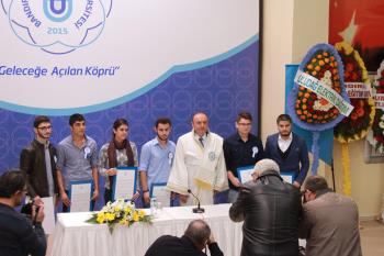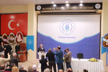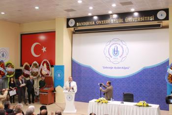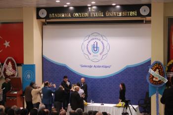 Açılış konuşmalarının ardından fakültelerini derece ile kazanan öğrencilere tebrik beratları Bandırma Onyedi Eylül Üniversitesi Rektörü Prof. Dr. Süleyman Özdemir tarafından verildi.