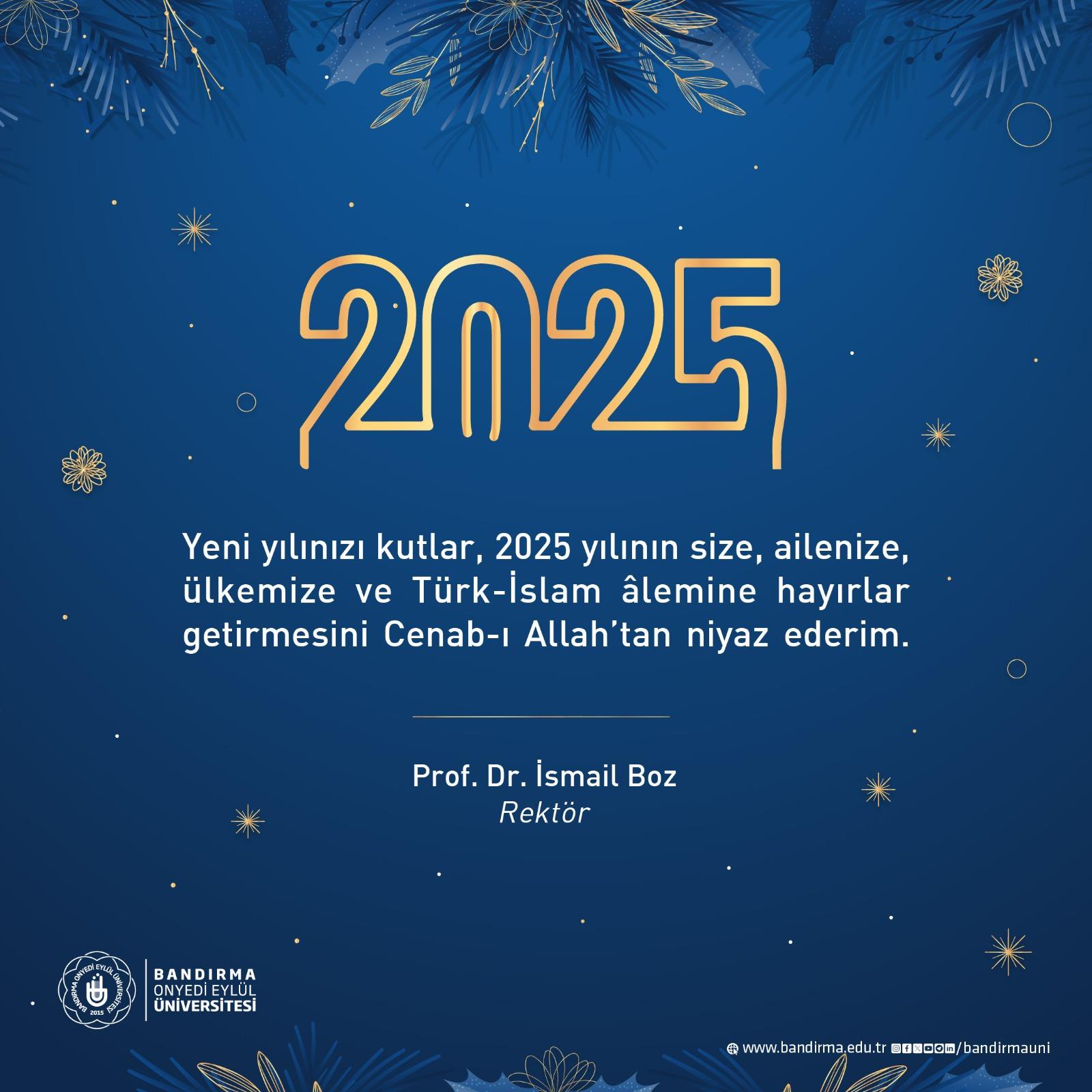 Bu duygu ve düşüncelerle 2025 yılının, tüm Dünya coğrafyasında savaşların, acıların, zulümlerin ve tüm insan hakları ihlallerinin bittiği; yerine barışın, huzurun, kardeşliğin, toplumsal birlik ve beraberlik ruhunun hâkim olduğu güzel bir yıl olmasını temenni ediyor, Bandırma Onyedi Eylül Üniversitesi Ailesinin ve tüm milletimizin yeni yılını en içten dileklerimle kutluyorum.
