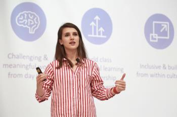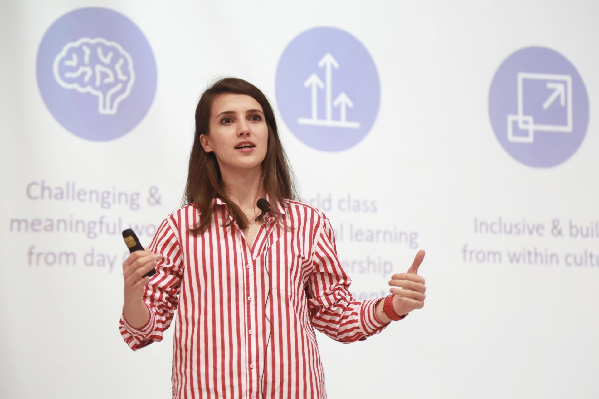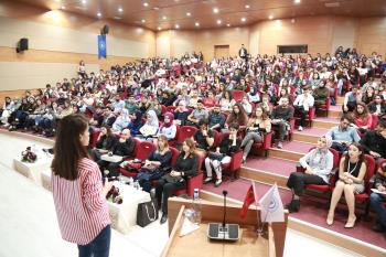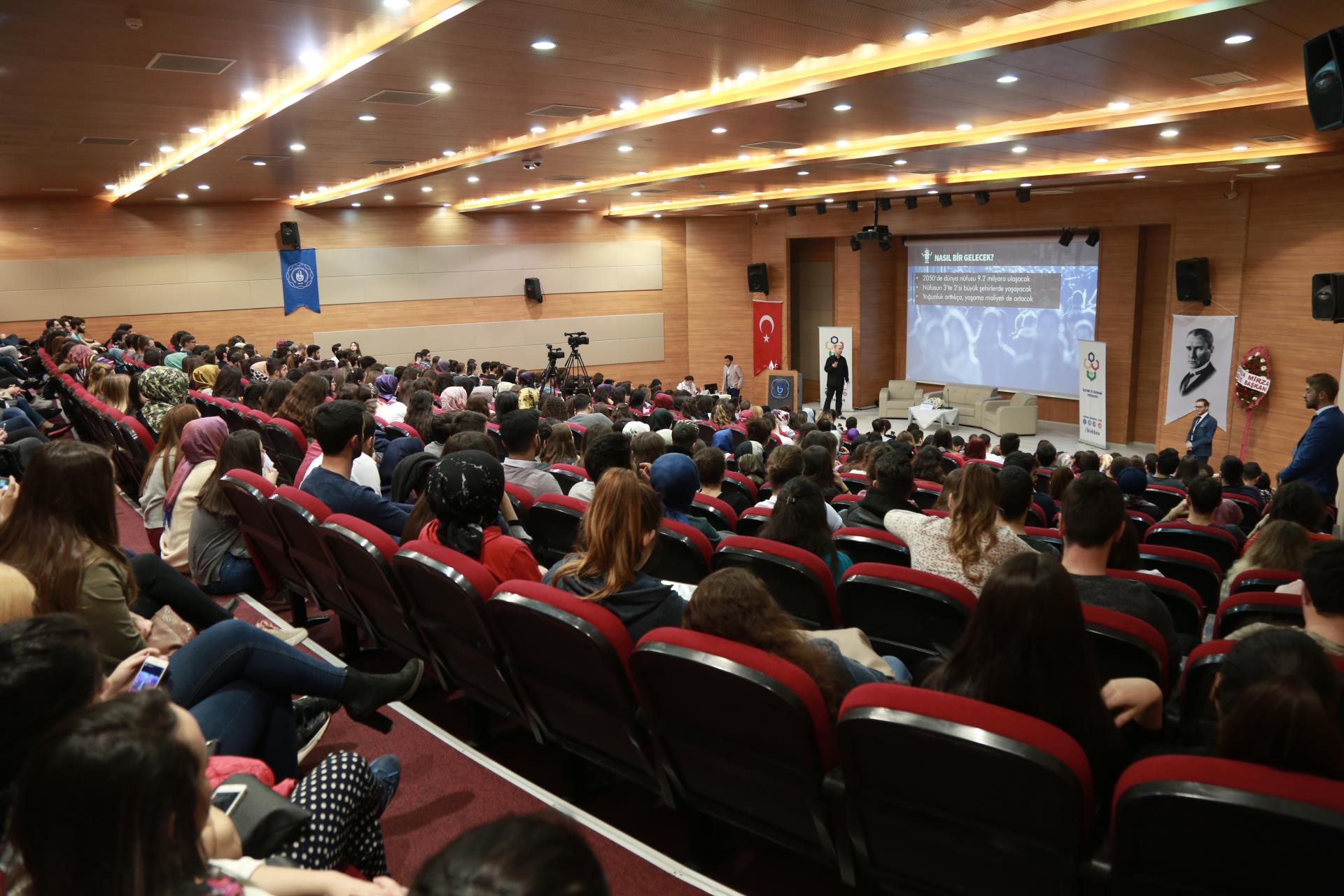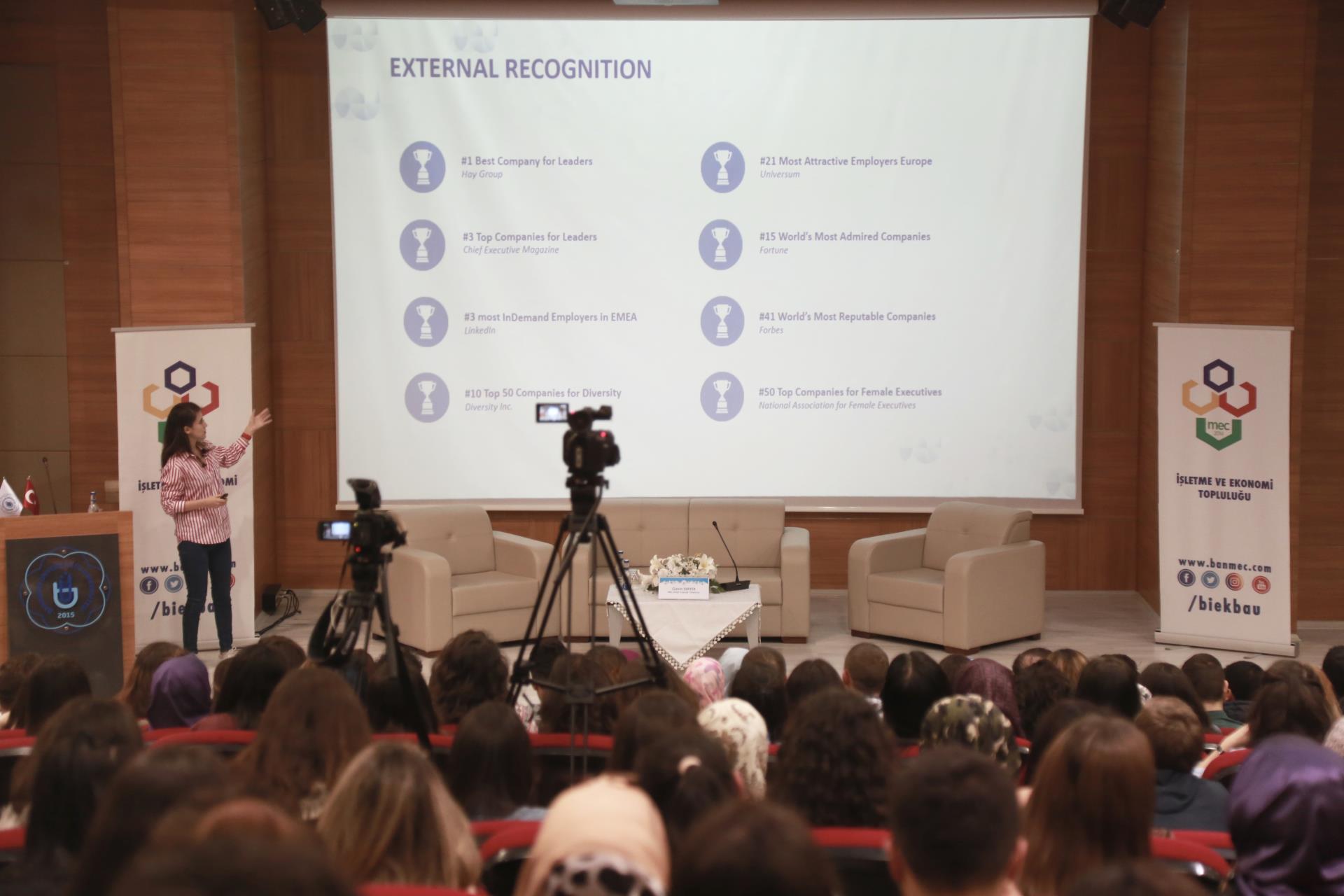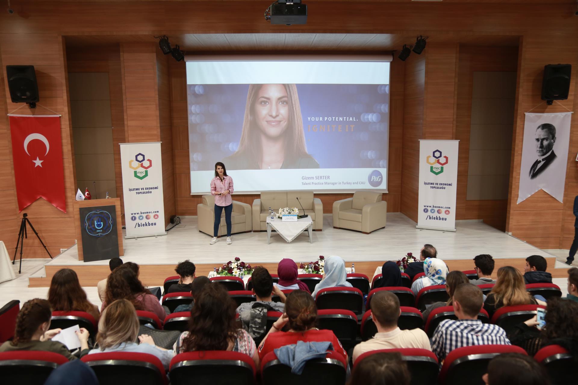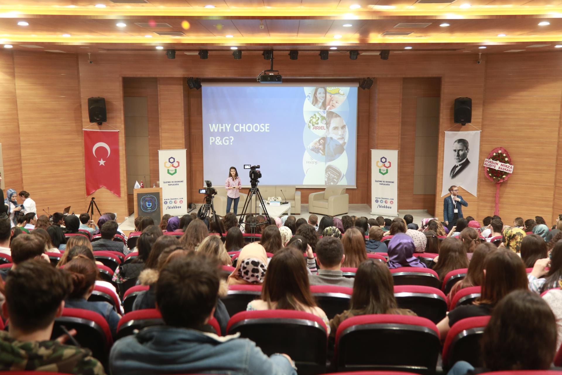 Sağlık Kültür Spor Daire Başkanımız Mehmet Karatepe’nin plaket takdimi ile devam eden programın ikinci oturumda Onat sözü P&G Ortak Yetenek Yöneticisi Gizem Serter’e bıraktı. Orta Doğu Teknik Üniversitesi (ODTÜ) Siyaset Bilimi ve Kamu Yönetimi bölümünden mezun olduktan 3 gün sonra işe başlayan konuşmacımız, hızlı tüketimde ve özel sektörde P&G’nin konumundan bahsetti. 55000’in üzerinde patente sahip P&G’de Endüstri 4.0 doğrultusunda robotlar ve 3D yazıcılar da kullanılıyor. Serter, “ Ne istediğinizi bulun. Kariyeri belirlemenin en önemli noktası staj yapmaktır, önünüze çıkan fırsatlarını değerlendirmeye çalışın. Yeni deneyimlere açık olun, esnek olmak, deneyimin ve yeniliğin öncüsü olmak önemlidir. Sabırlı olun, hata yaptığınızda geriye dönüp bakın ve tekrar harekete geçin.’’ tavsiyelerinde bulundu.