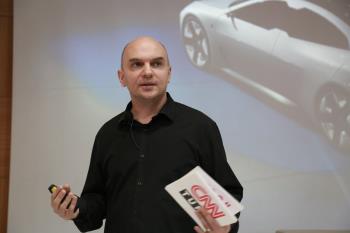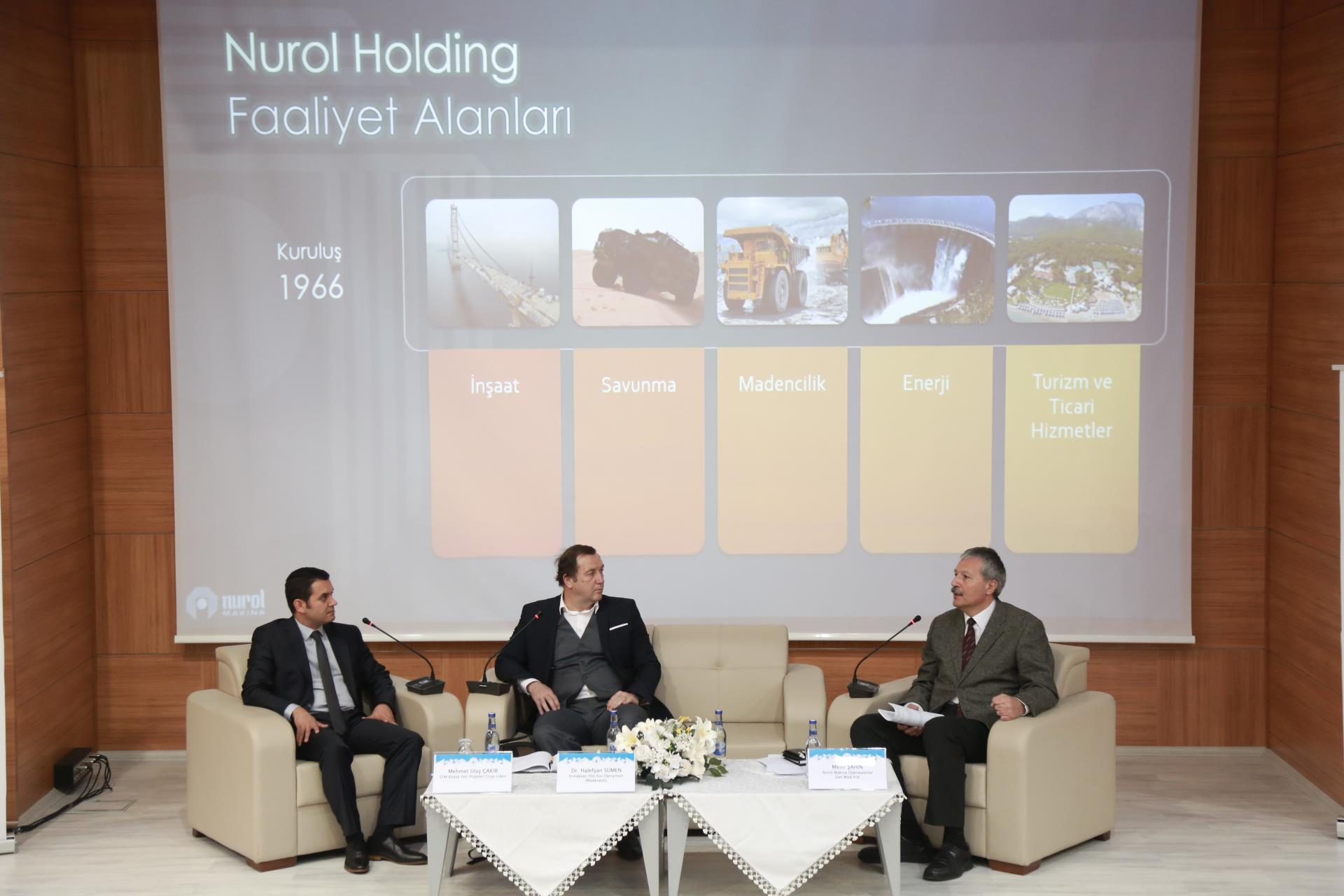 Şahin, Nurol Makina ürünlerini tanıtan bir video ile sunumuna başladı. Devamında Nurol Makina’nın faaliyet alanlarından ve ürünlerinden bahseden Şahin endüstri 4.0 uygulamalarının temelindeki arttırılmış gerçeklik, büyük veri, otonom/robotik sistemler, sistem entegrasyonunun önemine değindi. Son olarak stajyer ve eleman alımlarında aradıkları özellikler ile başvuru adreslerini belirttikten sonra soruları yanıtladı ve sözü Mehmet Ulaş Çakır’a bıraktı.