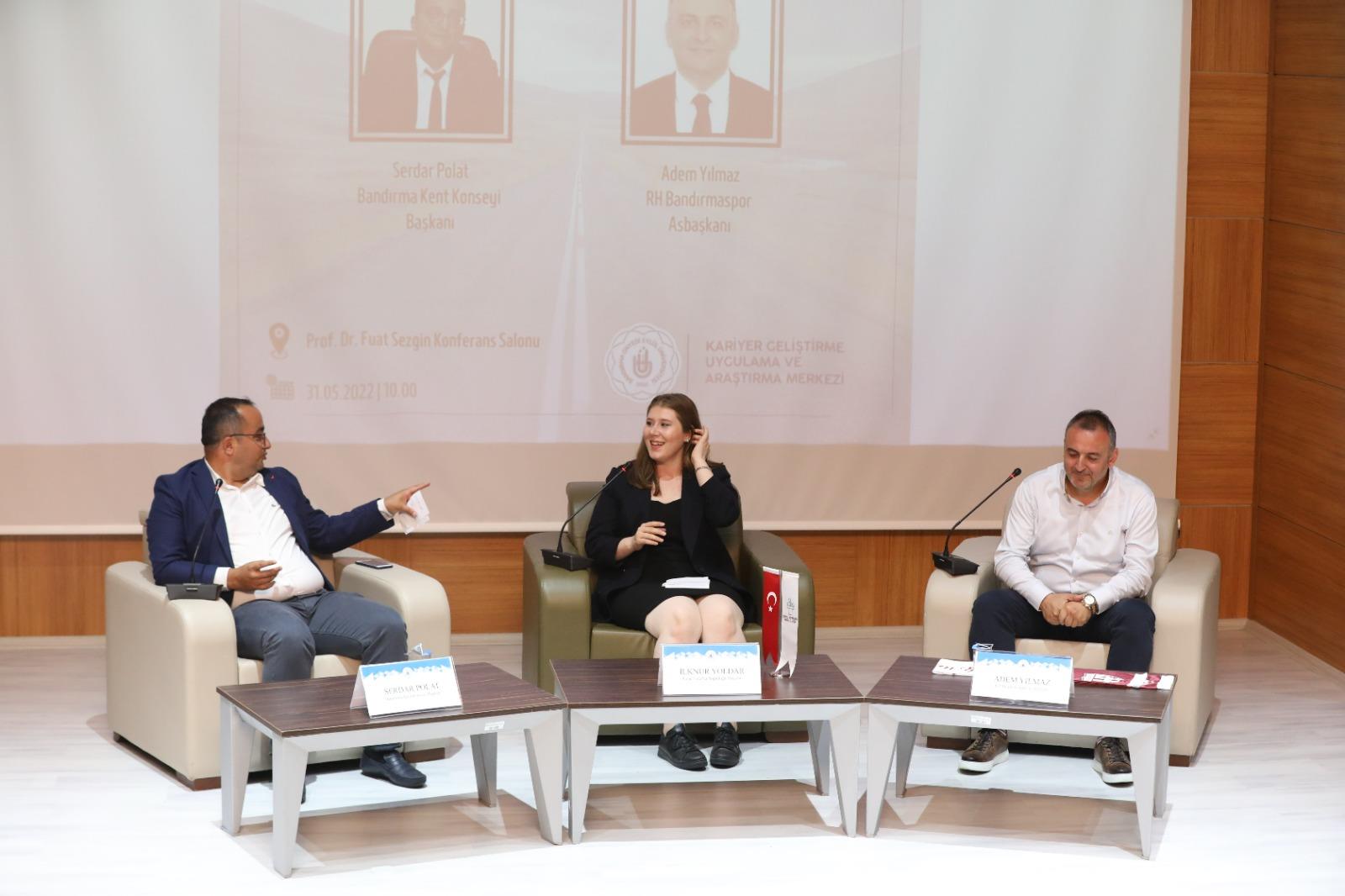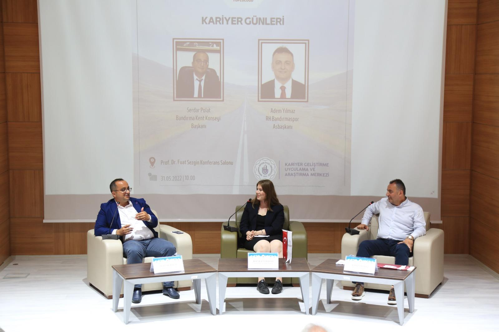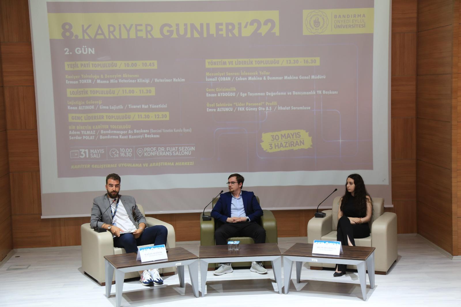 8. Kariyer Günleri etkinliğinin ikinci gününün öğleden sonraki oturumları ise Genç Liderler Topluğu ile Yönetim ve Liderlik Topluluğu’nun düzenlendiği etkinliklerle devam etti. Bu oturuma BANSİAD Yönetim Kurulu Üyesi ve Bandırmaspor Asbaşkanı Adem Yılmaz ile Bandırma Kent Konseyi Başkanı Serdar Polat konuşmalarını gerçekleştirdi. Demmar Makine Genel Müdürü İsmail Çoban’ın, Ege Taşınmaz Değerleme ve Danışmanlık Yönetim Kurulu Başkanı Ercan Aydoğdu’un ve FKK Güney Oto İthalat Sorumlusu Emre Altuncu’nun katıldığı Yönetim ve Liderlik Topluluğu’nun organize ettiği oturumda profesyonellerin kariyer deneyimleri aktarıldı. Mezuniyet sonrasında izlenecek yollar ve genç girişimciler için önemli bilgilerin yer verildiği sunumlarda çalışma piyasasında ihtiyaç duyulan personellerin özellikleri ve işverenlerin işe alım süreçlerine önem verdikleri hususular ifade edildi.
