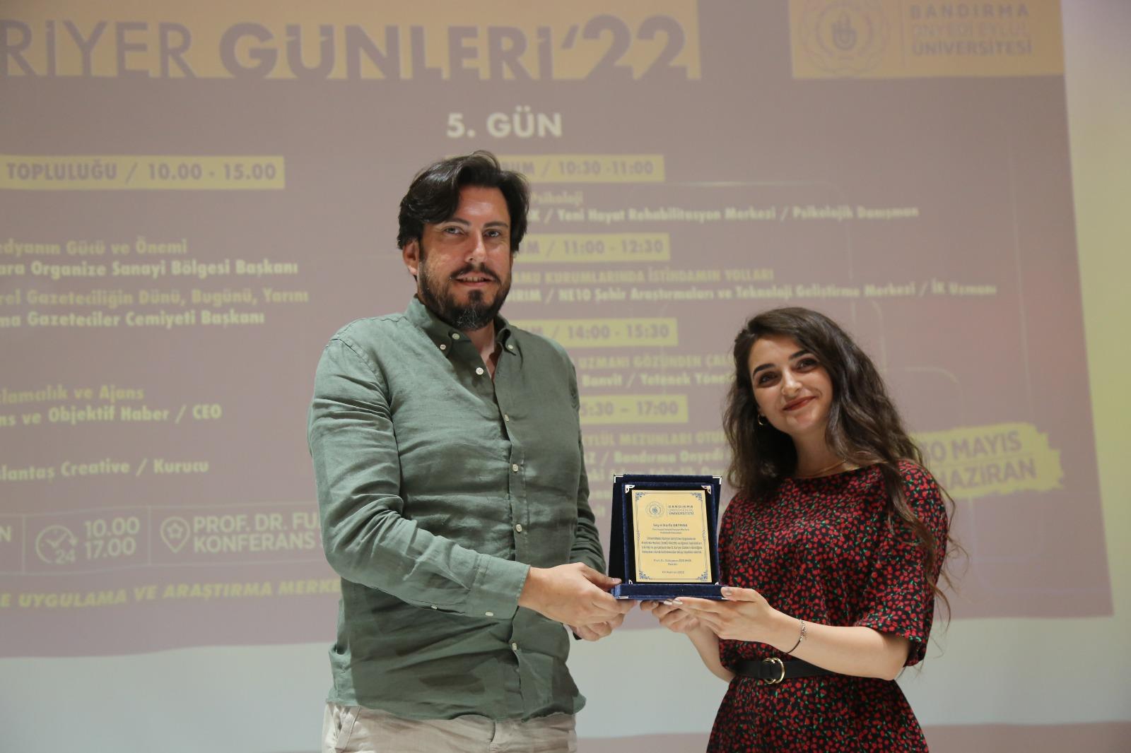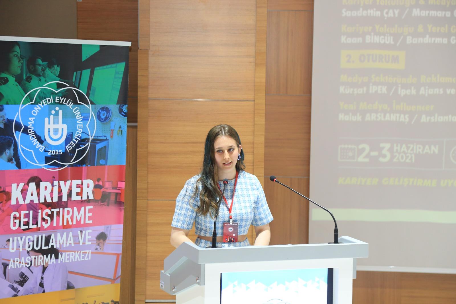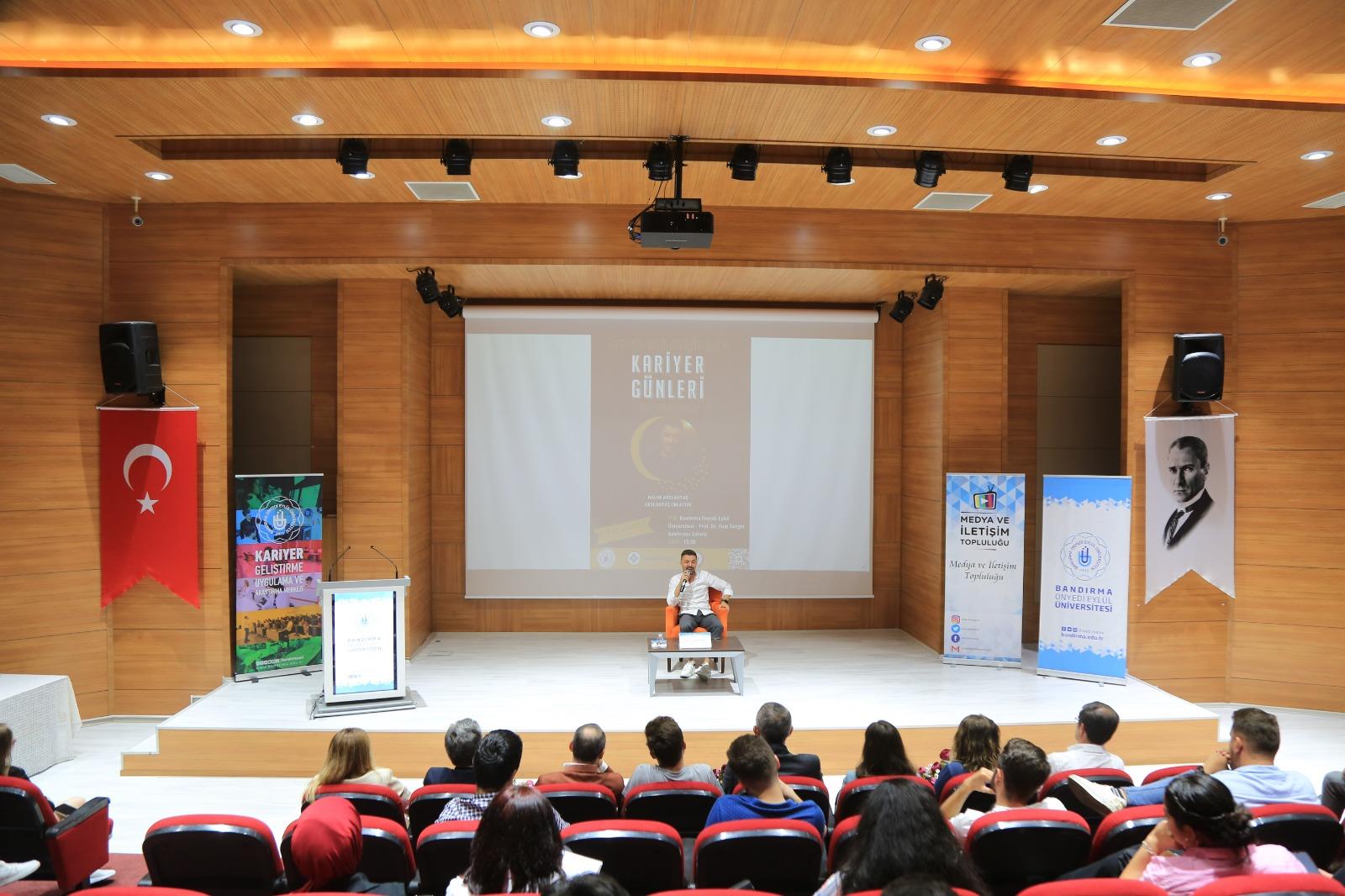 8. Kariyer Günleri etkinliğinin dördüncü gününde ise Ömer Seyfettin Uygulamalı Bilimler Fakültesi bölümlerinde öğrenim gören öğrencilerin kurdukları topluluklar çeşitli oturumlar gerçekleştirdi. Bu kapsamda Medya ve İletişim Topluluğu, “Medyanın Gücü ve Önemi” başlıklı sunuma Eski Başbakanlık Basın Müşaviri ve Bandırma Organize Sanayi Bölgesi Başkanı Saadettin Çay’ı konuk etti. Saadettin Çay, Medya ve İletişimin dünü ve bugününü ele alarak yarınlarda olacağı yere ilişkin sunumlarını gerçekleştirerek öğrenci ve mezunların nasıl bir yetkinliğe sahip olmaları gerektiğini tecrübelerinden bir takım kesitlerle vurguladı. Akabinde değişen ve dönüşen medya ve iletişim sektörüne dikkat çekmek ve bu alandaki izlenimlerin aktarılmasını sağlamak maksadıyla “Yeni Medya ve Influencer” konulu bir oturum gerçekleştirildi. Oturuma konuk olan Haluk Arslantaş, yeni medyanın dinamiklerini ve bu alandaki çalışma koşuları, çalışma şekilleri ve istihdam edilen kişilerden aranan özelliklere dair önemli açıklamalarda bulunuldu.