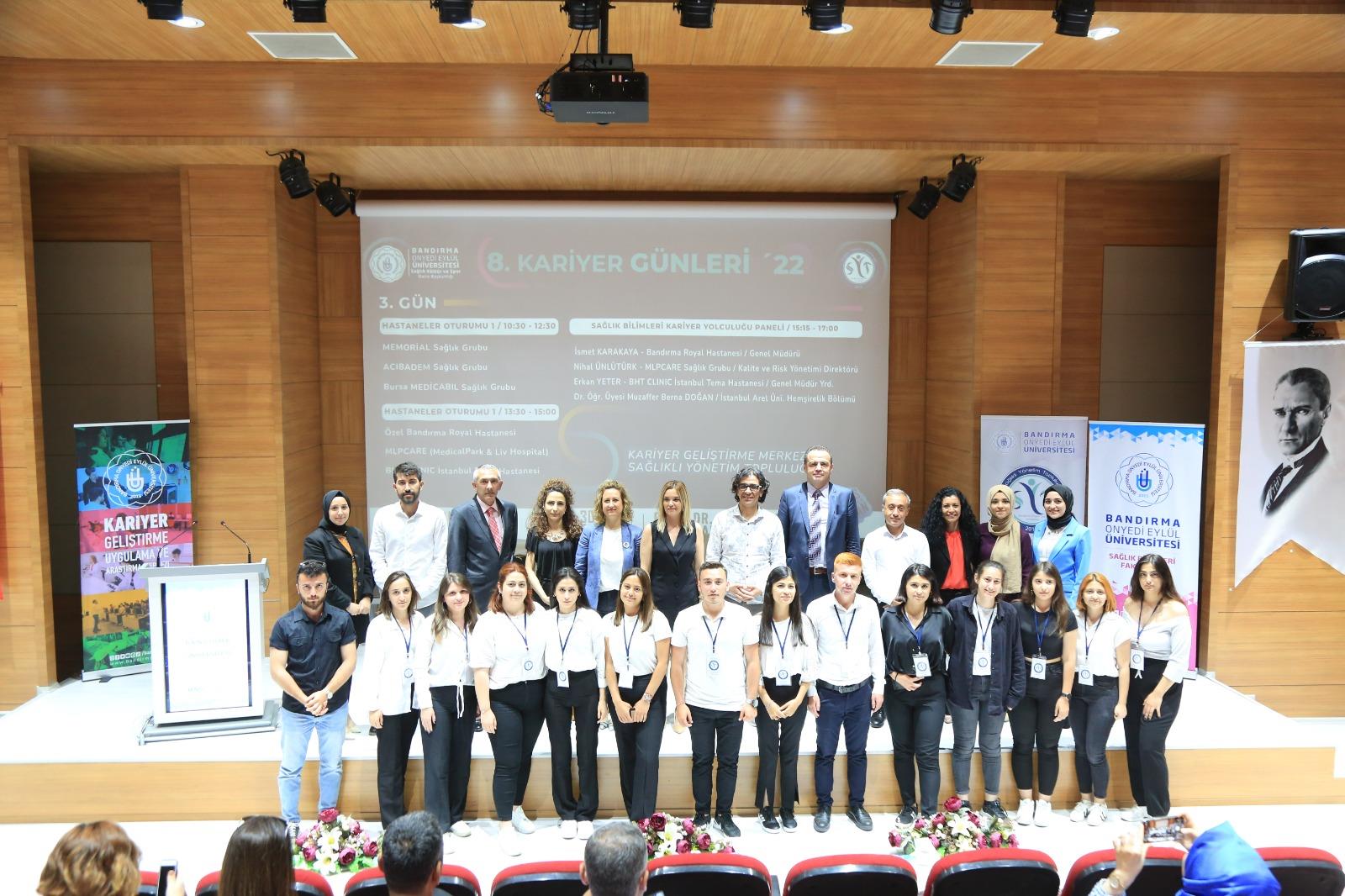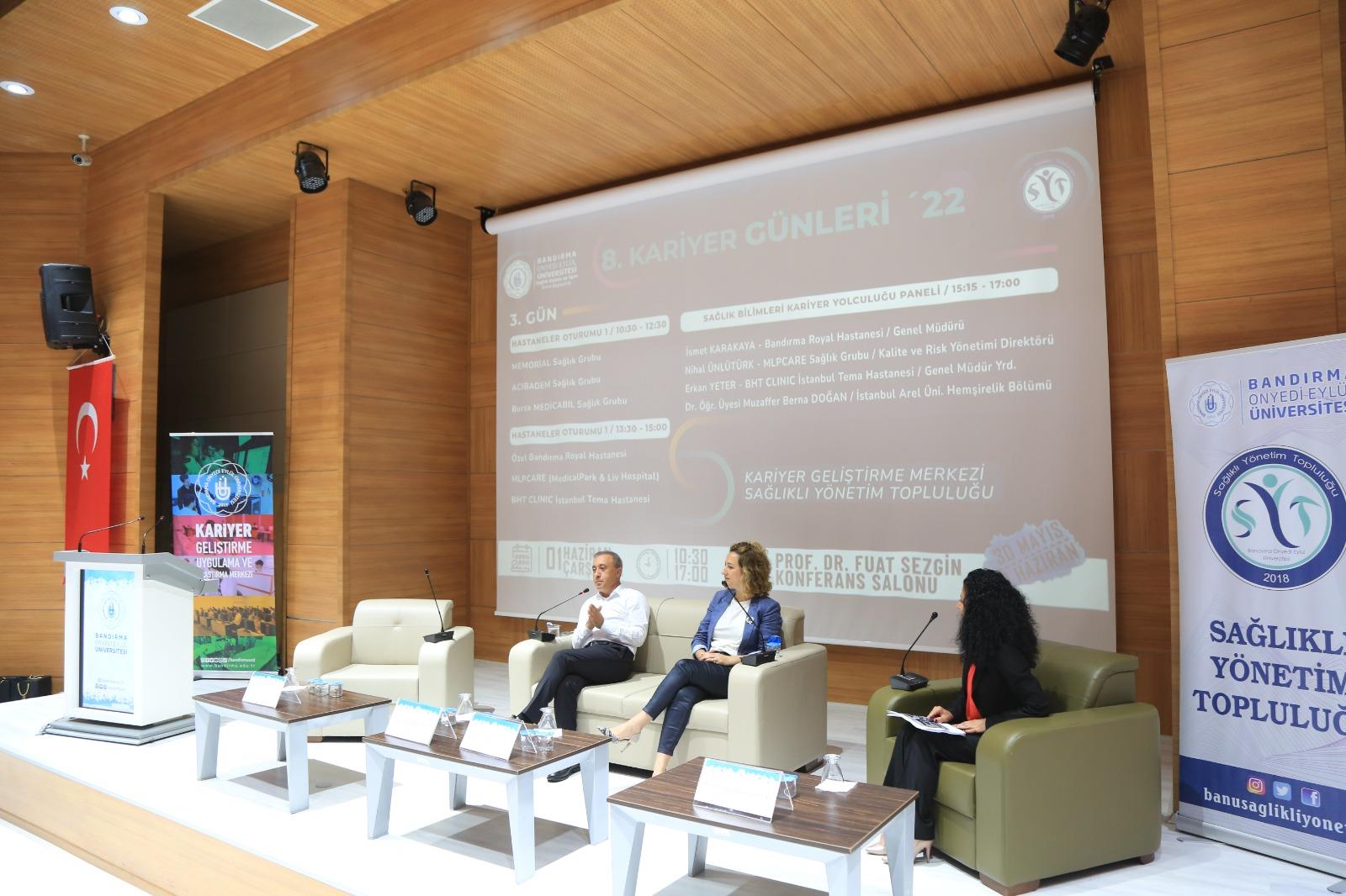 8. Kariyer Günleri etkinliğinin üçüncü günü Sağlık Bilimleri Fakültesi öğrenci toplulukları iş birliğinde icra edildi. Bu kapsamda yerel ve ulusal pek çok hastanesinin katılım sağladığı “Hastaneler Oturumu” gerçekleştirildi. Hastaneler Oturumunda hastane temsilcileri kurumlarının tanıtımını yaparak ihtiyaç duydukları personellere ilişkin bilgiler paylaştı. Akabinde Sağlık Sektörünün geleceğinin bu alana ilişkin yapılan insanı yatırımların ele alındığı panel gerçekleştirildi. Panele Bandırma Royal Hastanesi Genel Müdürü İsmet Karakaya, MLPCARE Sağlık Grubu Kalite ve Risk Yönetimi Direktörü Nihal Ünlütürk, BHT Klinik İstanbul Tema Hastanesi Genel Müdür Yardımcısı Erkan Yeter ve İstanbul Arel Üniversitesi Öğretim Üyesi Muzaffer Berna Doğan katılım sağlayarak Sağlık Bilimleri Fakültesi öğrencilerinin kariyer planlamasında dikkat etmeleri gereken noktalara ilişkin değerlendirmelerde bulundular.