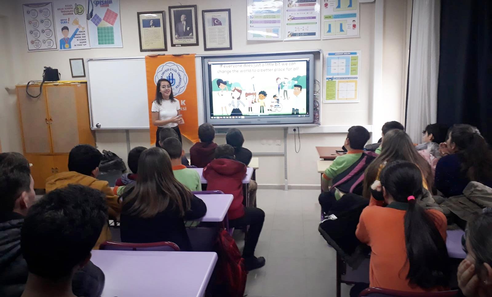 Eğitimlerin bir bölümü, Herkes İçin Sağlık Topluluğu’muzun üyeleri ve öğrencilerimiz Huriye Aydın, Kadir Suna ve Melahat Gerentepe’nin hemşirelik mesleğinin tanıtımı, sağlıklı yaşam, hastalıklardan korunma ve bazı temel sağlık uygulamalarından oluştu. Eğitimlerin diğer bölümünde ise Global İlişkiler Topluluğu’muzun üyeleri ve öğrencilerimiz Hayriye Gülay, Dilan Büyükdeniz, Yeşim Kasar, Rümeysa Doğan ve Umutcan Kara tarafından video ve sunumlar eşliğinde sürdürülebilir kalkınma hedefleri, nitelikli eğitim, sürdürülebilir tüketim ve yenilikçilik gibi başlıklarda bilgilendirme yapıldı.