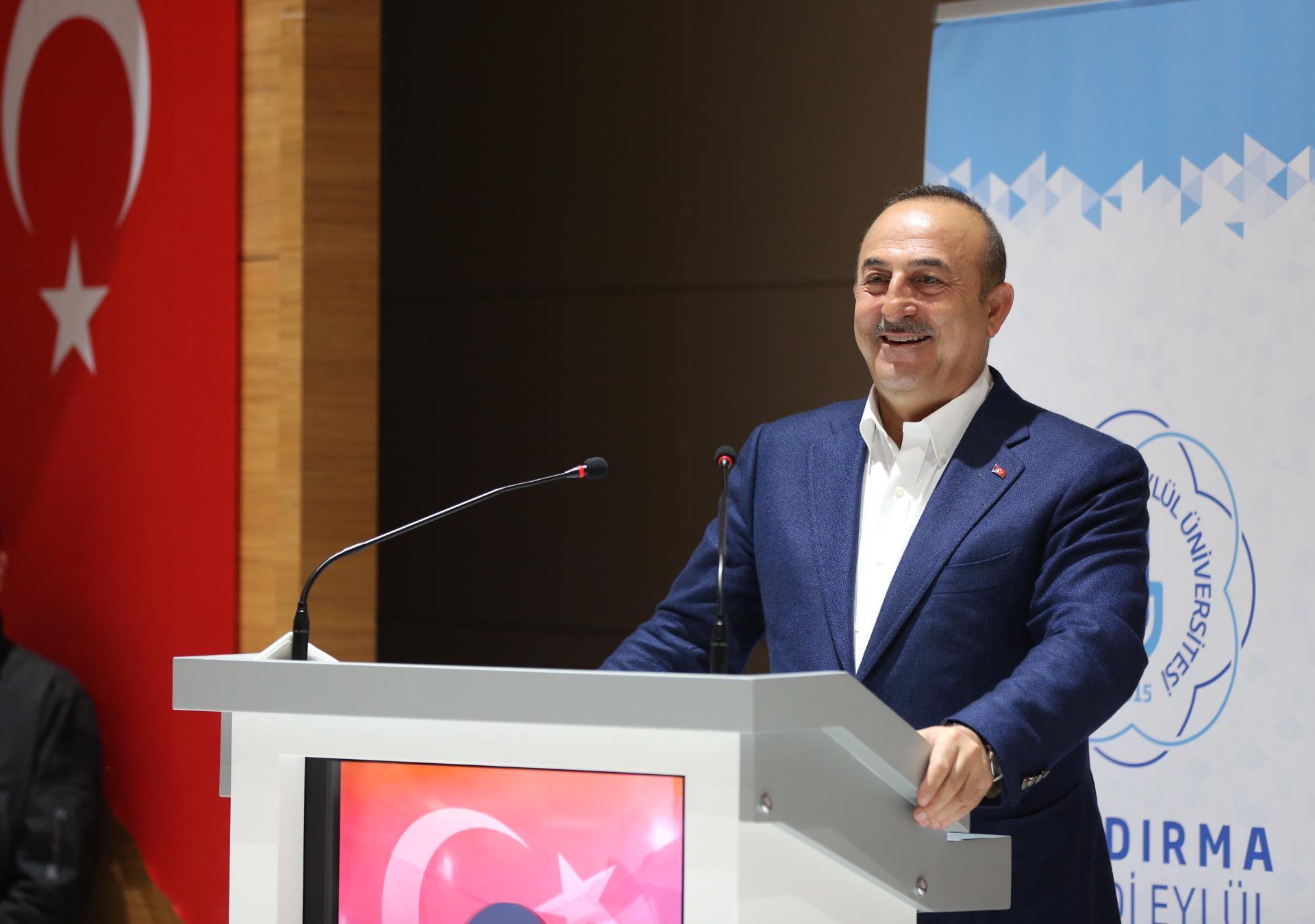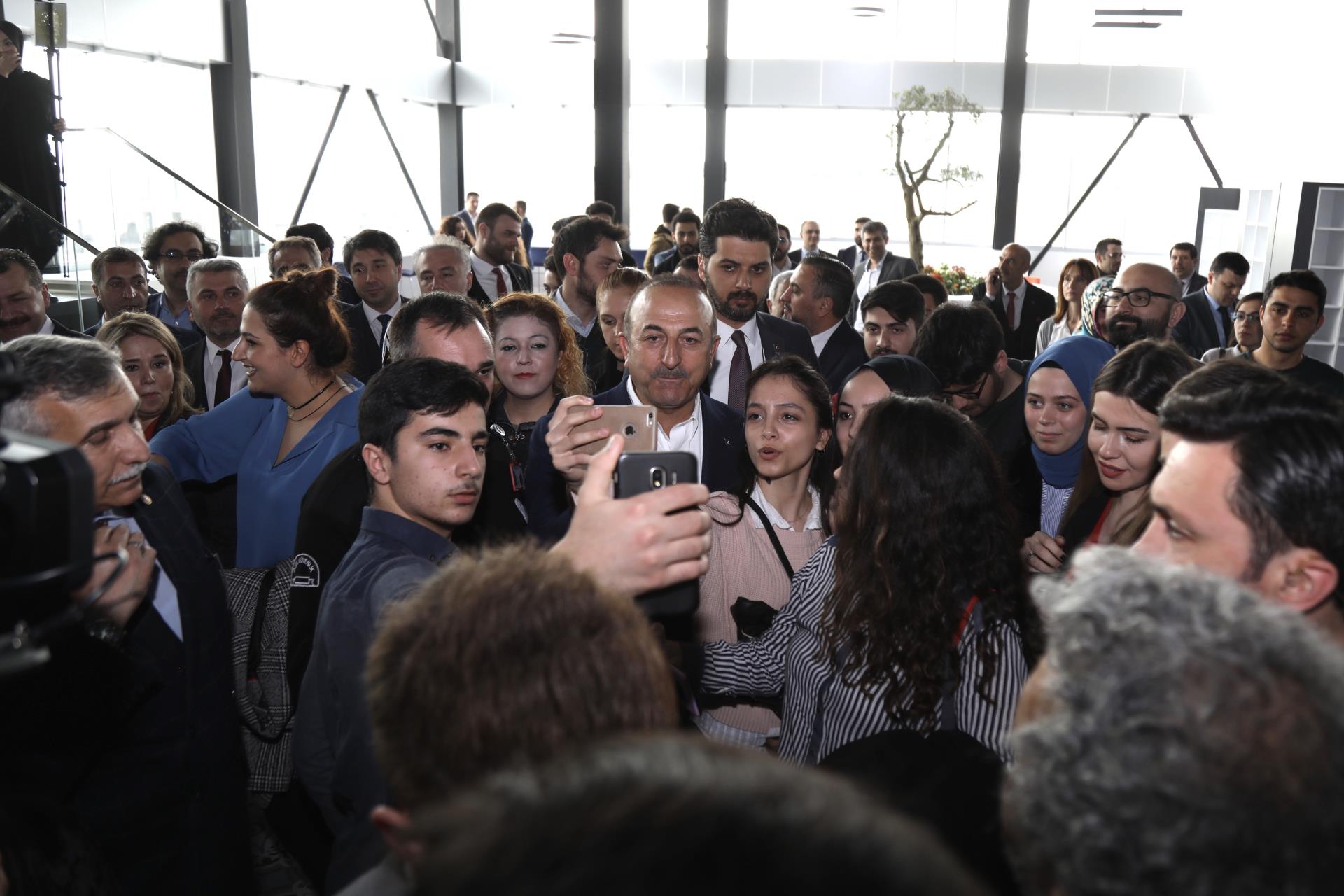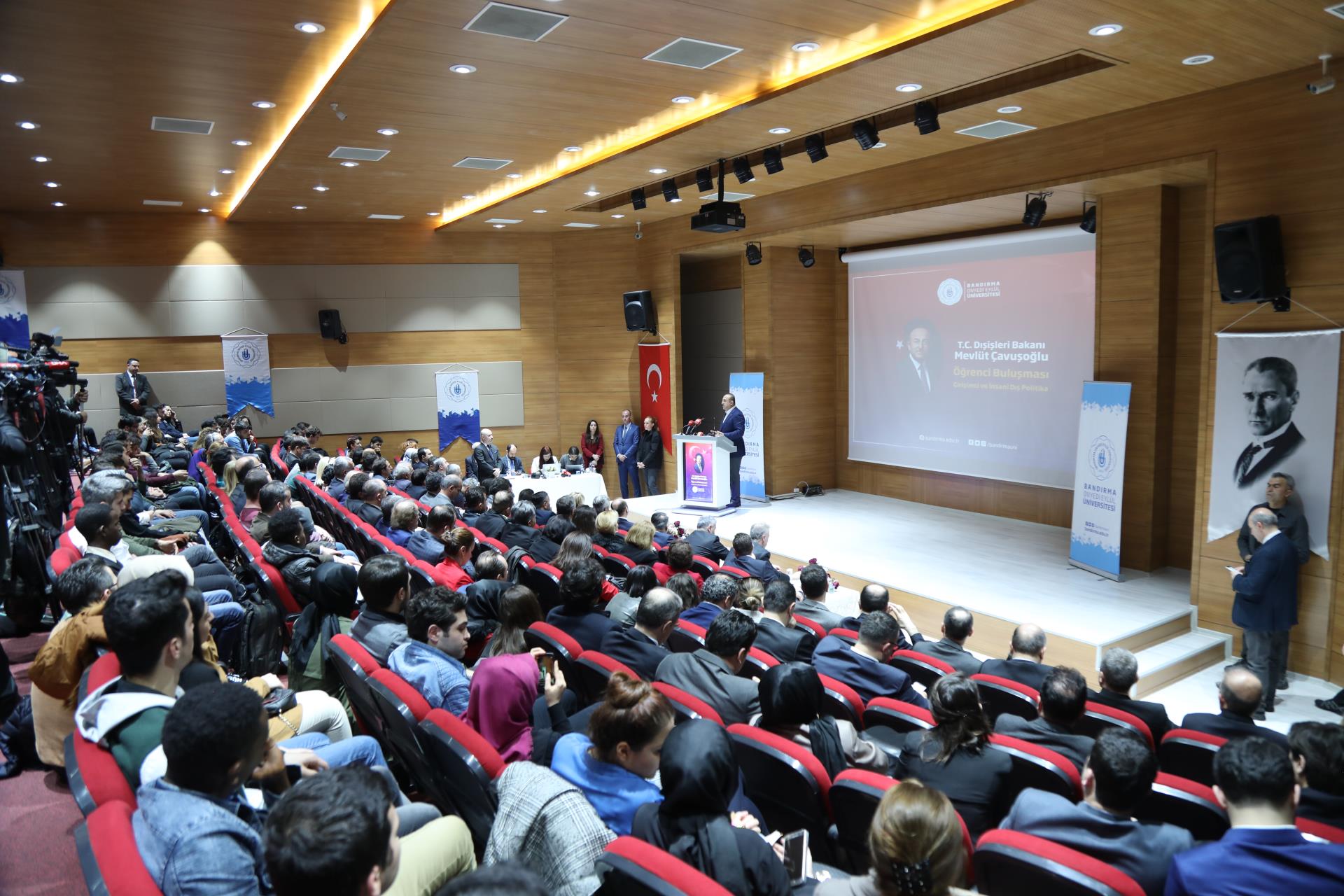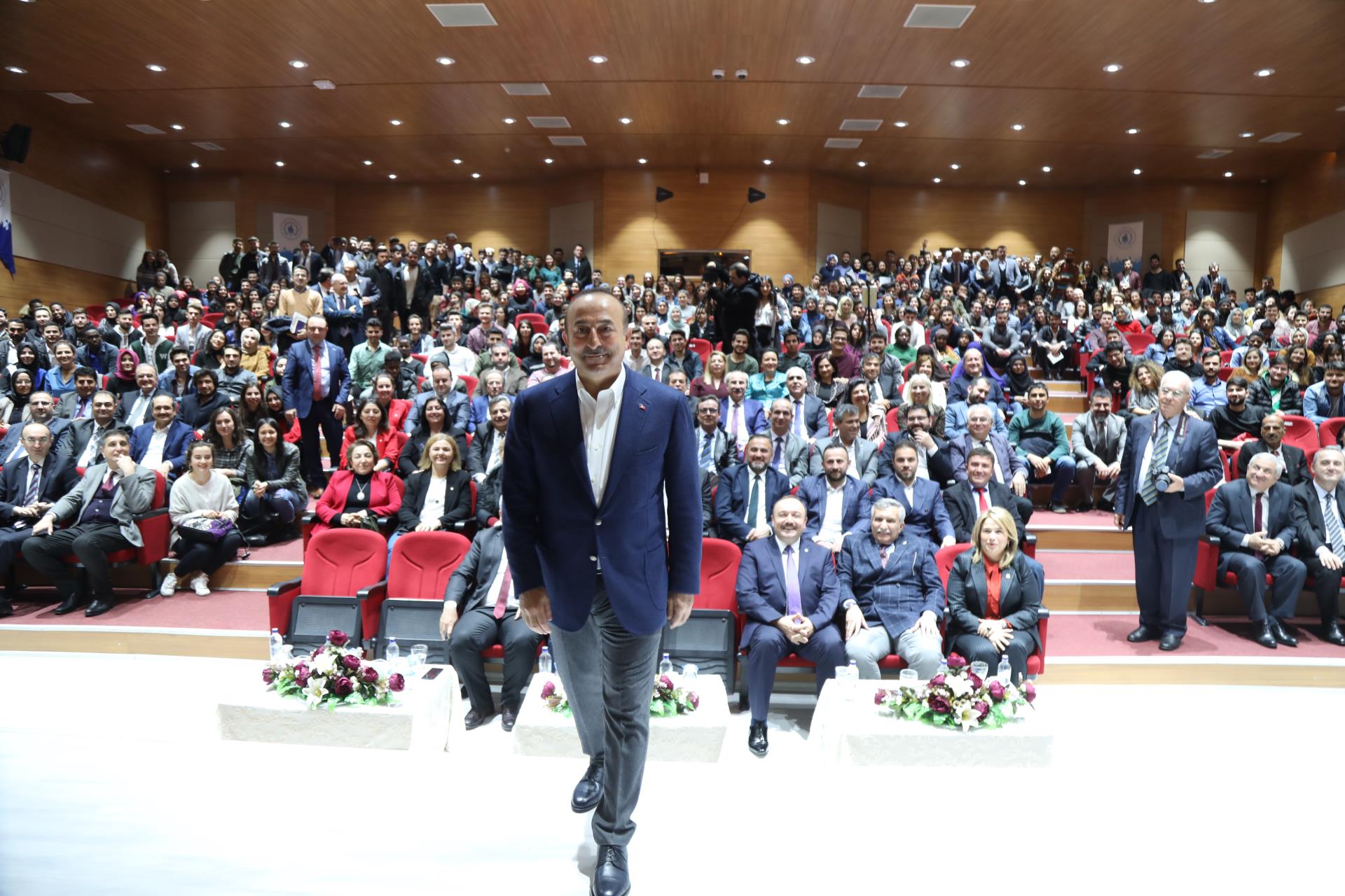 Çavuşoğlu, “Sonuç olarak dünya ilginç bir süreçten geçiyor. Tüm bunları iyi değerlendirirsek dış politikamız gerçekçi ve başarılı olur. Suriye ve Irak’ta yaşanan gelişmeleri görüyoruz. Yanı başımızda gerçekleşen bu krizleri fırsata çevirmemiz ülkemizin güvenliği, istikrarı ve ekonomisi bakımından oldukça önemlidir. Bu alanlarda da çalışmamızı sürdürüyoruz. Bu tarz fırsatları takip ederek değerlendirmemiz gerekiyor. Sonuç olarak dünya ilginç bir süreçten geçiyor. Tüm bunları iyi değerlendirirsek dış politikamız gerçekçi ve başarılı olur. Suriye ve Irak’ta yaşanan gelişmeleri görüyoruz. Yanı başımızda gerçekleşen bu krizleri fırsata çevirmemiz ülkemiz için güvenliği, istikrarı ve ekonomisi bakımından olmazsa olmazdır. Bu alanlarda da çalışmamızı sürdürüyoruz. Küresel sistem de zaman zaman yetersiz kalabiliyor. Küresel sistemin dizayn ettiği sözleşme ve konvansiyonlara taraf olmakla da ikili ilişkiler geliştirilemeyebiliyor. İşte gördüğünüz üzere Türk dış politikamızın sorumlulukları var. Siz öğrencilerin birçok ideali var. Bugün biz bu vizyonu ortaya koymaya çalışıyoruz ama sizin vizyonunuz bizimkilerden elbette ki daha büyük. Sizin idealleriniz, aşkınız, heyecanınız ve enerjinizle ben inanıyorum ki, ülkemiz de çok güçlü olacak, dış politikamız da. ” sözleriyle konuşmasını tamamladı.