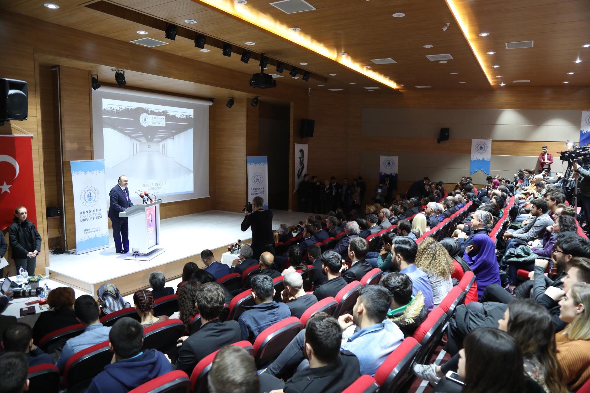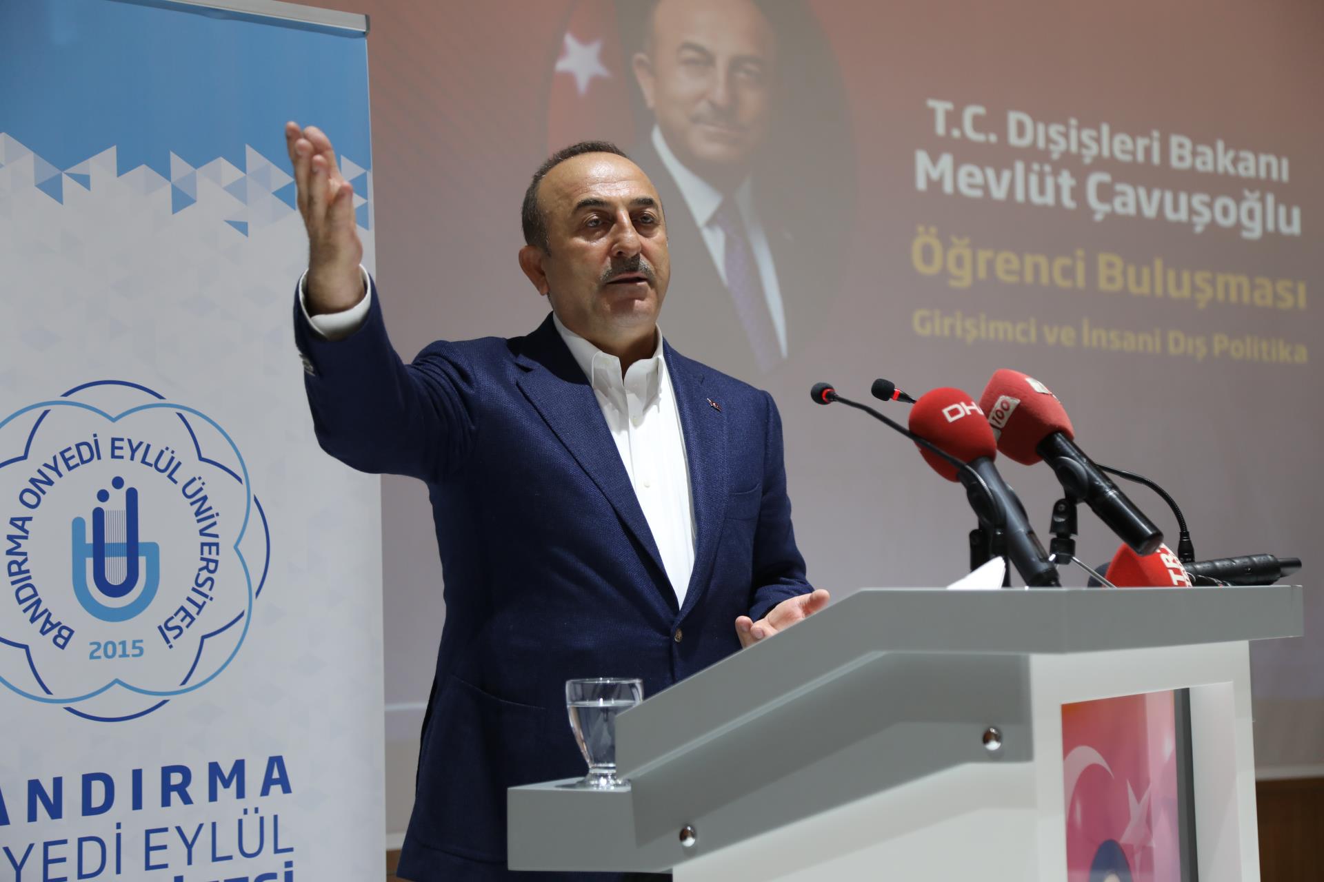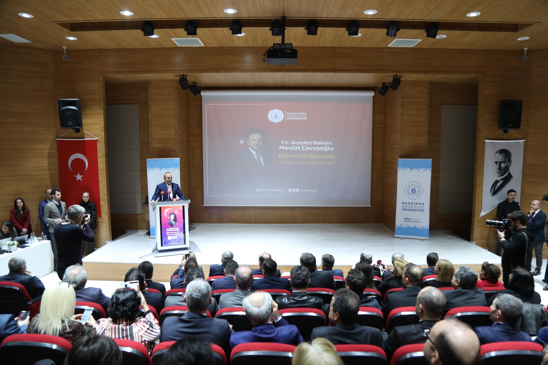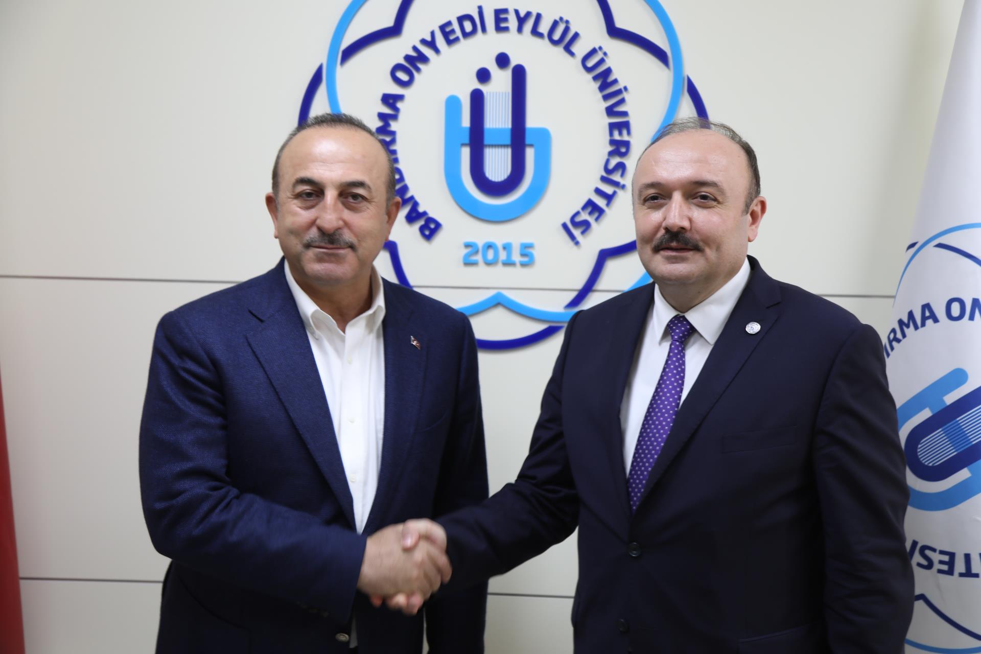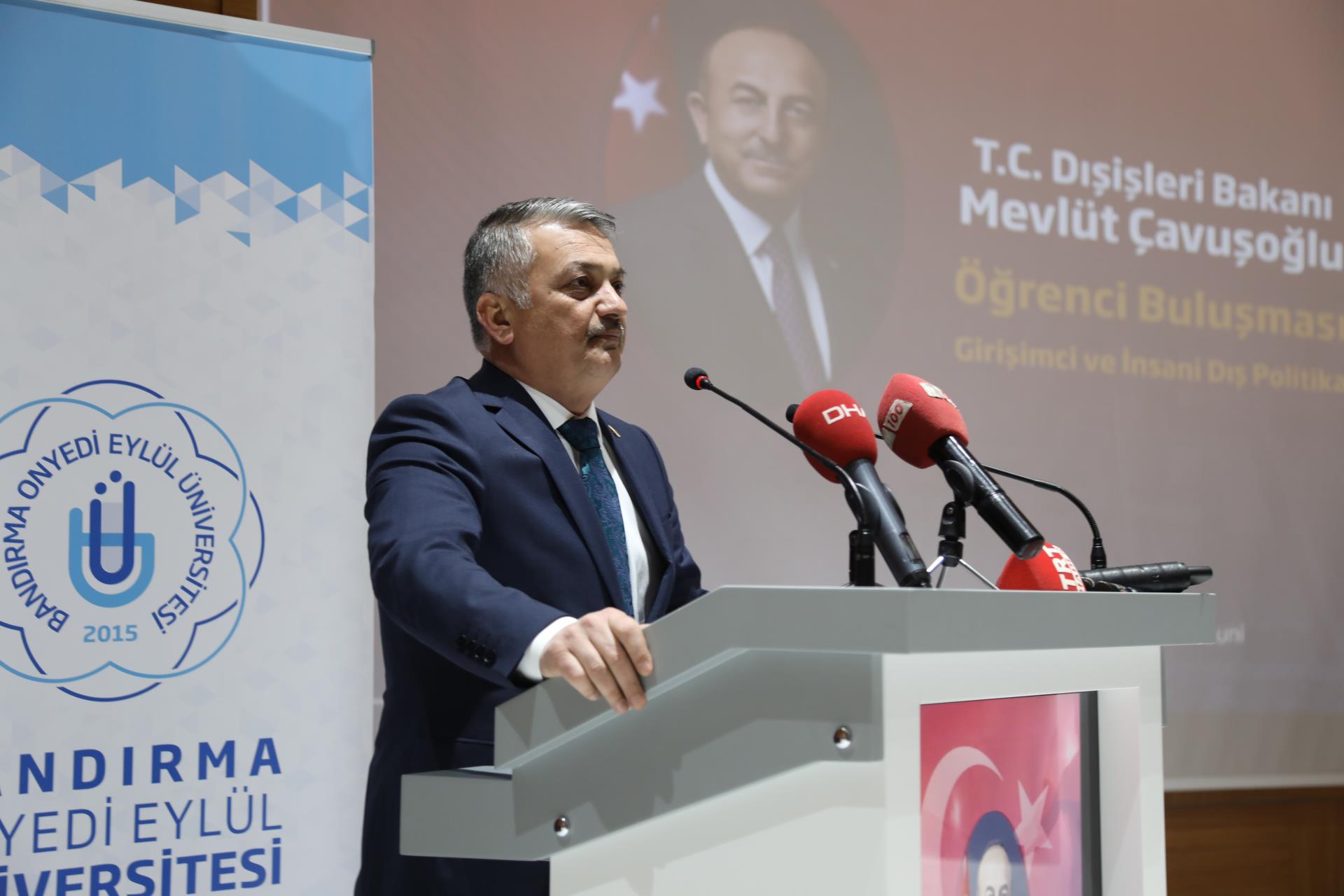 Balıkesir Valisi Ersin Yazıcı’dan sonra kürsüye teşrif eden Dışişleri Bakanımız Sayın Mevlüt Çavuşoğlu, “Bugün Bandırma Onyedi Eylül Üniversitesi’nde bulunmaktan memnuniyet duyuyorum. Saygıdeğer Rektörümüz Prof. Dr. Süleyman Özdemir’e ve Üniversite yönetimine bizleri davet ettiği için çok teşekkür ediyorum. Bandırma Onyedi Eylül Üniversitemizin kurulmasında naçizane biraz benim de emeğim bulunmaktadır. Bizler, üç ilçe Üniversitemizin kurulmasına öncülük ettik. Bunlardan biri Bandırma Onyedi Eylül Üniversitesi’dir. Diğerleri ise Alanya Alaattin Keykubat Üniversitesi ile İskenderun Teknik Üniversitesi. Dolayısıyla Üniversitemizin gelişmekte olduğunu ve eğitim kalitesinin arttığını görmekten ayrıca mutluluk duyuyorum ve ben inanıyorum ki, Bandırma Onyedi Eylül Üniversitemiz çok daha iyi noktalara gelecektir.” diyerek sözlerine başladı.