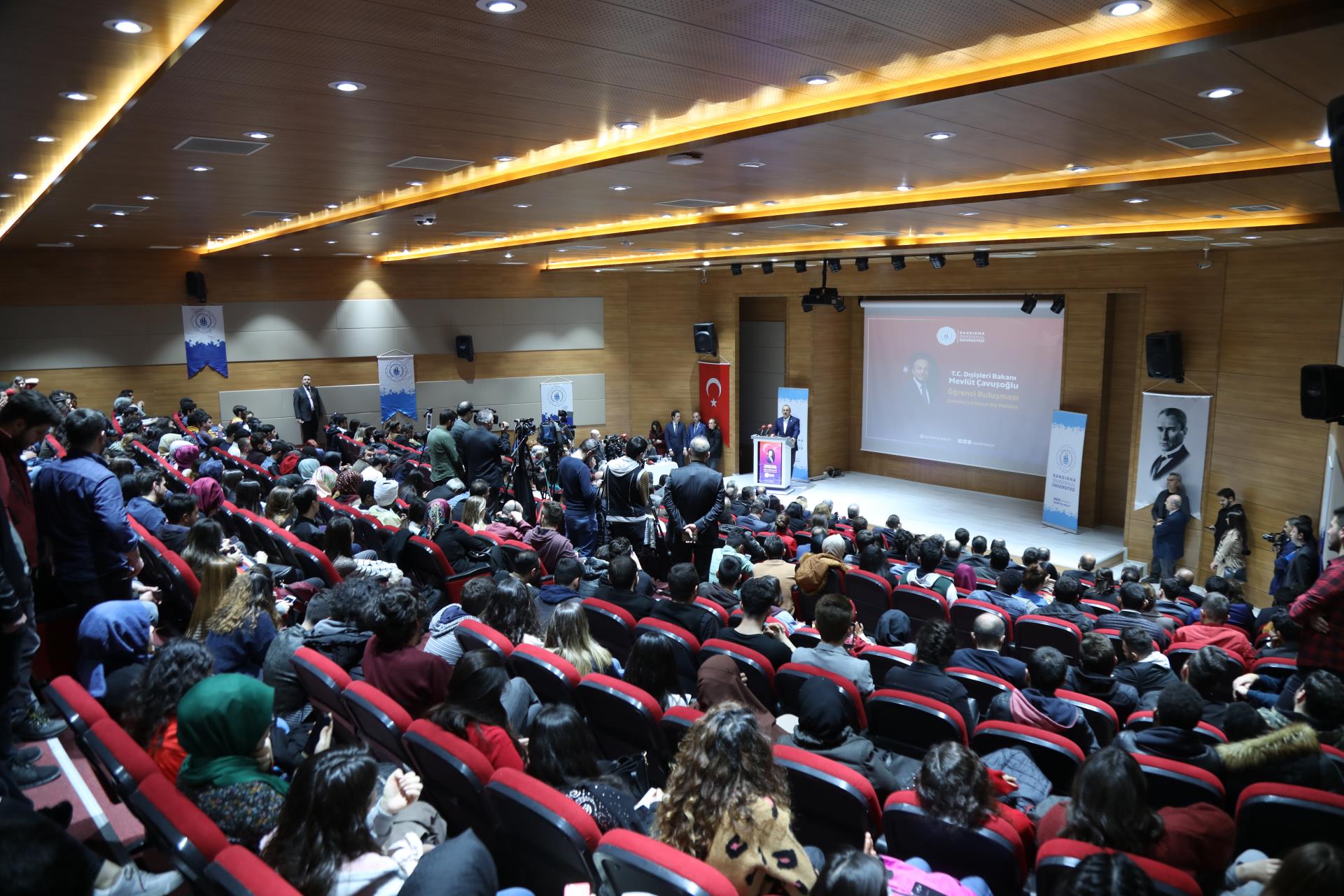 Düzenlenen sergi açılışı sonrası Rektörlük Konferans Salonumuzda, Dışişleri Bakanımız Sayın Mevlüt Çavuşoğlu ile Üniversitemiz öğrencileri buluştu. Büyük bir katılım ve coşkuyla başlayan ve öğrencilerimizin heyecan ve dikkatle takip ettiği buluşma sonrasında soru-cevap bölümü gerçekleşti.