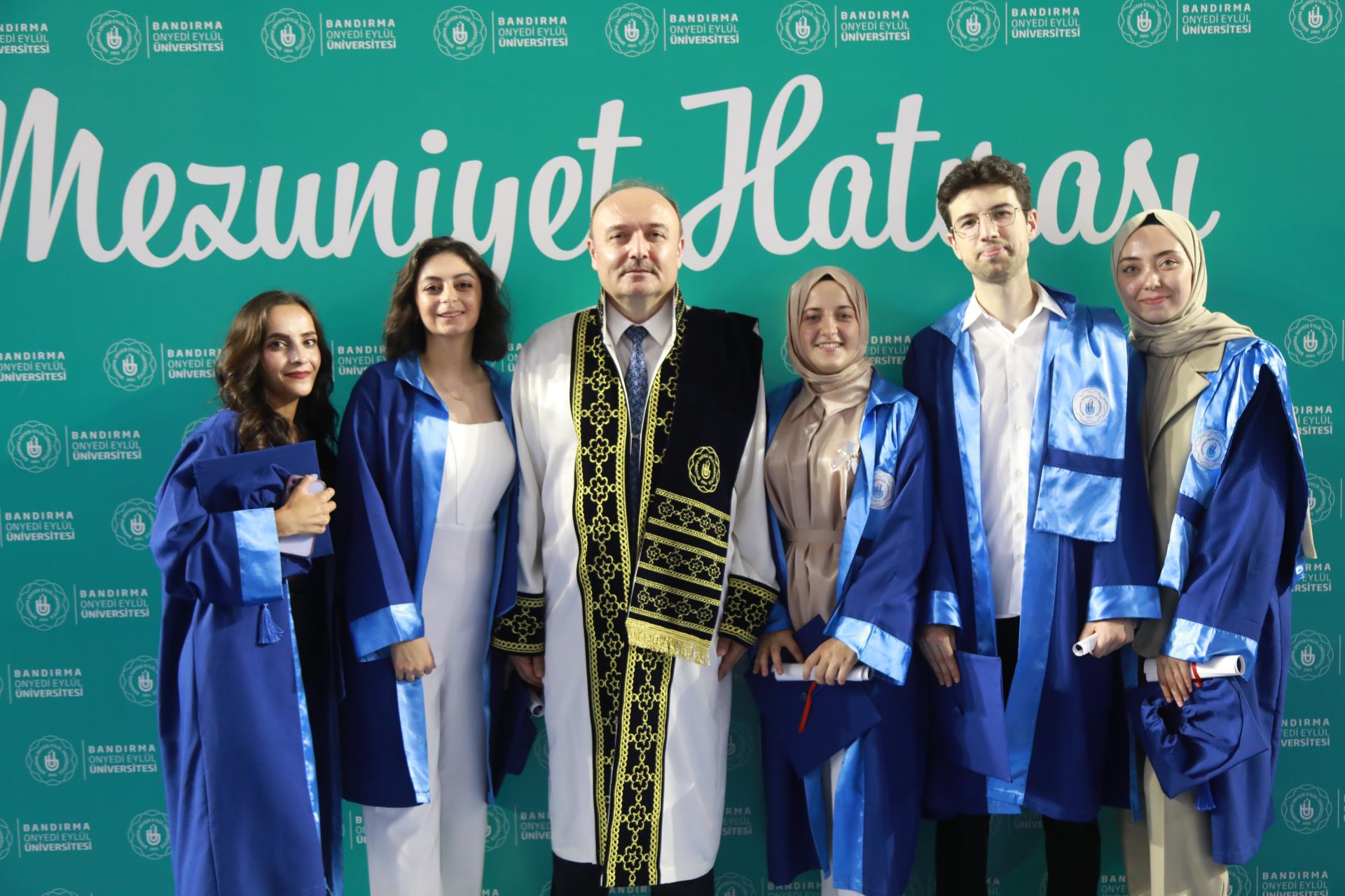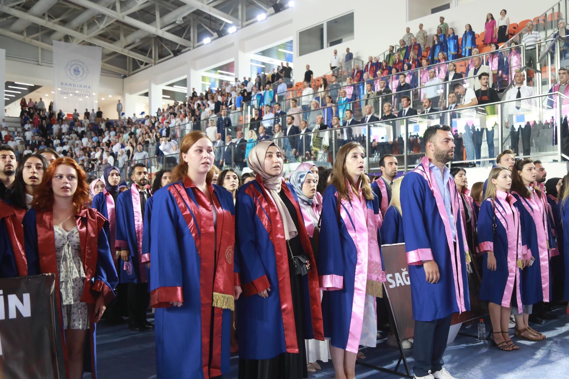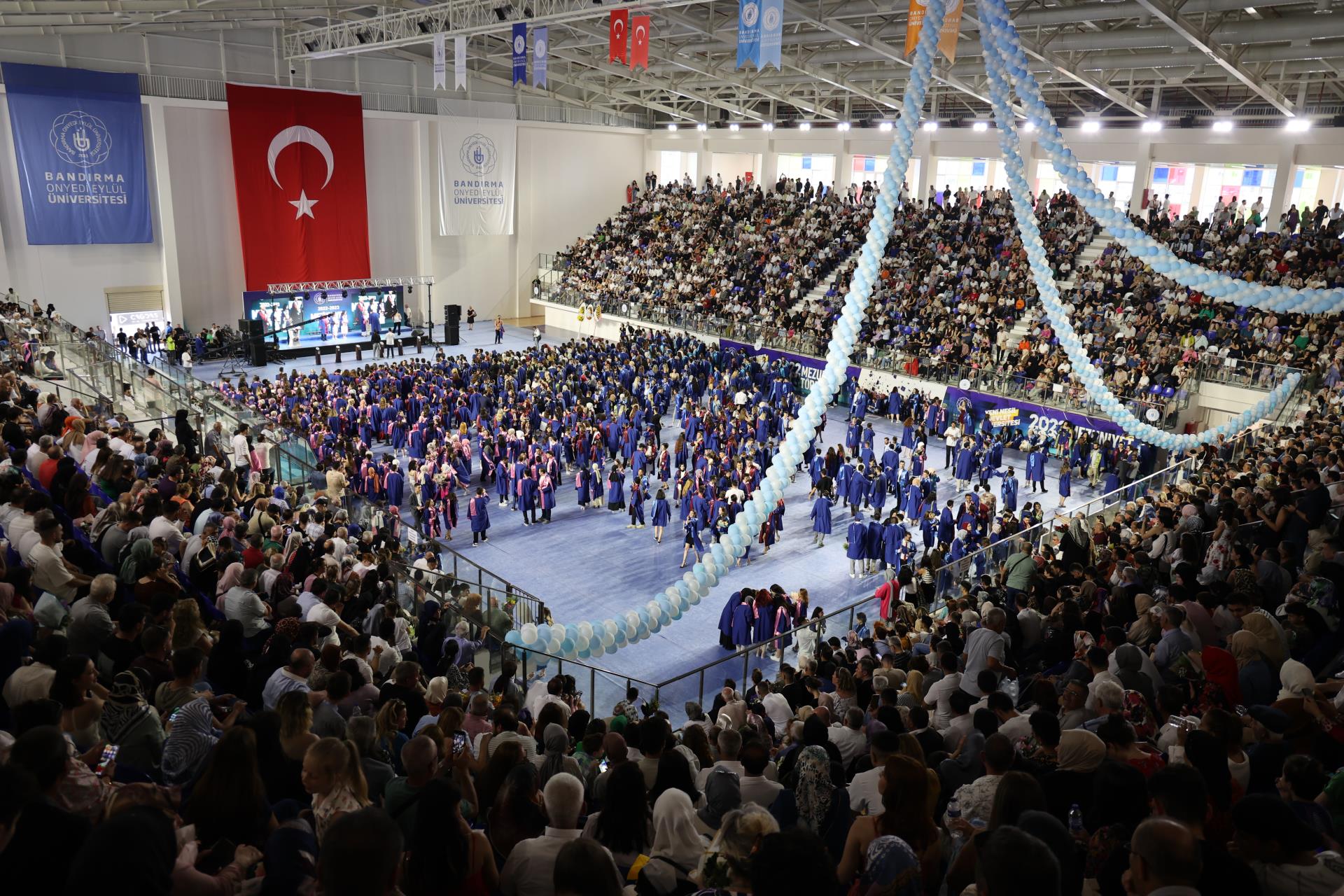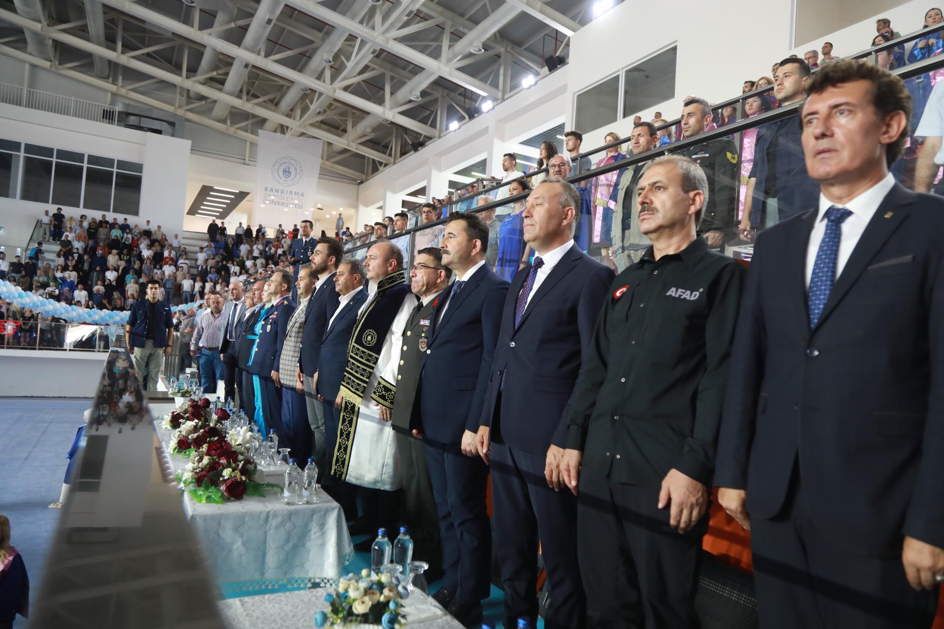 Üniversitemiz 2023 yılı lisans mezunlarına yönelik Merkez Yerleşkemizdeki Spor Vadisi’nde yer alan Kapalı Spor Salonu’muzda düzenlenen mezuniyet törenimiz büyük bir coşkuyla gerçekleşti. Rektörümüz Prof. Dr. Süleyman Özdemir’in ev sahipliği yaptığı törene Balıkesir Valisi Hasan Şıldak, Balıkesir Milletvekili Ali Taylan Öztaylan, MSÜ Kara Asb. MYO k. Tuğg. Mahmut Büyükcingi, Garnizon Komutanı Hv. Plt. Tuğ. Gen. Selahattin Akalp, Bandırma Kaymakamı Engin Aksakal, Balıkesir İl Emniyet Müdürü Hasan Onar, İl Jandarma Komutanı J. Kd. Alb. Ali Yıldız, Rektör Yardımcılarımız Prof. Dr. Alpaslan Serel, Prof. Dr. Feyzullah Temurtaş ve Prof. Dr. Celalettin Yanık, Genel Sekreterimiz Cihangir Boz, il ve ilçe protokolü, siyasi parti ve sivil toplum kuruluşlarımızın temsilcileri, akademik ve idari personelimiz, basın mensupları, öğrencilerimiz ve velileri katılım gösterdi.