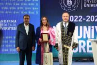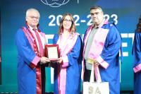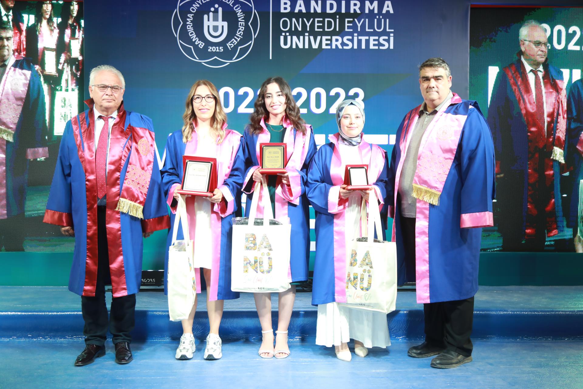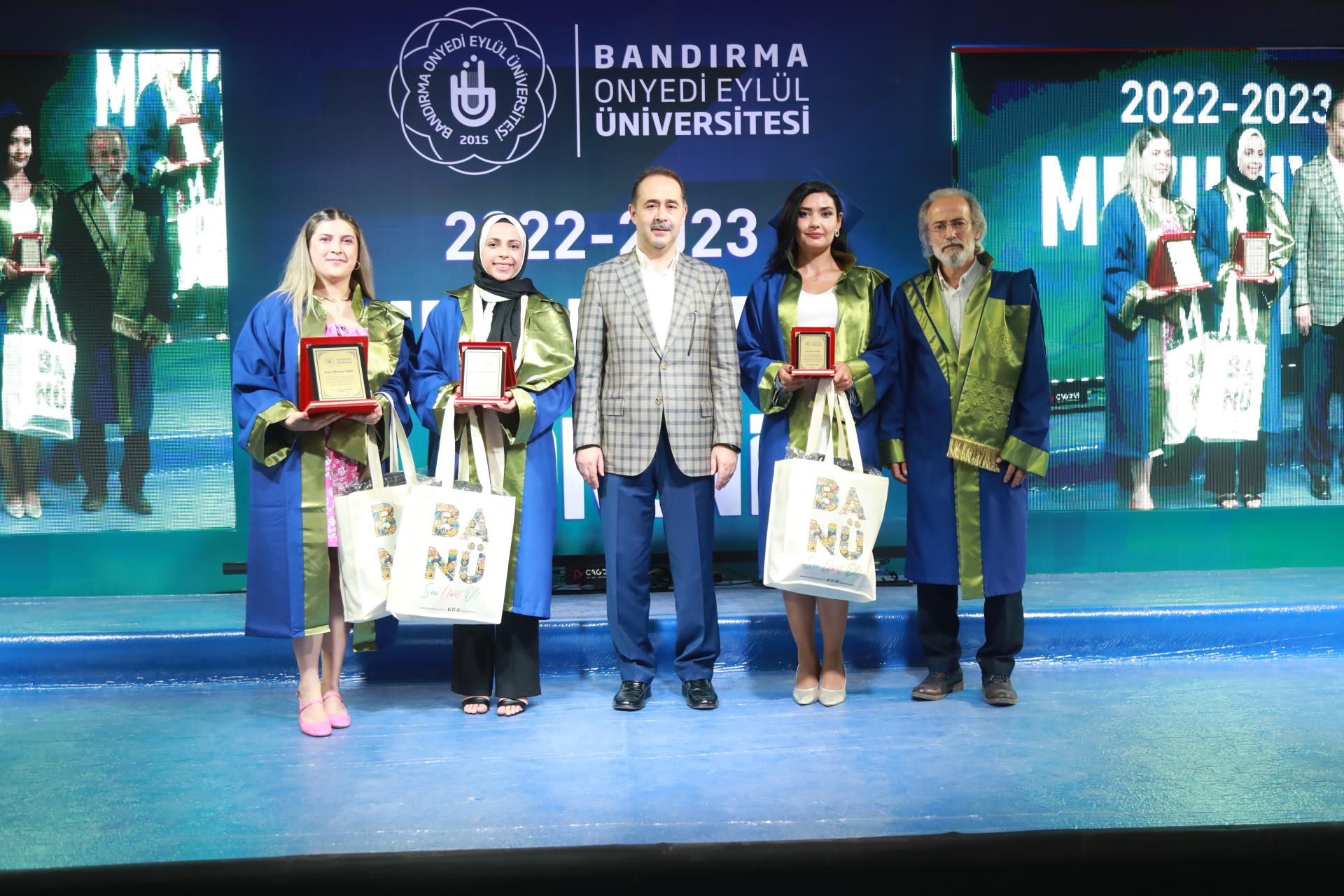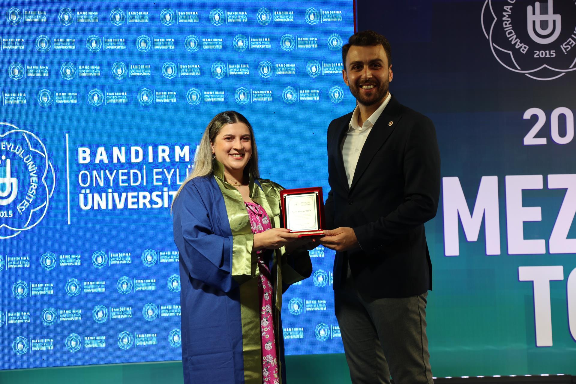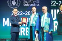 Konuşmalardan sonra fakülte ve meslek yüksekokullarımızı birincilikle bitiren öğrencilerimiz tarafından tüm mezun öğrencilerimiz adına kütüğe plaket çakma seramonisi gerçekleştirildi. Programda daha sonra dereceye giren öğrencilerimize ödül ve plaket takdim törenine geçildi. Üniversitemizi derece ile tamamlayan öğrenciler plaket ve ödüllerini Rektörümüz Prof. Dr. Süleyman Özdemir ve protokol üyelerinin elinden aldı. Plaket ve ödül takdimlerinin ardından mezun veren birimlerin dekan, müdür, bölüm başkanları, öğretim üyeleri, akademik ve idari personeli mezuniyet belgelerini takdim etmek üzere öğrencilerimizin yanına geçtiler. Belgeler takdim edildikten sonra tüm öğrencilerimizin mezuniyet belgelerini havaya kaldırdığı güzel bir hatıra fotoğrafı çekildi.