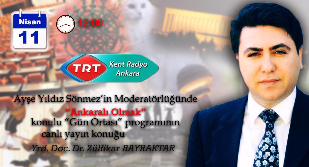 Üniversitemiz Ömer Seyfettin Uygulamalı Bilimler Fakültesi Öğretim Üyesi Yrd. Doç. Dr. Zülfikar Bayraktar, 11 Nisan 2017 Salı günü, saat 12:00'de Kent Radyo Ankara'da Ayşe Yıldız Sönmez'in moderatörlüğünde "Ankaralı Olmak" konulu "Gün Ortası" programına canlı yayın konuğu oluyor.