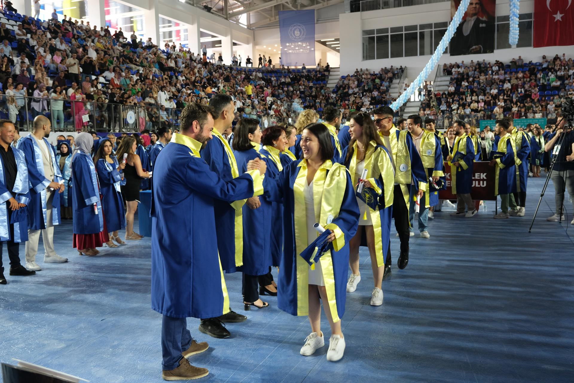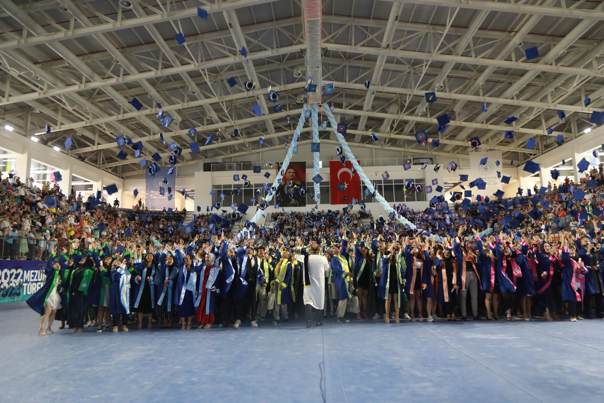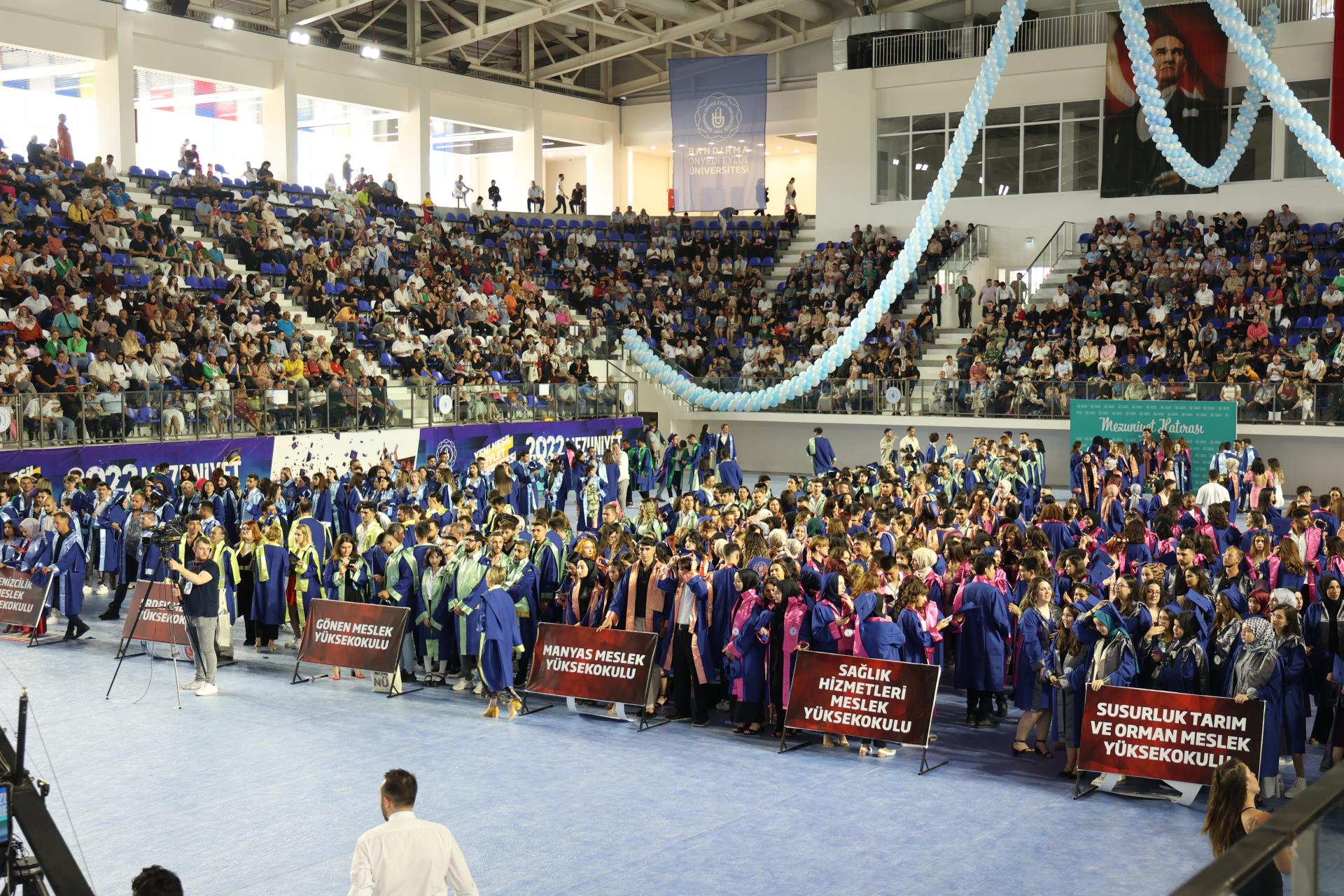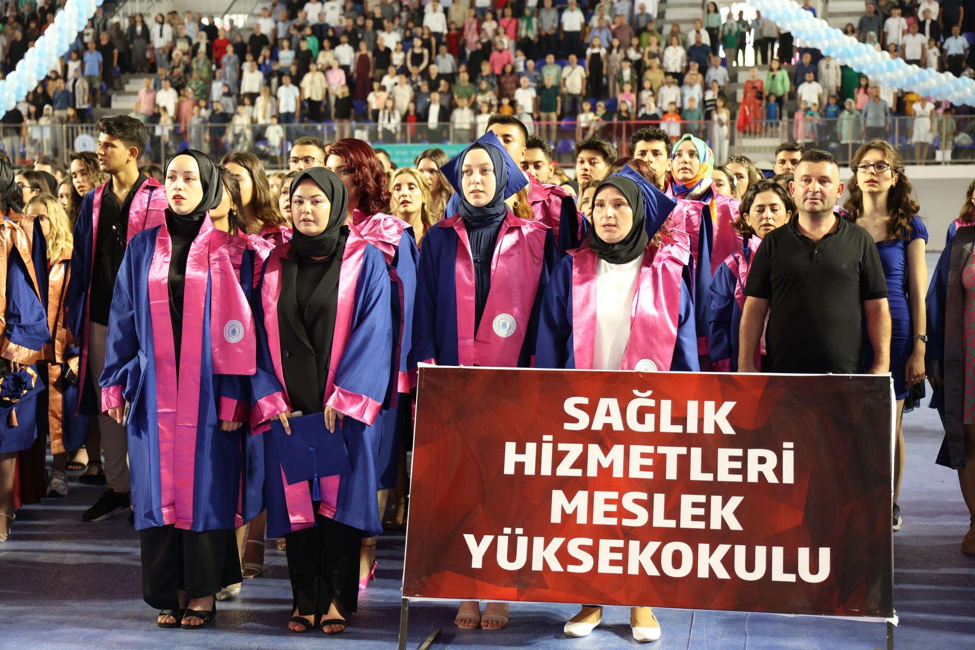 Üniversitemiz 2023 yılı önlisans mezunlarına yönelik düzenlenen mezuniyet törenimiz büyük bir coşkuyla gerçekleşti. Merkez Yerleşkemizdeki Spor Vadisi’nde yer alan Kapalı Spor Salonu’muzda gerçekleşen mezuniyet törenine Rektörümüz Prof. Dr. Süleyman Özdemir, Rektör Yardımcılarımız Prof. Dr. Alpaslan Serel, Prof. Dr. Feyzullah Temurtaş ve Prof. Dr. Celalettin Yanık, Genel Sekreterimiz Cihangir Boz, akademik ve idari birimlerimizin yöneticileri, basın mensupları, öğrenciler ve aileleri katıldı.