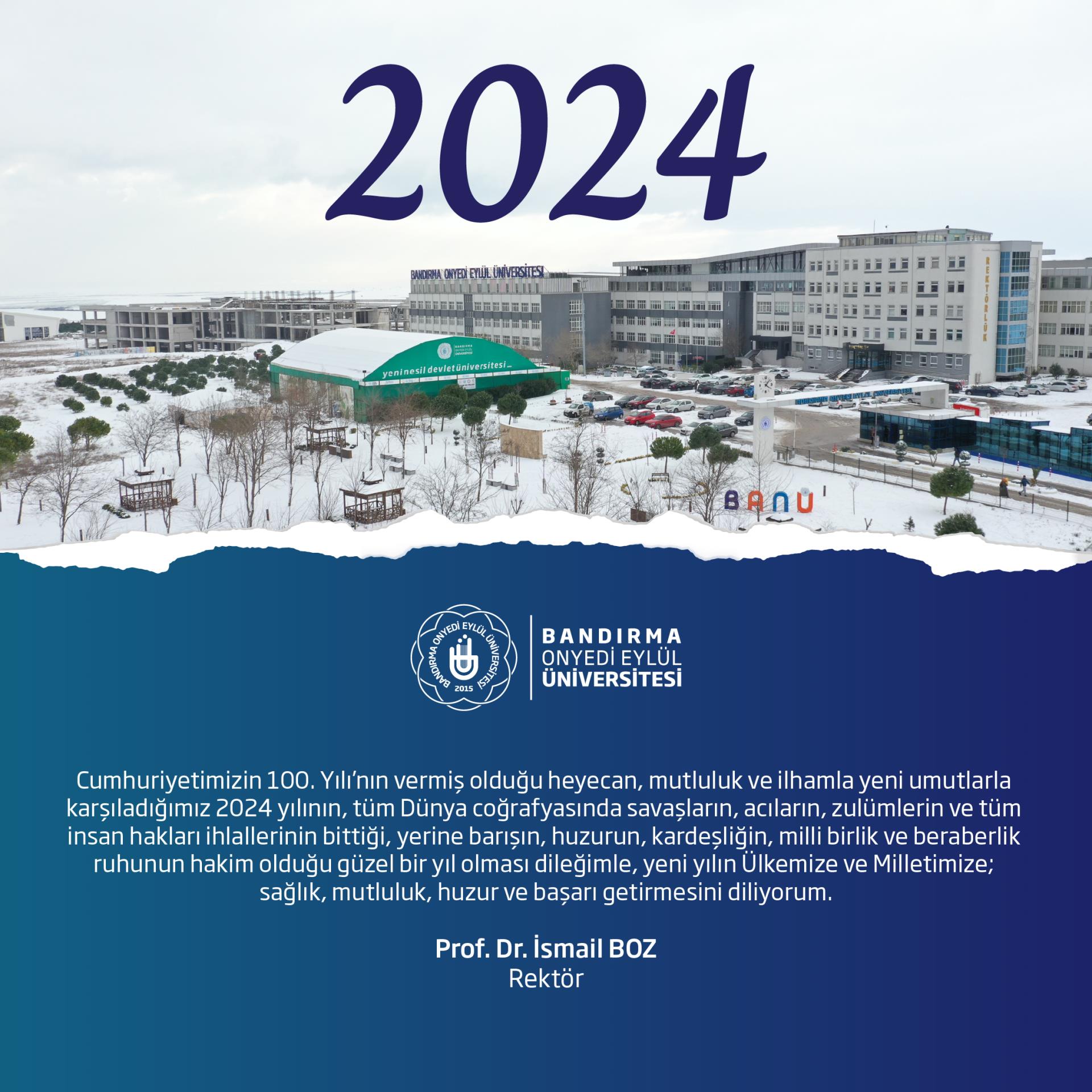 Bu duygu ve düşüncelerle Bandırma Onyedi Eylül Üniversitesi ailesinin ve tüm milletimizin 2024 yılını en içten dileklerimle kutluyor, yeni yılın Üniversitemize ve ülkemize; sağlık, mutluluk, huzur ve başarı getirmesini diliyorum.