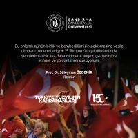 15 Temmuz'un üzerinden geçen yıllar bizlere güçlü bir şekilde hatırlatmaktadır ki demokrasi ve özgürlüklerimiz, üzerine titrememiz gereken en değerli varlıklarımızdır. Ülkemizdeki tüm bireylerin fikirlerini ifade etme hakkına sahip olduğu, insan haklarının ve hukukun üstünlüğünün temel prensipler olduğu bir ortamı koruma sorumluluğumuz vardır. Sorumluluğunun bilincinde, bilim ve akademik özgürlüklerimizi daha da güçlendirmek için çalışmaya devam eden Bandırma Onyedi Eylül Üniversitesi olarak demokrasiye ve özgürlüklere sahip çıkmaya devam edecek, bilimsel düşüncenin öncülüğünde, toplumsal sorunlara çözüm üretebilen, hoşgörü ve saygıyla donanmış gençler yetiştireceğiz. Yetiştirdiğimiz gençler, ülkemizin geleceğini şekillendirecek ve demokrasimizin teminatı olacaktır.