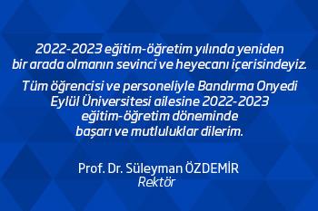 2022-2023 eğitim-öğretim yılında kıymetli öğrencilerimizle yeniden bir arada olmanın sevinci ve heyecanı içerisindeyiz. Bandırma Onyedi Eylül Üniversitesi, kurulduğu günden bu yana daima değişimi ve ilerlemeyi kendine hedef edinmiştir. Bu hedef doğrultusunda yeni eğitim-öğretim yılında da çalışmalarımıza devam edecek ve istikrarlı gelişimimizi sürdüreceğiz.
