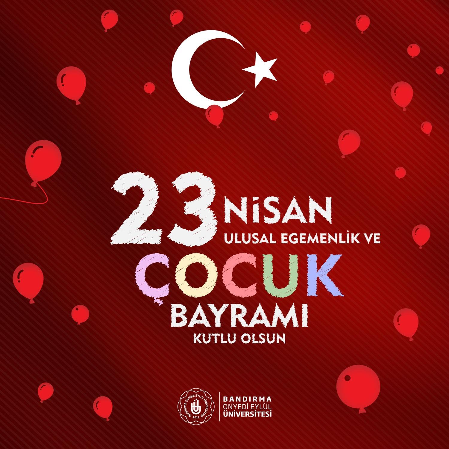 23 Nisan 2015 tarihinde kurulan, “Sen Umut Ol” mottosu ile yola çıkan ve yarına umut olacak yeni nesiller yetiştirmek üzere var gücüyle çalışan Bandırma Onyedi Eylül Üniversitesi olarak bu anlamlı günde bayramın coşkusu ile 8. kuruluş yıl dönümümüzün gururu ve mutluluğunu bir arada yaşıyoruz. Dünyada kutlanan tek çocuk bayramı olan, dünya çocukları arasında barış ve kardeşliğin kurulmasına katkı sunan bu önemli günün dünya barışına da vesile olmasını temenni ediyor, tüm insanlığın sağlık, mutluluk, huzur dolu günlere erişebilmesi ümidiyle 23 Nisan Ulusal Egemenlik ve Çocuk Bayramı ile egemenliğimizin simgesi Türkiye Büyük Millet Meclisi’nin 103. yılını en içten duygularımla kutluyor, TBMM’nin kuruluşunda ve Kurtuluş Savaşımızın kazanılmasında emeği geçen tüm şehit ve gazilerimizi saygı, şükran ve rahmetle anıyorum.