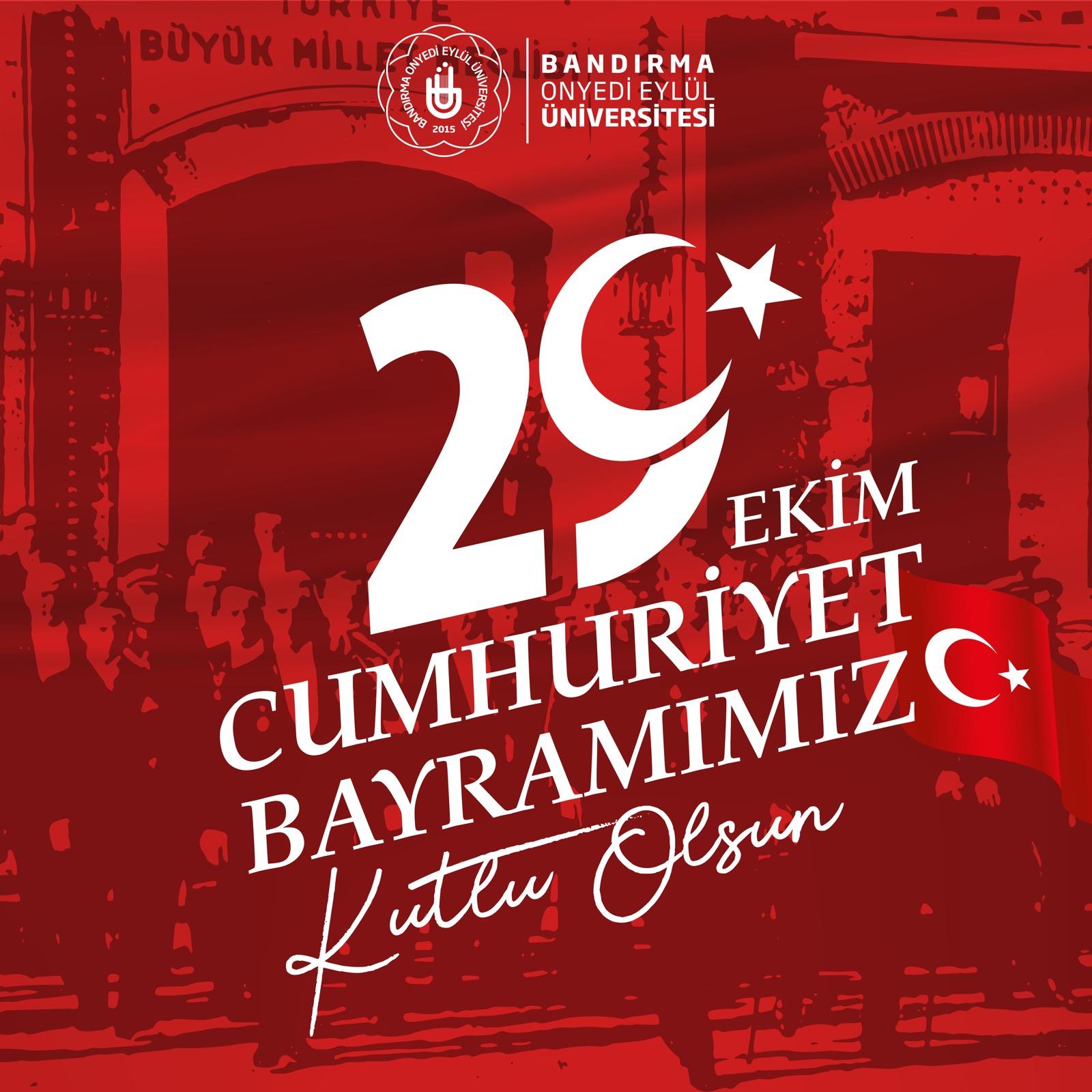 Eğitimli, bilinçli, araştırmacı, umut dolu gençler yetiştirme misyonuyla yola çıkan Bandırma Onyedi Eylül Üniversitesi ailesi olarak bu kıymetli mirası korumak ve yeni nesillere en güzel şekilde aktarmak için var gücümüzle çalışıyoruz. Önümüzdeki yıl bir asrı devirerek 100. yaşına girecek olan Cumhuriyet’imizin 99. yıl dönümüne ulaşmış olmanın gurur ve mutluluğu içerisinde akademik ve idari personelimizin, öğrencilerimizin ve tüm milletimizin 29 Ekim Cumhuriyet Bayramı’nı kutluyor, Gazi Mustafa Kemal Atatürk başta olmak üzere tüm silah arkadaşlarını, aziz şehitlerimiz ile gazilerimizi minnet ve saygıyla anıyorum.