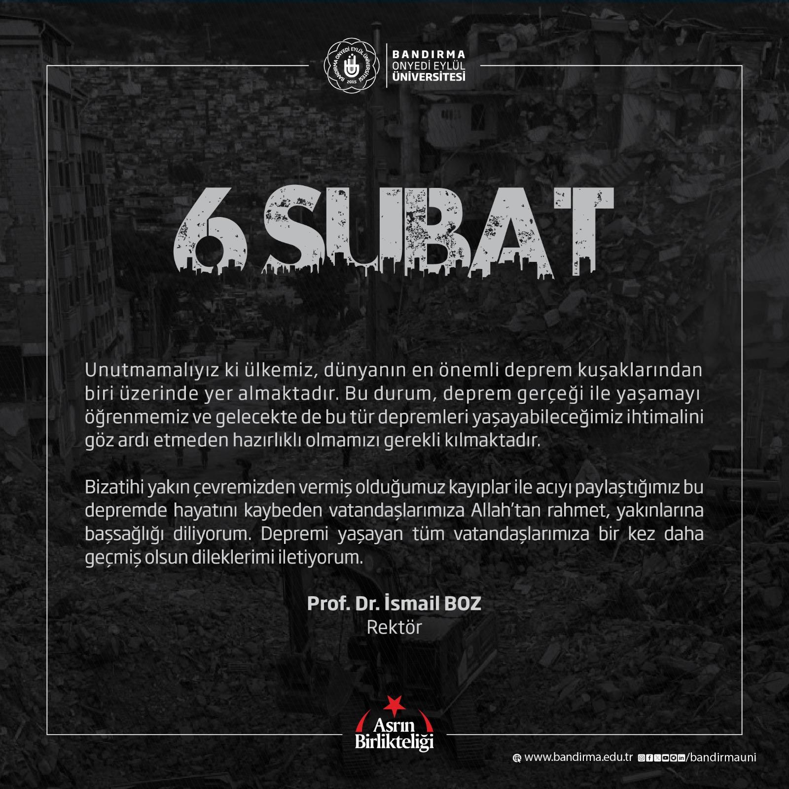 Bandırma Onyedi Eylül Üniversitesi olarak acı haberi öğrendiğimiz 6 Şubat tarihinden başlamak üzere Rektörlüğümüz koordinasyonunda birçok çalışmayı faaliyete geçirdik. Üniversitemiz yönetimi tarafından Kahramanmaraş merkezli gerçekleşen iki büyük deprem sonrası “Acil Durum Eylem Planı” hazırlandı. Hazırlanan eylem planı kapsamında afetzede öğrencilerimiz ve aileleri Üniversitemiz tarafından ayarlanan konaklama tesislerinde ücretsiz bir şekilde misafir edildi. Bandırma’dan yola çıkan arama kurtarma ekibimiz, afet bölgesinde AFAD ve UMKE ekipleri ile koordineli bir şekilde çalışarak afetzede vatandaşlarımızın umudu oldular. Üniversitemiz, deprem bölgesinde afetzede vatandaşlarımıza yönelik olarak düzenlenen “Bir Lokma da BANÜ’den” kampanyası ile bölgedeki sosyal sorumluluk faaliyetlerine hız kesmeden devam etti. Uluslararası Öğrenci Dernekleri Federasyonu (UDEF) Bandırma Temsilciliğimiz koordinasyonunda, Hatay Reyhanlı’da yüz çadırlık çadır kent kuruldu. Bunun yanı sıra Üniversitemiz ve YEMTAR Makine iş birliği ile deprem bölgesindeki depremzedelere ulaştırılmak üzere soba üretimi gerçekleştirildi. Üniversitemiz tarafından ayrıca, deprem bölgesine yönelik olarak Hatay, Kahramanmaraş, Reyhanlı ve Elbistan'da 3 farklı destek projesi kapsamında; kitap kafe, köy okulu oyun atölyesi, çocuk kütüphanesi, yemek ve erzak dağıtımı, eğlence programları ve temel ihtiyaç malzemeleri temini gerçekleştirildi. Bunlar gibi birçok faaliyet gerçekleştiren Üniversitemiz, tarihimizin en acı dönemlerinden birini yaşadığımız süreçte tüm imkânlarını seferber ederek vatandaşlarımıza umut olmaya çalıştı ve çalışmaya devam etmektedir.