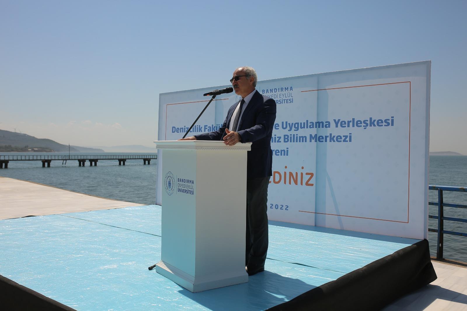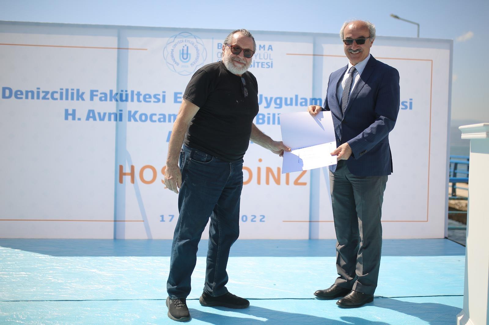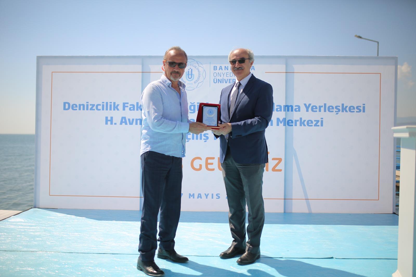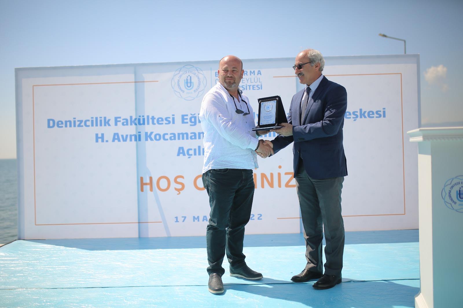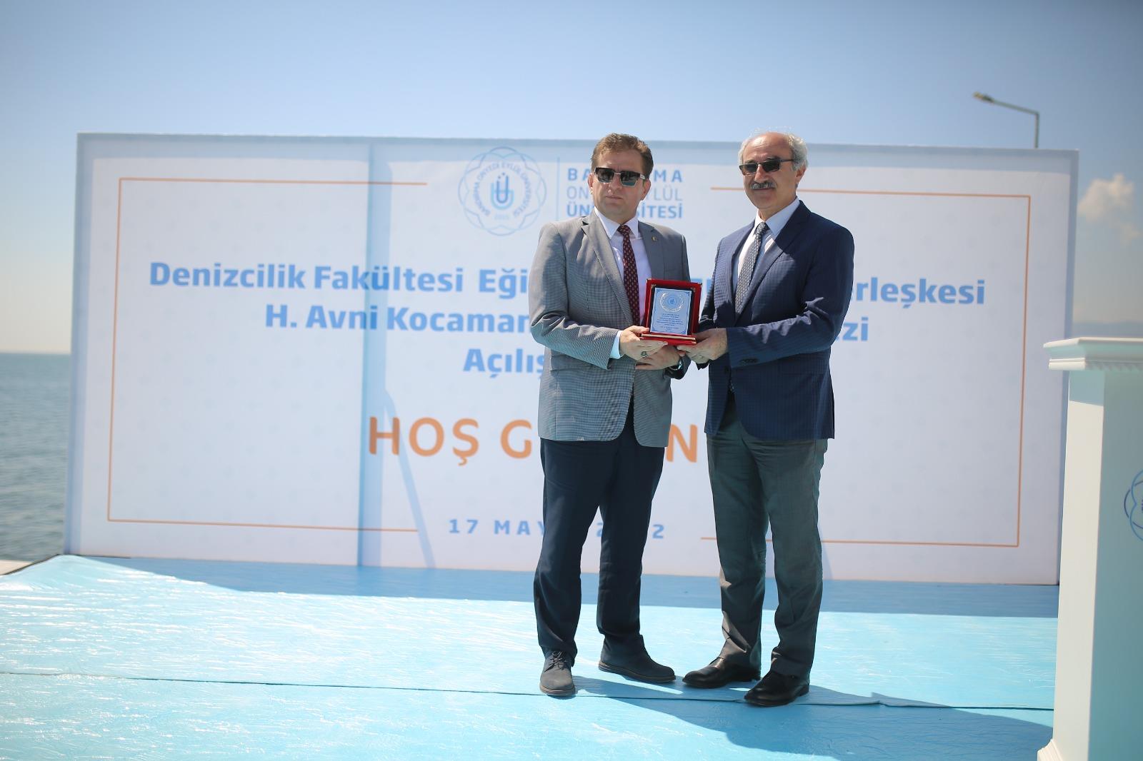 Protokol konuşmalarında kürsüye son olarak Rektörümüz Prof. Dr. Süleyman Özdemir geldi ve “Üniversitemizin kuruluşundan beri belki de en çok keyif aldığım, en çok mutlu olduğum etkinliklerden birinde bir aradayız. Buradaki deniz bilim merkezimiz benim de çok değer verdiğim bir yer. Geçtiğimiz 23 Nisan itibariyle 7. Yaşını tamamlayan ve her geçen gün büyüyen Üniversitemiz için Denizcilik Fakültesi hep ön planda oldu. Denizcilik Fakültesi ve denizcilikle ilgili atılımlarda da iki ismin çok etkisi oldu. Bunlardan biri Osman Bey’dir. Çünkü bir araya geldiğimizde hep bana bunu sordu ve bunu önceledi. Buradan hareketle ve deniz şehrinde yaşıyor olmamız sebebiyle denizcilik fakültemize önem verdik. Bu anlamda Türkiye’de ihtiyaç var. Çünkü çok fazla denizcilik fakültesi yok. Bugün en önde gelen denizcilik fakültelerinden biri olduğumuzu söyleyebilirim. Abartmadan söylüyorum; en modern, en çağdaş alt yapıya sahip denizcilik fakültesine sahibiz. Burayı açmamızda pek çok kişinin emeği var. Özellikle bilim merkezimize ismini verdiğimiz, çok büyük destekleri olan Avni Kocaman’ı rahmetle anıyoruz. Ve emeği geçen herkese teşekkür ediyoruz.” dedi.