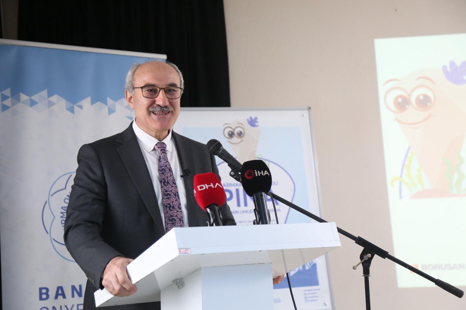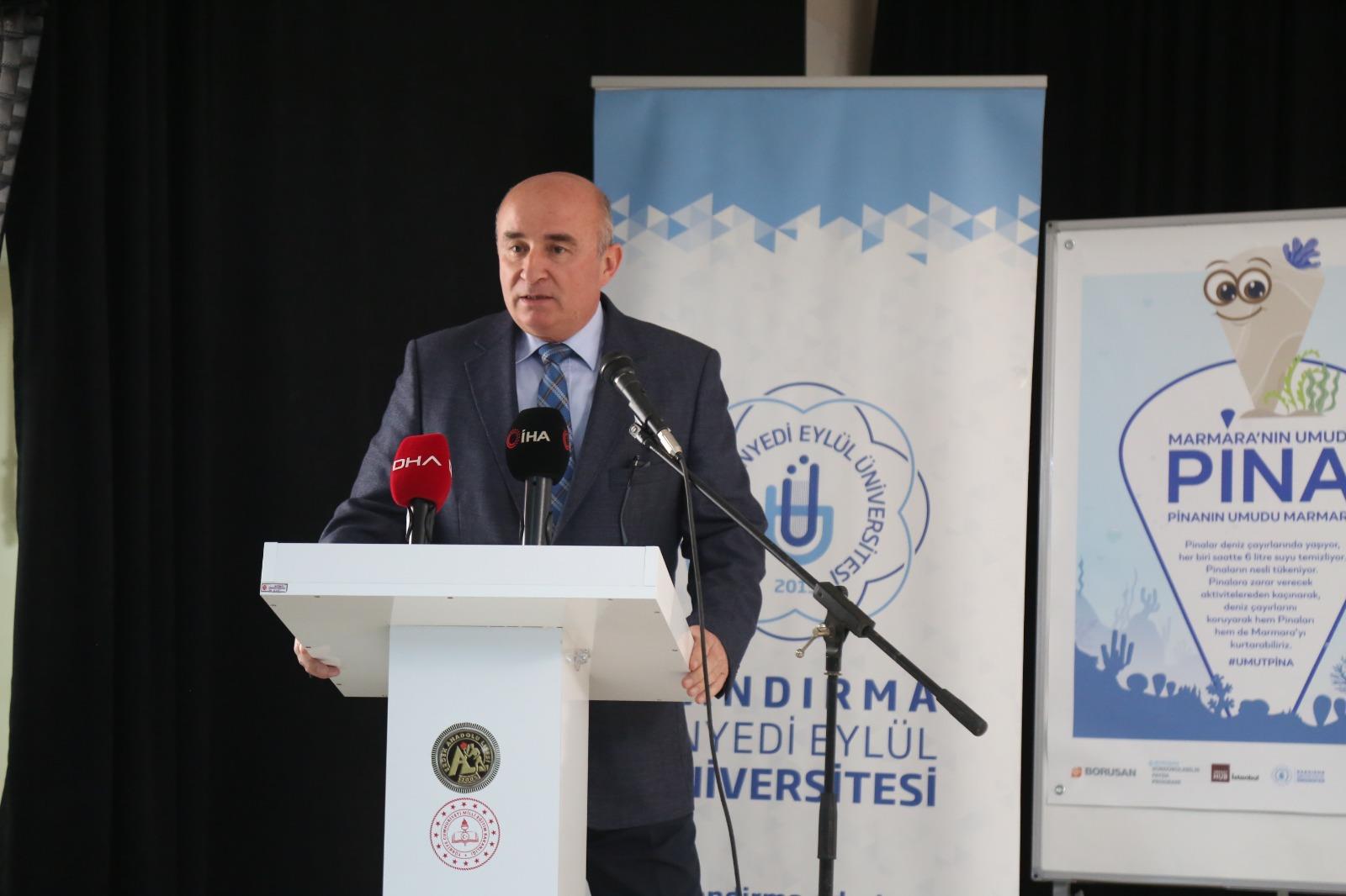 Toplantıda Doç. Dr. Uğur Karadurmuş’un yapmış olduğu açılış konuşmasının ardından Erdek Ticaret Odası Başkanı Turan Gün ve Erdek Belediye Başkanı Burhan Karışık birer konuşma gerçekleştirdi. Rektörümüz Prof. Dr. Süleyman Özdemir de konuşmasında, gerçekleşen projenin ve projenin ilk toplantısının önemine vurgu yaparak herkesin çevreyi korumak adına duyarlı davranması gerektiğinin altını çizdi. Kürsüye son olarak ‘Marmara’nın Umudu Pina’ projesinin yürütücüsü, Denizcilik Fakültesi Dekanımız Prof. Dr. Mustafa Sarı geldi ve Marmara Deniz’inin kurtarılmasında büyük rol oynayan, bir saatte altı litre deniz suyunu süzerek müsilajla mücadelede ilk sırada yer alan çok değerli bir tür olan Akdeniz’in en büyük çift kabuklusu pinaların korunması adına alınması gereken tedbirleri anlattığı bir sunum gerçekleştirdi.