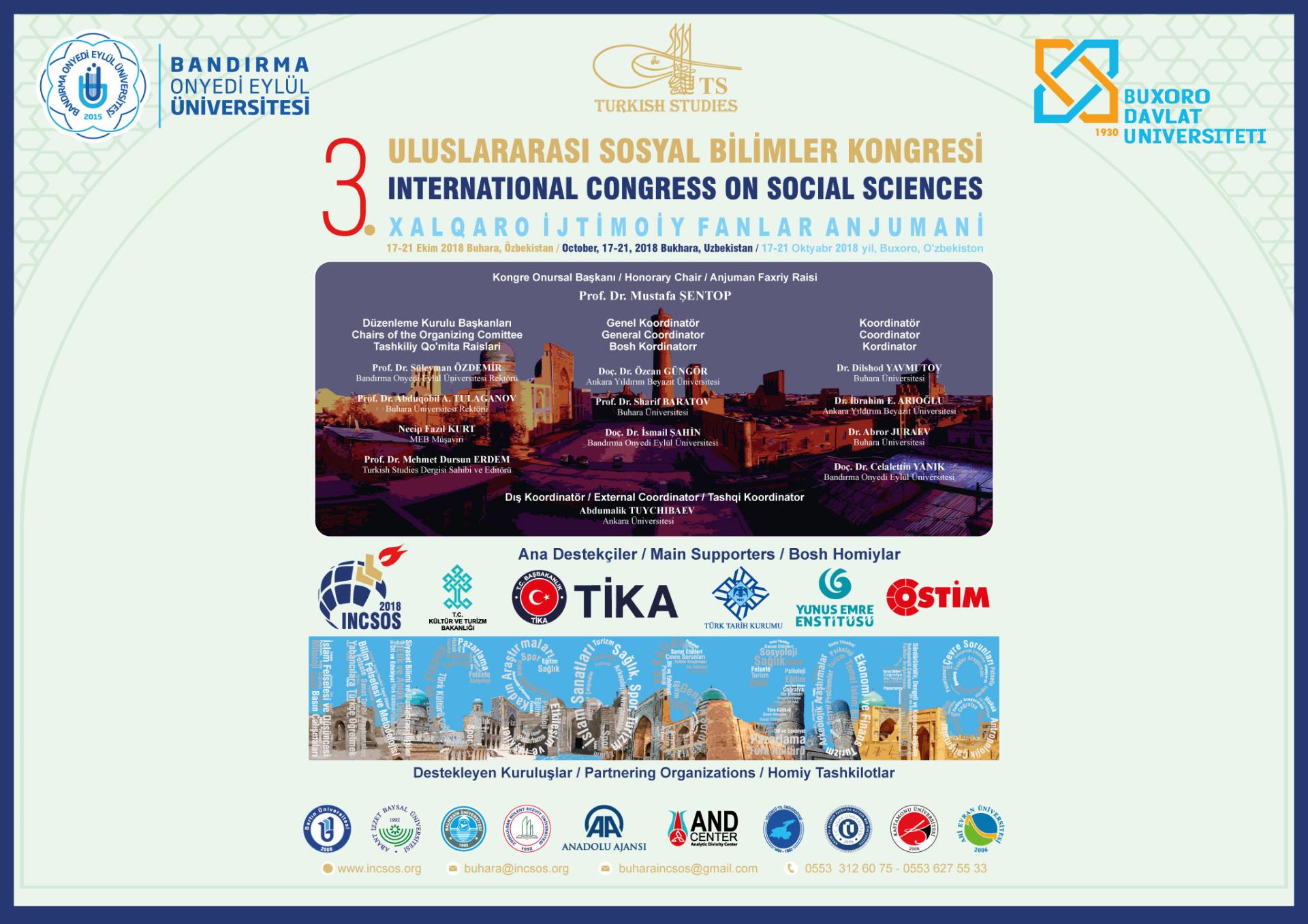 17-21 Ekim 2018 tarihleri arasında medeniyetimizin kadim şehri ve sosyal bilimciler için bir laboratuvar olma özelliği taşıyan Buhara’da üniversitemiz, Buhara Üniversitesi ve Turkish Studies Dergisi işbirliğinde “3. Uluslararası Sosyal Bilimler Kongresi” düzenleniyor.