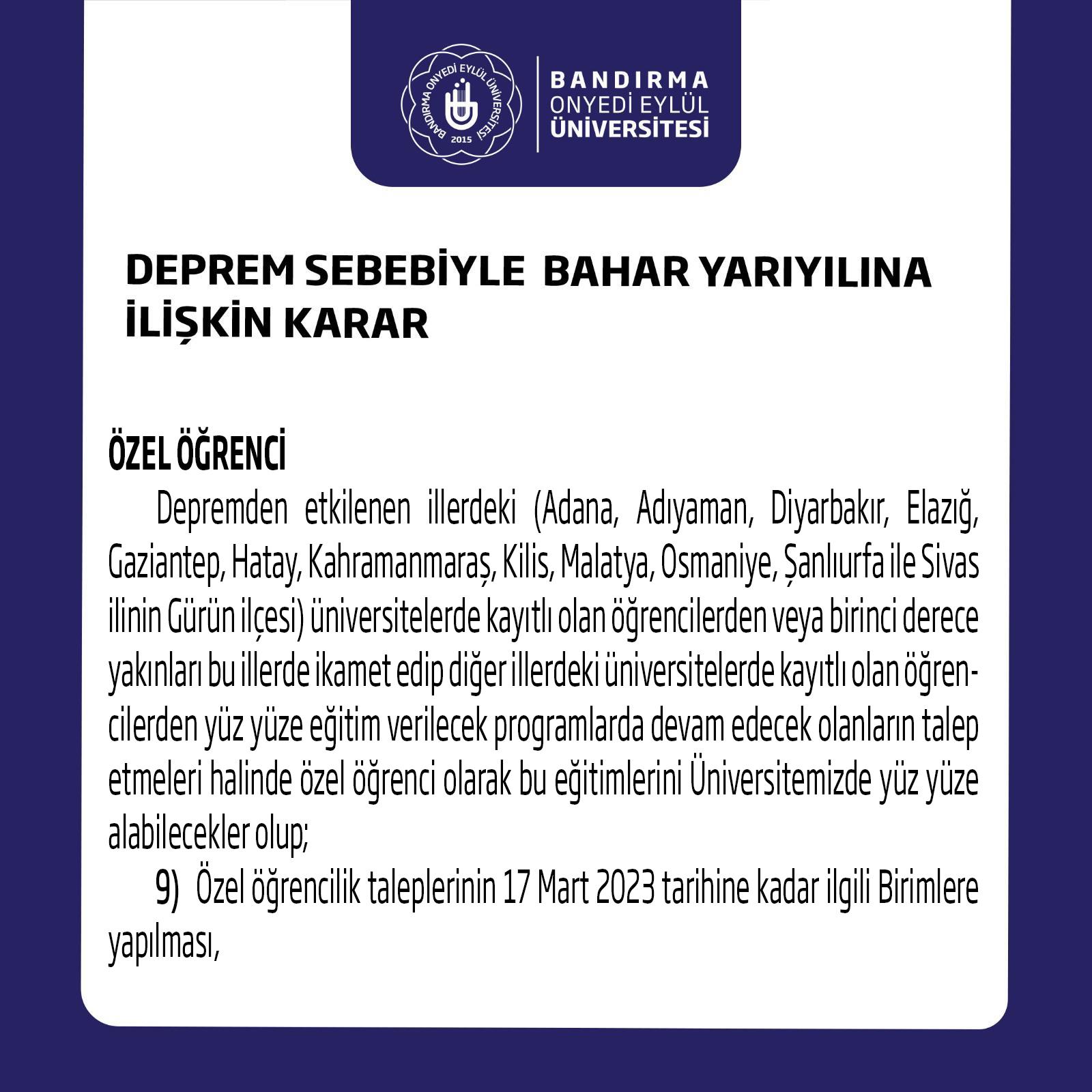 - Özel öğrencilik taleplerinin 17 Mart 2023 tarihine kadar ilgili Birimlere yapılabilmesine,