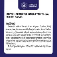 Kahramanmaraş merkezli depremin ülkemiz genelindeki etkileri, depremden etkilenen vatandaşlarımız ile öğrencilerimizin barınma durumları, sosyal koşullar ve sürdürülebilir öğretim süreçleri gibi birçok faktör bir arada değerlendirilerek 2022-2023 Bahar Döneminin uzaktan öğretim yoluyla tamamlanmasının uygun olacağına Yükseköğretim Kurulu Başkanlığı’nca karar verilmiş olup öğrencilerimizin eğitimlerini, nitelikten ödün vermeden mümkün olan en etkin, verimli ve kesintisiz bir şekilde sürdürebilmelerini sağlamak için ön lisans, lisans ve lisansüstünde 2022-2023 akademik yılı Bahar Dönemiyle sınırlı olmak üzere;