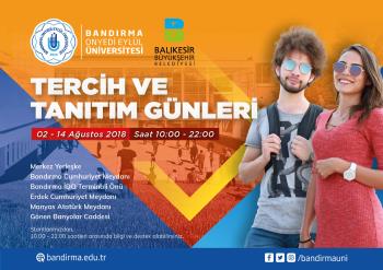 Üniversitemiz, 2-14 Ağustos 2018 tarihleri arasında aday öğrencilerin, kendi ilgi ve yetenekleri doğrultusunda meslek alanlarını tanıyarak tercihlerini yapabilmeleri amacıyla “Tercih ve Tanıtım Günleri” düzenliyor. Düzenlenecek olan “Tercih ve Tanıtım Günleri” kapsamında Merkez Yerleşkemizde 08.30-17.30 saatleri arasında, Bandırma Cumhuriyet Meydanı, Bandırma İDO Terminali önü, Erdek Cumhuriyet Meydanı, Manyas Atatürk Meydanı ve Gönen Banyolar Caddesi’nde ise 10.00-22.00 saatleri arasında tanıtım stantlarımız açılacaktır.