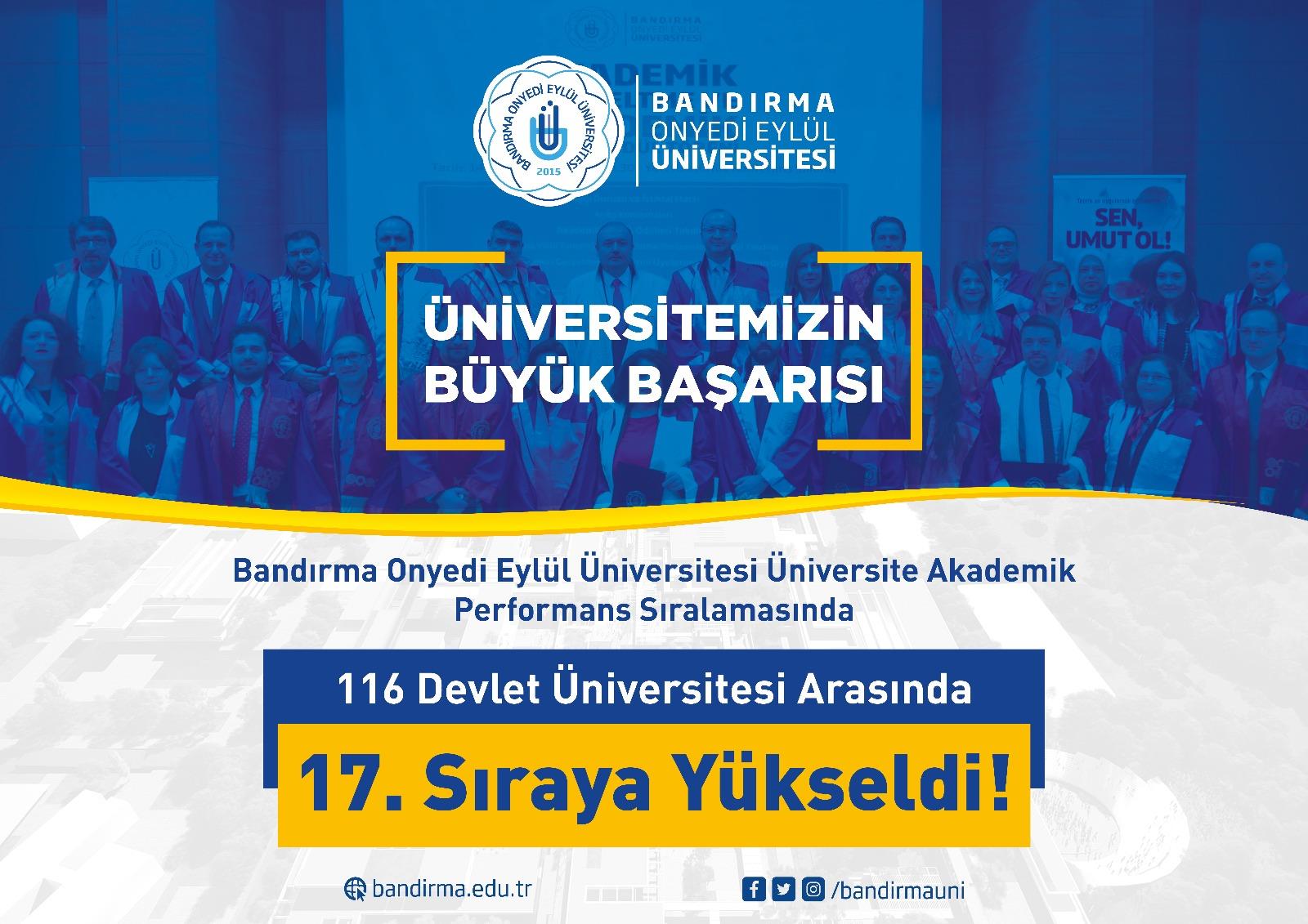 Üniversitemiz bu yıl da 2018 yılı akademik performanslarının değerlendirildiği 2019 yılı “Devlet Üniversitesi ve Fakülteleri Sıralaması Raporu (DÜS 2019)”nda 116 devlet üniversitesi arasında 17. olarak akademik başarıda istikrarlı yükselişini sürdürmüştür.