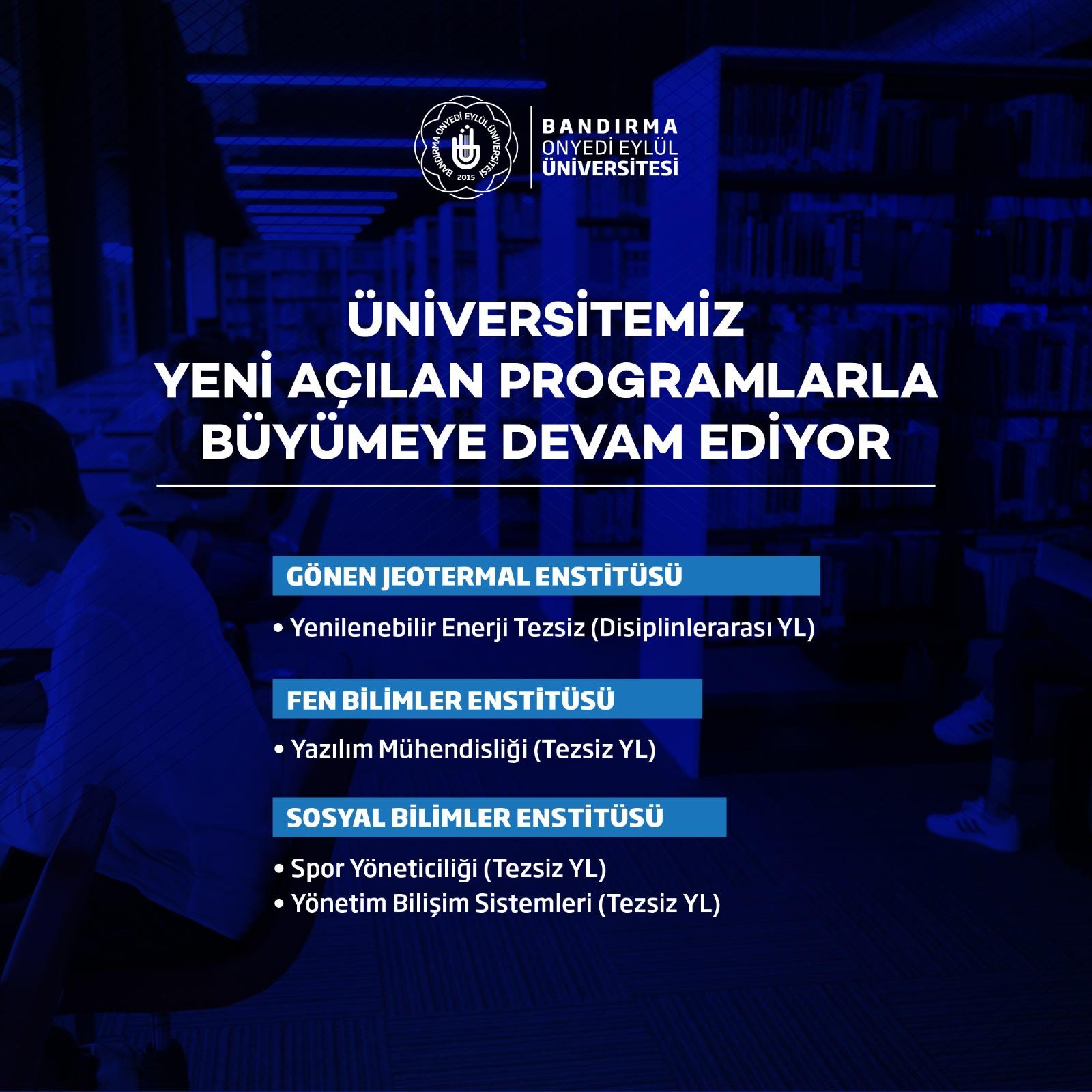 Lisans eğitimini tamamlayıp lisansüstü eğitime devam etmek isteyen öğrenciler tarafından son dönemde artan talepler doğrultusunda ve ülkemizin ihtiyaç duyduğu nitelikli insan gücünün yetiştirilmesine katkı sağlamak amacıyla 4 yeni lisansüstü programının açılması için Yüksek Öğretim Kurulu Başkanlığı (YÖK)'na başvurumuz kabul edilmiştir.