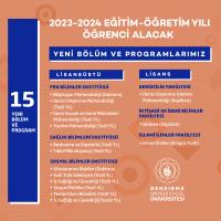 2023-2024 eğitim-öğretim yılından itibaren öğrenci almaya başlayacak olan ve Yüksek Öğretim Kurulu Başkanlığı tarafından onaylanan lisans ve lisansüstü düzeyinde 15 yeni bölüm ve programımız: