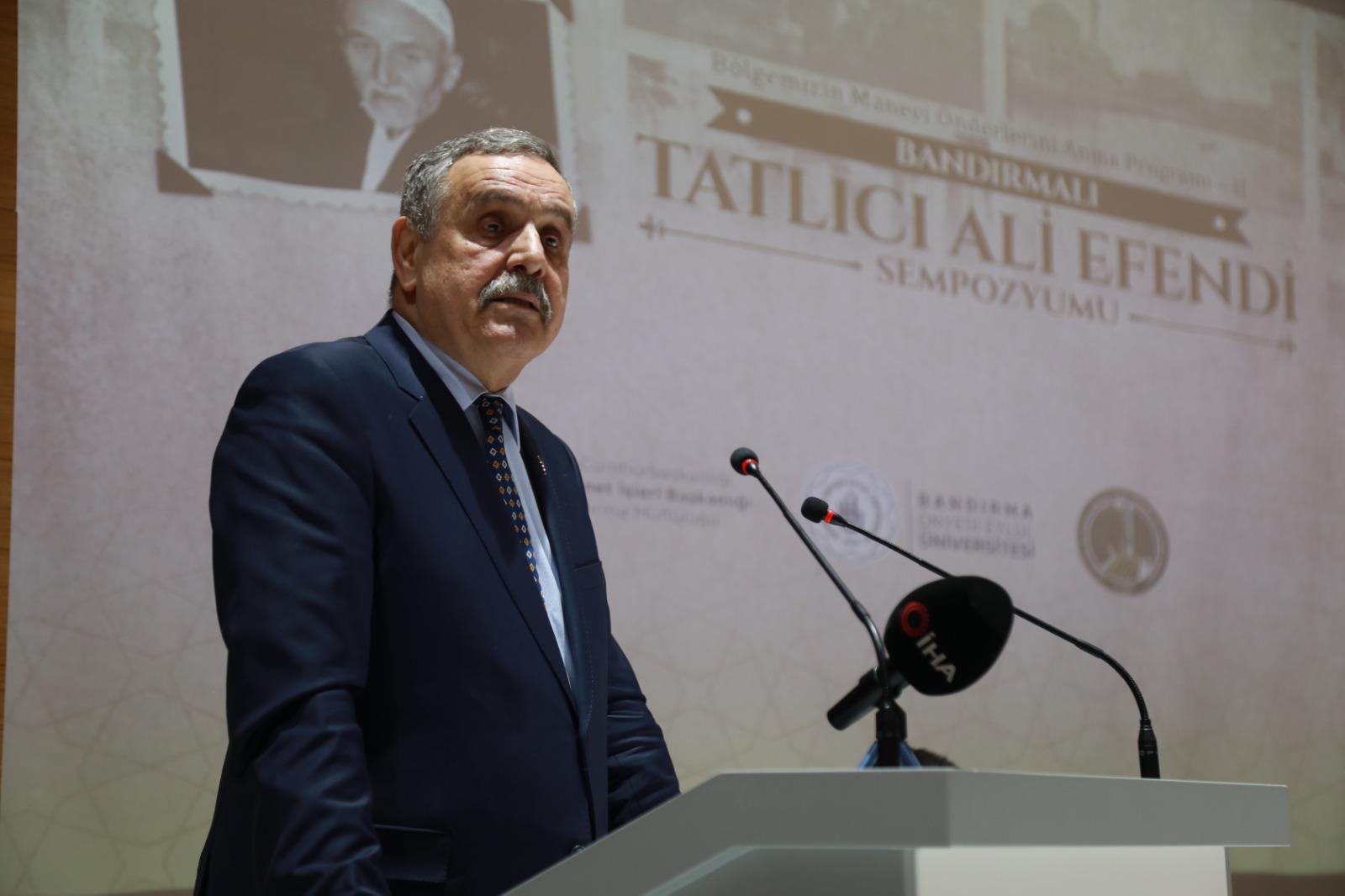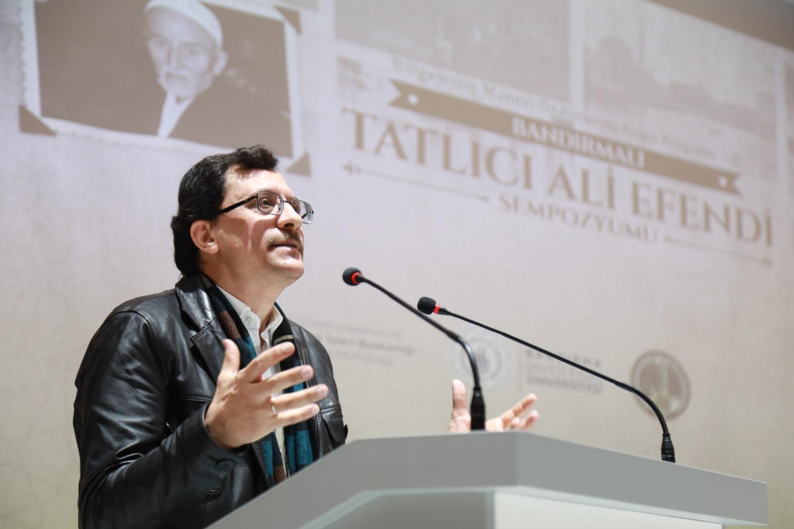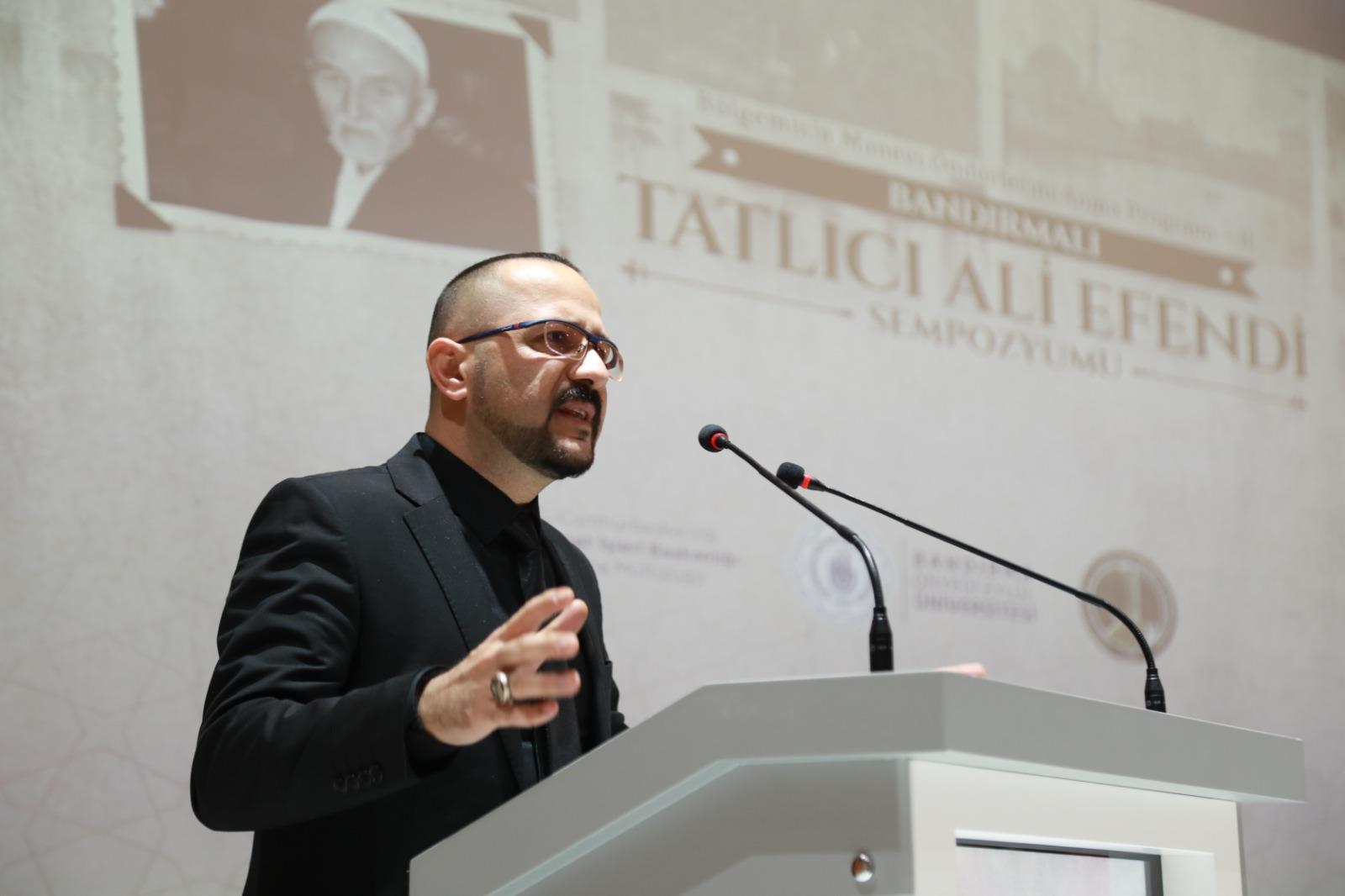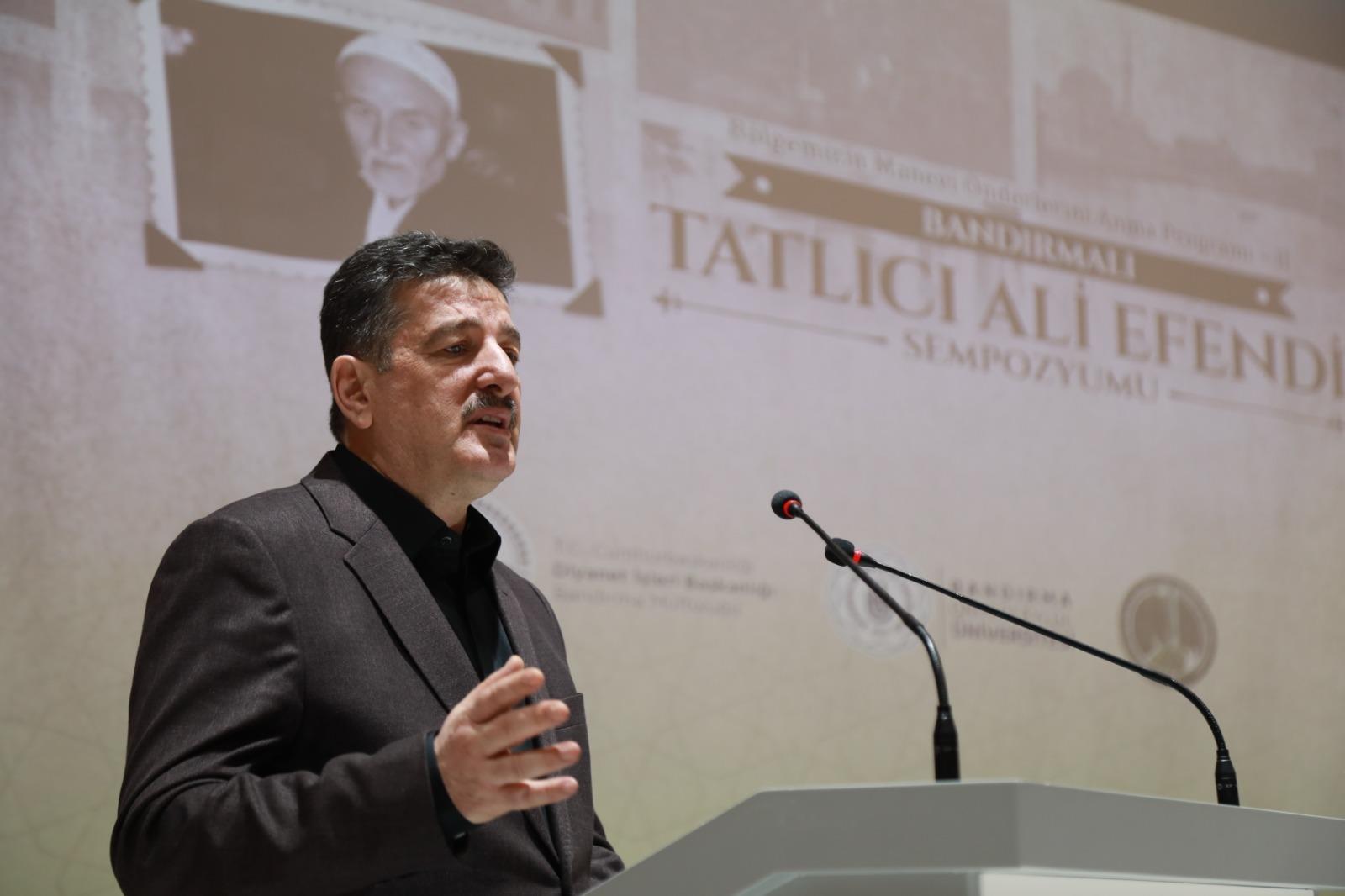 Konuşmasının devamında; “Anma programlarının ilkini geçen yıl Gönen’de Gönen İlçe Müftülüğümüz ve Gönen Belediyesi’yle birlikte Gönenli Mehmet Efendi’yi Anma Sempozyumu düzenleyerek gerçekleştirmiştik. Bölgemizin Manevi Önderlerini Anma Programı’nın ikincisini ise “Bandırmalı Tatlıcı Ali Efendi Sempozyumu” ile devam ettiriyoruz. Bu programı da Bandırma İlçe Müftülüğü'müz ve merhum Tatlıcı Ali Amca’nın kabrinin bulunduğu Tekke Hacı Ali Rıza El-Bezzaz Camii Onarma ve Yaşatma Derneği'miz ile birlikte gerçekleştiriyoruz. İlçe Müftümüz Hamdi Gevher Beyefendi’ye, dernek başkanımız Adem Turhan Beyefendi’ye bu programın gerçekleştirilmesi için göstermiş oldukları gayretlerinden dolayı çok teşekkür ediyorum. Bölgemizdeki Manevi Önderlerimizi Anma Programı vesilesiyle, Üsküp’ten Bandırma’ya göçmüş bir dervişten, Tatlıcı Ali Efendi’den bahsedeceğiz bugün. Bu sempozyum ile Tatlıcı Ali Efendi’yi hem anmaya hem de anlamaya çalışacağız. İfade etmek isterim ki, muhterem Tatlıcı Ali Öztaylan Efendi’yi gıyaben de olsa tanıma şerefine erişmiş olmak sadece Bandırma’daki görevimiz değil, fani yaşamımızın da en önemli kazanımlarından birisi olmuştur. Bandırmalılar’ın Ali Ağabey’i, yoksulların yardımcısı, gönlü kırılmışların teselli edicisi, dışlanmışların sığınağı, kimsesizlerin ahbabıdır o. Kamil insan, güzel insan tanımına en güzel uyan kişilerden biridir o. Aynı zamanda kadim medeniyetimizin son temsilcilerindedir. Onun dükkânında ve hanesinde, meşhur hattatların hatlarıyla, Tahirü’l-Mevlevi’nin Divanı’nı, Süheyl Ünver’in eserleriyle Kütahyalı Ressam Ahmed’in Şaheserleri’ni yan yana görebilirsiniz. Neyzen Tevfik’le ahbaplık etmiş, Hattat Necmettin Okyay’ın arkadaşı olmuş, Fuat Köprülü, Şemsettin Günaltay, İbnü’l Emin Mahmut Kemal, Mehmet Akif Ersoy, Necip Fazıl, Hasan Basri Çantay ve sayamadığımız çok sayıda sanat, kültür, fikir ve siyaset dünyasının önde gelen isimleriyle yakın dostluk kurmuş bir Osmanlı Beyefendisi’dir Tatlıcı Ali Efendi.” ifadelerine yer verdi.