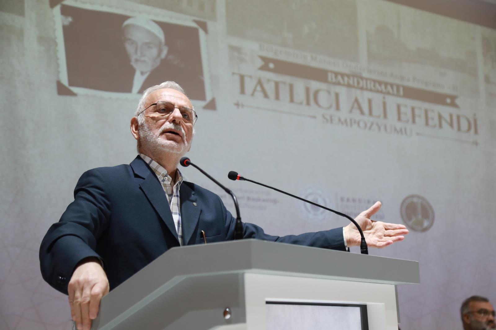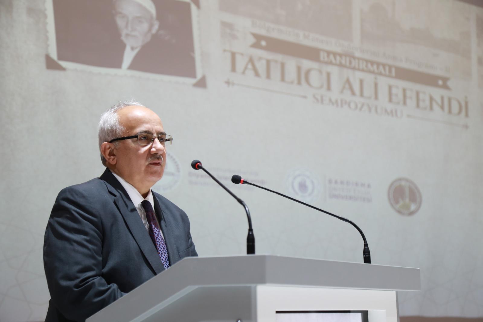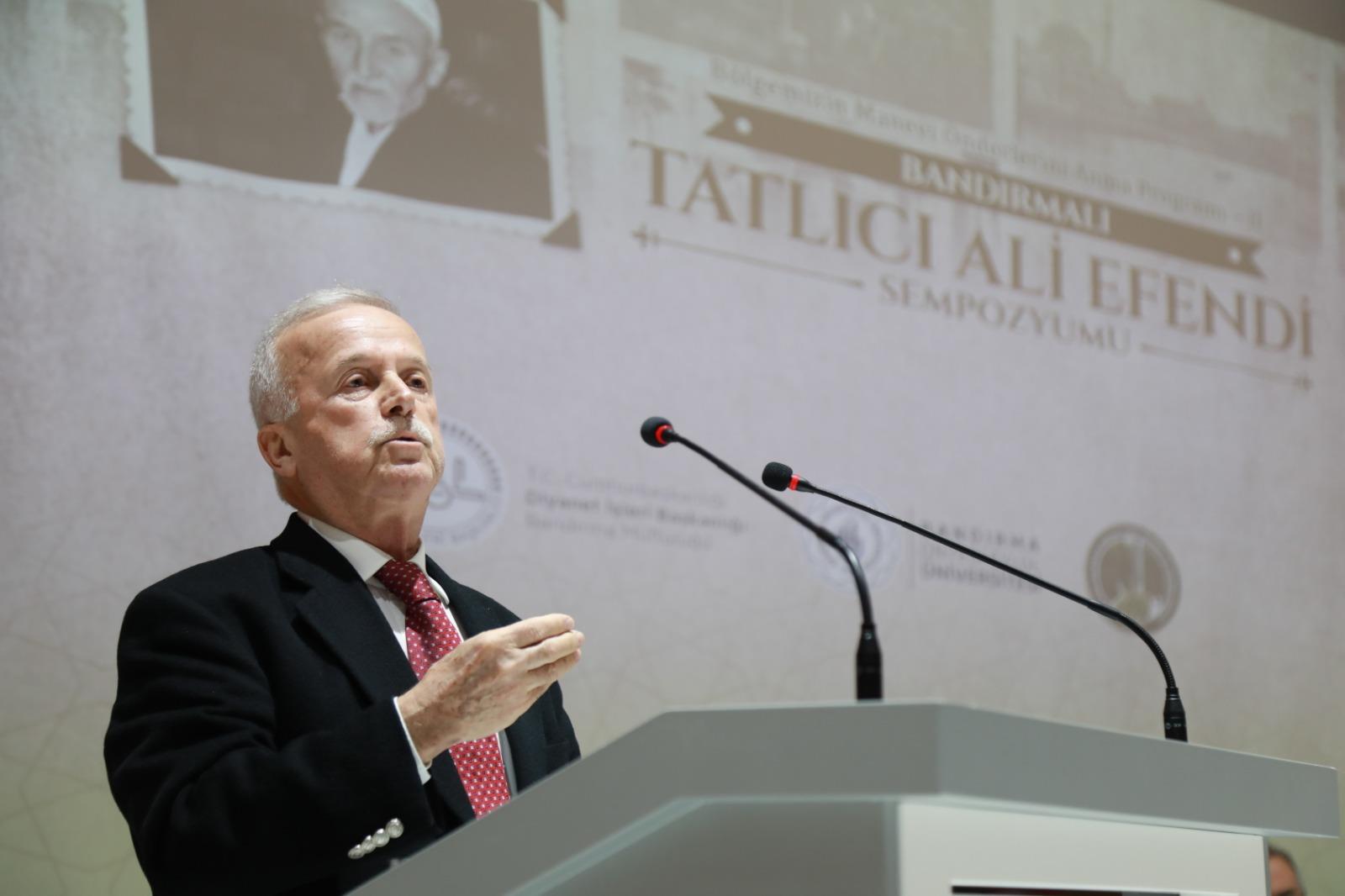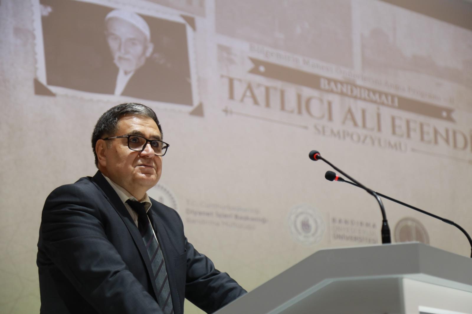 Konuşmasının devamında; “Anma programlarının ilkini geçen yıl Gönen’de Gönen İlçe Müftülüğümüz ve Gönen Belediyesi’yle birlikte Gönenli Mehmet Efendi’yi Anma Sempozyumu düzenleyerek gerçekleştirmiştik. Bölgemizin Manevi Önderlerini Anma Programı’nın ikincisini ise “Bandırmalı Tatlıcı Ali Efendi Sempozyumu” ile devam ettiriyoruz. Bu programı da Bandırma İlçe Müftülüğü'müz ve merhum Tatlıcı Ali Amca’nın kabrinin bulunduğu Tekke Hacı Ali Rıza El-Bezzaz Camii Onarma ve Yaşatma Derneği'miz ile birlikte gerçekleştiriyoruz. İlçe Müftümüz Hamdi Gevher Beyefendi’ye, dernek başkanımız Adem Turhan Beyefendi’ye bu programın gerçekleştirilmesi için göstermiş oldukları gayretlerinden dolayı çok teşekkür ediyorum. Bölgemizdeki Manevi Önderlerimizi Anma Programı vesilesiyle, Üsküp’ten Bandırma’ya göçmüş bir dervişten, Tatlıcı Ali Efendi’den bahsedeceğiz bugün. Bu sempozyum ile Tatlıcı Ali Efendi’yi hem anmaya hem de anlamaya çalışacağız. İfade etmek isterim ki, muhterem Tatlıcı Ali Öztaylan Efendi’yi gıyaben de olsa tanıma şerefine erişmiş olmak sadece Bandırma’daki görevimiz değil, fani yaşamımızın da en önemli kazanımlarından birisi olmuştur. Bandırmalılar’ın Ali Ağabey’i, yoksulların yardımcısı, gönlü kırılmışların teselli edicisi, dışlanmışların sığınağı, kimsesizlerin ahbabıdır o. Kamil insan, güzel insan tanımına en güzel uyan kişilerden biridir o. Aynı zamanda kadim medeniyetimizin son temsilcilerindedir. Onun dükkânında ve hanesinde, meşhur hattatların hatlarıyla, Tahirü’l-Mevlevi’nin Divanı’nı, Süheyl Ünver’in eserleriyle Kütahyalı Ressam Ahmed’in Şaheserleri’ni yan yana görebilirsiniz. Neyzen Tevfik’le ahbaplık etmiş, Hattat Necmettin Okyay’ın arkadaşı olmuş, Fuat Köprülü, Şemsettin Günaltay, İbnü’l Emin Mahmut Kemal, Mehmet Akif Ersoy, Necip Fazıl, Hasan Basri Çantay ve sayamadığımız çok sayıda sanat, kültür, fikir ve siyaset dünyasının önde gelen isimleriyle yakın dostluk kurmuş bir Osmanlı Beyefendisi’dir Tatlıcı Ali Efendi.” ifadelerine yer verdi.