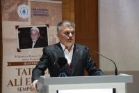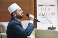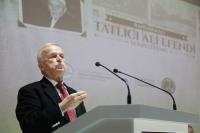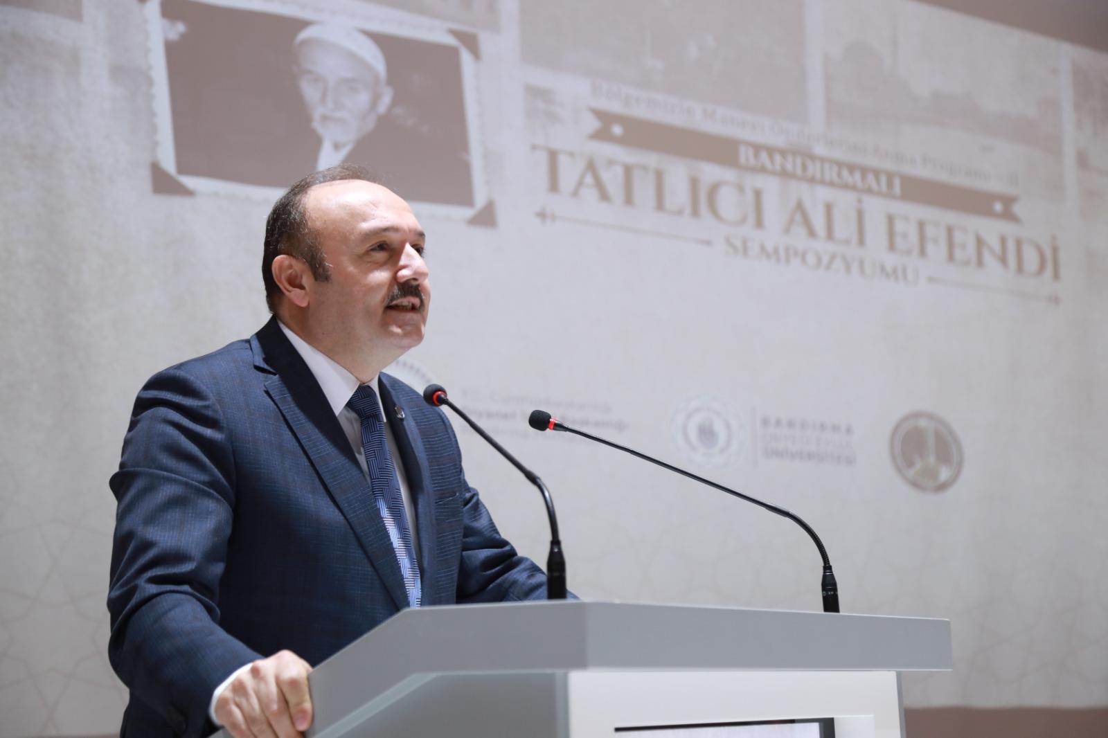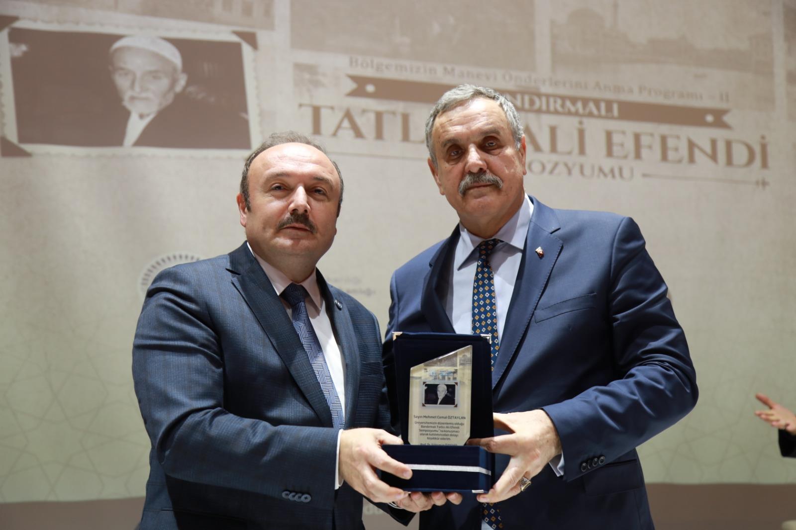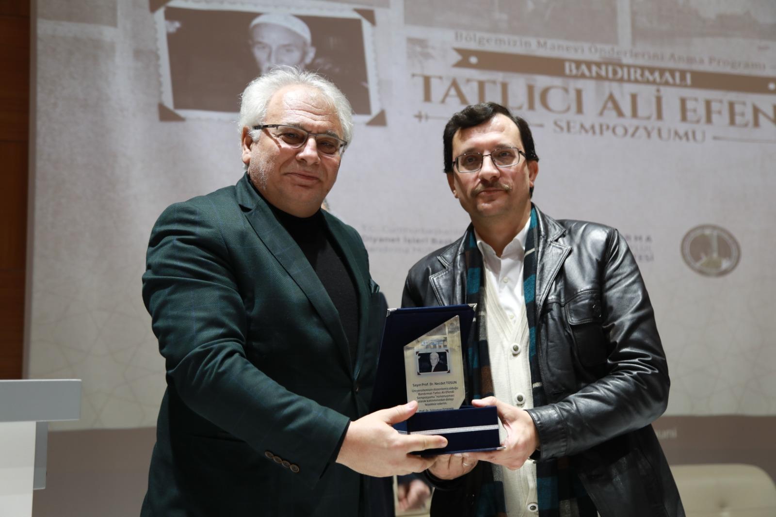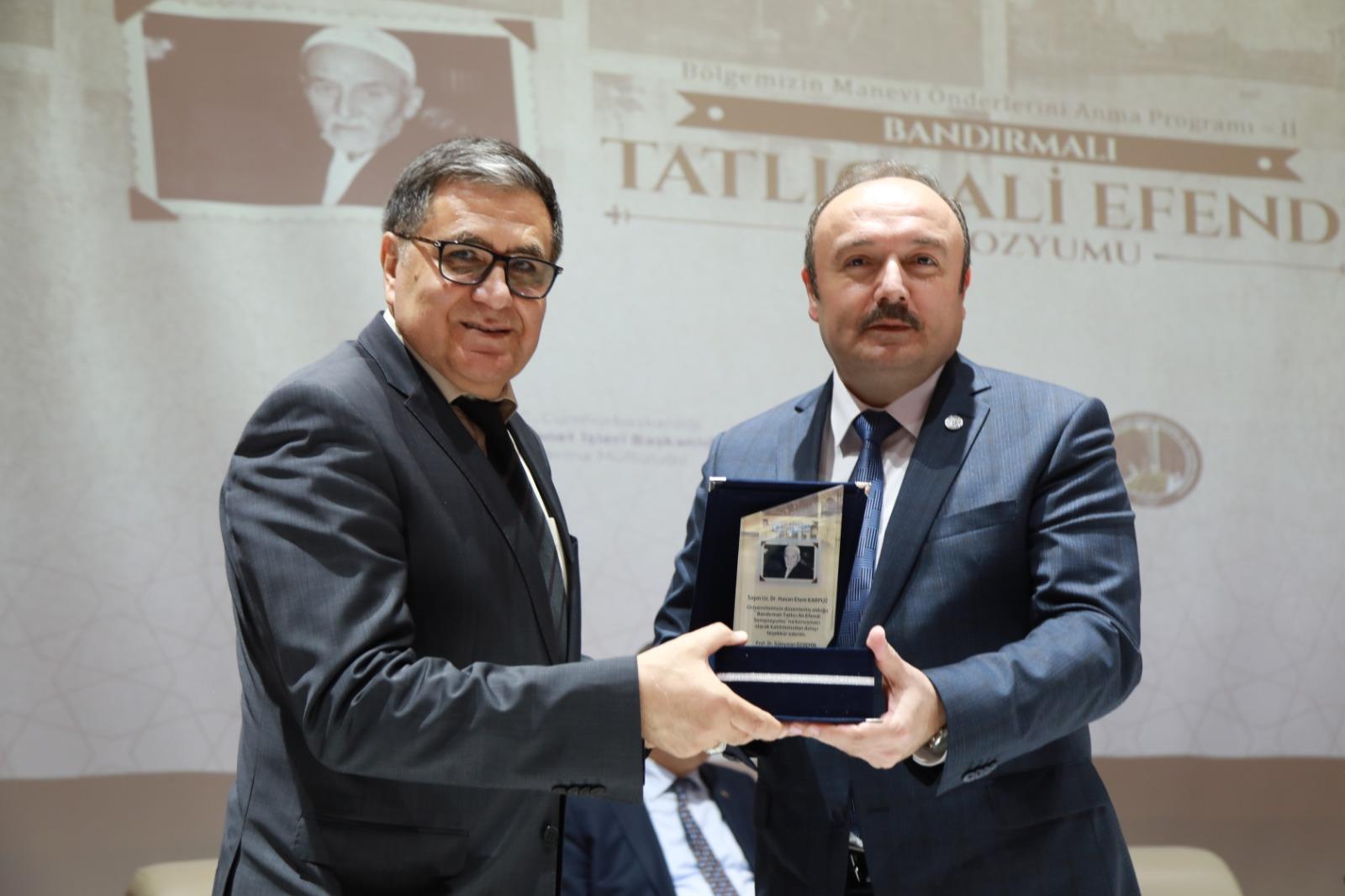 Konuşmasının devamında; “Anma programlarının ilkini geçen yıl Gönen’de Gönen İlçe Müftülüğümüz ve Gönen Belediyesi’yle birlikte Gönenli Mehmet Efendi’yi Anma Sempozyumu düzenleyerek gerçekleştirmiştik. Bölgemizin Manevi Önderlerini Anma Programı’nın ikincisini ise “Bandırmalı Tatlıcı Ali Efendi Sempozyumu” ile devam ettiriyoruz. Bu programı da Bandırma İlçe Müftülüğü'müz ve merhum Tatlıcı Ali Amca’nın kabrinin bulunduğu Tekke Hacı Ali Rıza El-Bezzaz Camii Onarma ve Yaşatma Derneği'miz ile birlikte gerçekleştiriyoruz. İlçe Müftümüz Hamdi Gevher Beyefendi’ye, dernek başkanımız Adem Turhan Beyefendi’ye bu programın gerçekleştirilmesi için göstermiş oldukları gayretlerinden dolayı çok teşekkür ediyorum. Bölgemizdeki Manevi Önderlerimizi Anma Programı vesilesiyle, Üsküp’ten Bandırma’ya göçmüş bir dervişten, Tatlıcı Ali Efendi’den bahsedeceğiz bugün. Bu sempozyum ile Tatlıcı Ali Efendi’yi hem anmaya hem de anlamaya çalışacağız. İfade etmek isterim ki, muhterem Tatlıcı Ali Öztaylan Efendi’yi gıyaben de olsa tanıma şerefine erişmiş olmak sadece Bandırma’daki görevimiz değil, fani yaşamımızın da en önemli kazanımlarından birisi olmuştur. Bandırmalılar’ın Ali Ağabey’i, yoksulların yardımcısı, gönlü kırılmışların teselli edicisi, dışlanmışların sığınağı, kimsesizlerin ahbabıdır o. Kamil insan, güzel insan tanımına en güzel uyan kişilerden biridir o. Aynı zamanda kadim medeniyetimizin son temsilcilerindedir. Onun dükkânında ve hanesinde, meşhur hattatların hatlarıyla, Tahirü’l-Mevlevi’nin Divanı’nı, Süheyl Ünver’in eserleriyle Kütahyalı Ressam Ahmed’in Şaheserleri’ni yan yana görebilirsiniz. Neyzen Tevfik’le ahbaplık etmiş, Hattat Necmettin Okyay’ın arkadaşı olmuş, Fuat Köprülü, Şemsettin Günaltay, İbnü’l Emin Mahmut Kemal, Mehmet Akif Ersoy, Necip Fazıl, Hasan Basri Çantay ve sayamadığımız çok sayıda sanat, kültür, fikir ve siyaset dünyasının önde gelen isimleriyle yakın dostluk kurmuş bir Osmanlı Beyefendisi’dir Tatlıcı Ali Efendi.” ifadelerine yer verdi.