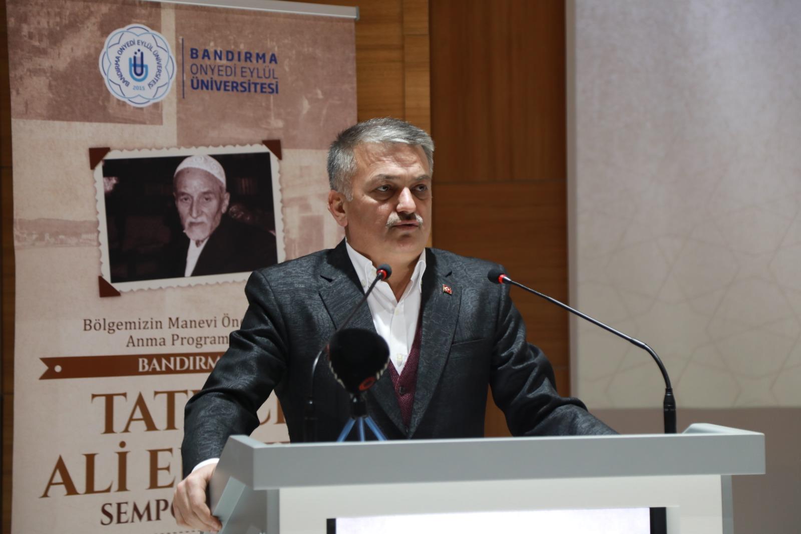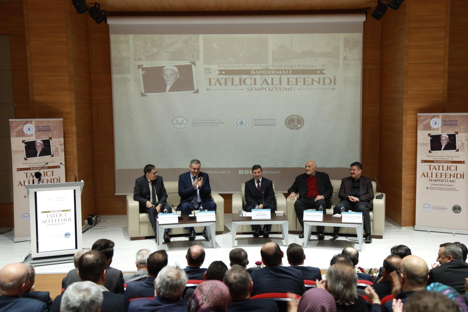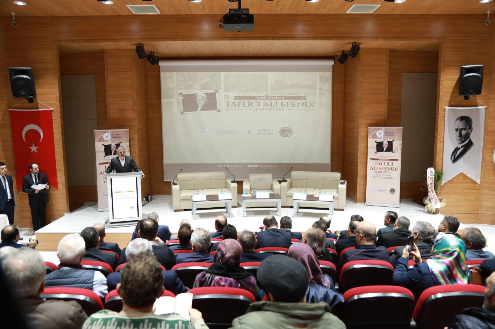 Balıkesir Valisi Ersin Yazıcı ise İdlib’te Türk Silahlı Kuvvetlerimize yönelik gerçekleşen hain saldırıda hayatını kaybeden askerlerimize rahmet, yaralı askerlerimize acil şifalar dileyerek başladığı konuşmasını “Biz binlerce şehit veririz ama bir çakıl taşını bile teslim etmeyiz. Şehrimizin sevilen, saygı duyulan çok kıymetli bir manevi şahsiyet olan Tatlıcı Ali Efendi için düzenlenen bu sempozyumda bu gönül dostu insanı anmak için bu salonu dolduran siz değerli katılımcıları tebrik ediyorum. Sempozyumu düzenleyen başta Bandırma Onyedi Eylül Üniversitesi Rektörümüze ve Bandırma Müftümüze de bu anlamlı ve güzel programdan dolayı teşekkür ediyorum” diyerek tamamladı.