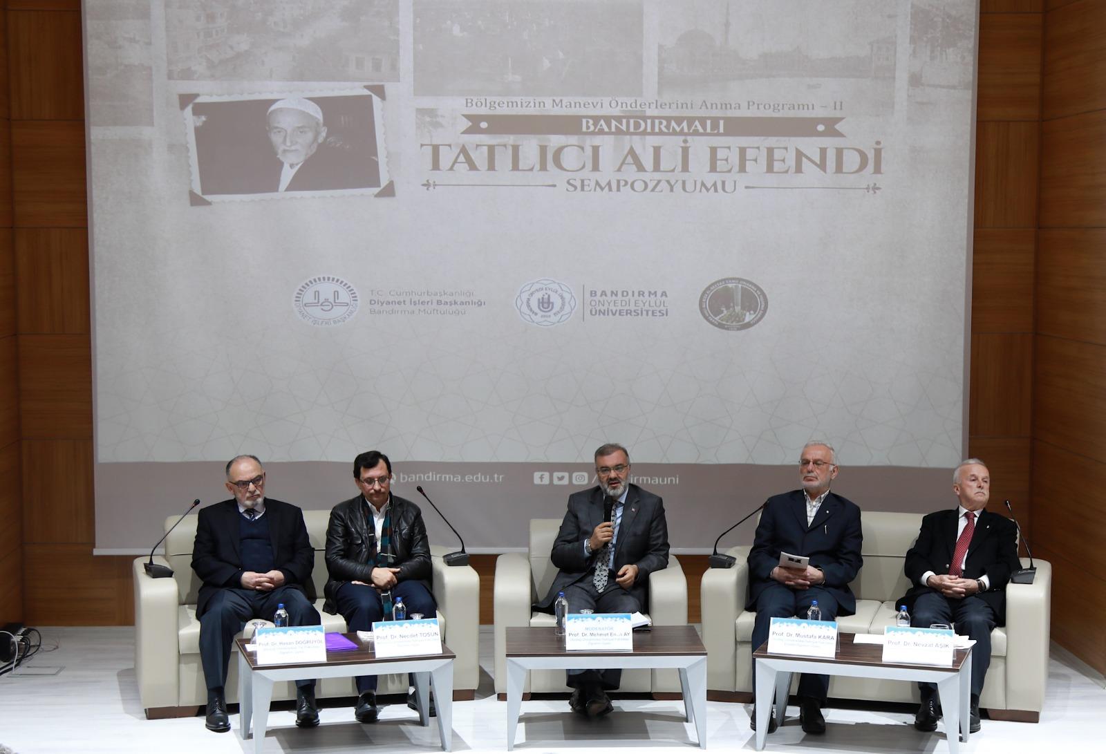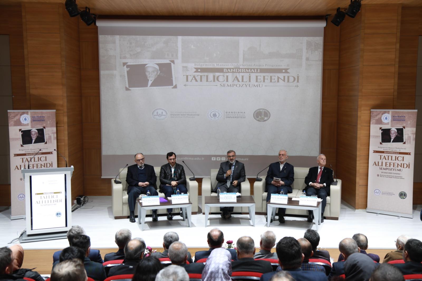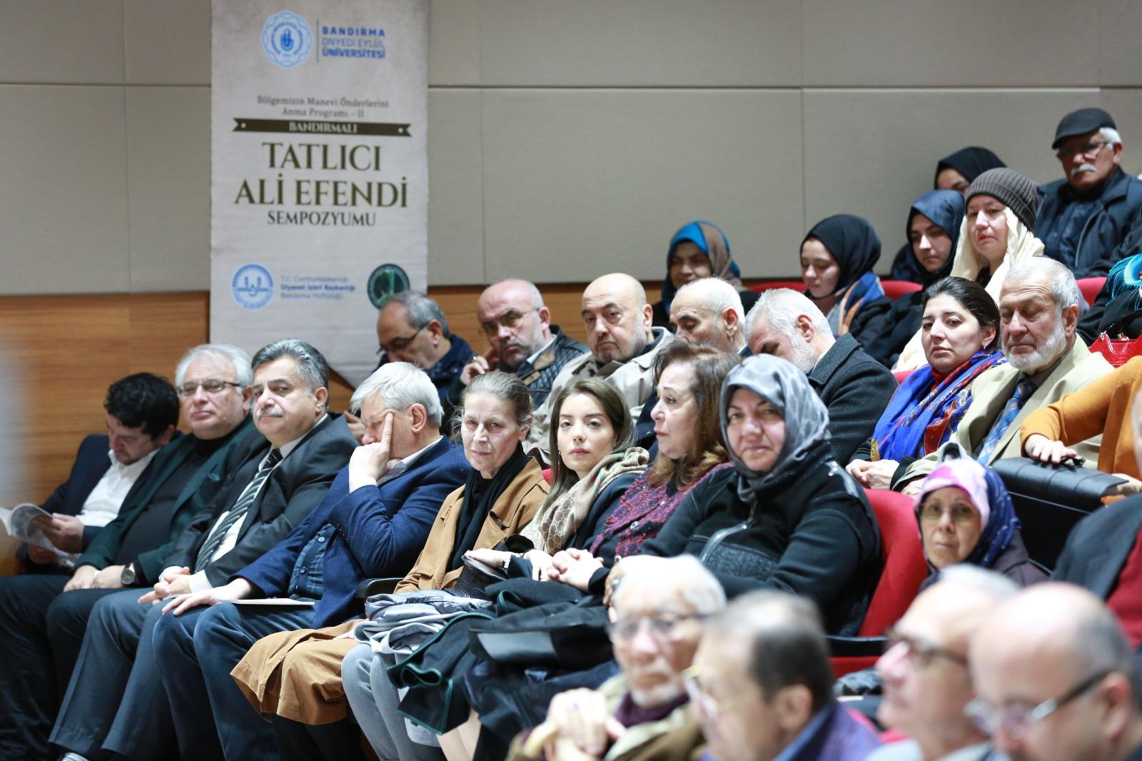 Balıkesir Valisi Ersin Yazıcı ise İdlib’te Türk Silahlı Kuvvetlerimize yönelik gerçekleşen hain saldırıda hayatını kaybeden askerlerimize rahmet, yaralı askerlerimize acil şifalar dileyerek başladığı konuşmasını “Biz binlerce şehit veririz ama bir çakıl taşını bile teslim etmeyiz. Şehrimizin sevilen, saygı duyulan çok kıymetli bir manevi şahsiyet olan Tatlıcı Ali Efendi için düzenlenen bu sempozyumda bu gönül dostu insanı anmak için bu salonu dolduran siz değerli katılımcıları tebrik ediyorum. Sempozyumu düzenleyen başta Bandırma Onyedi Eylül Üniversitesi Rektörümüze ve Bandırma Müftümüze de bu anlamlı ve güzel programdan dolayı teşekkür ediyorum” diyerek tamamladı.