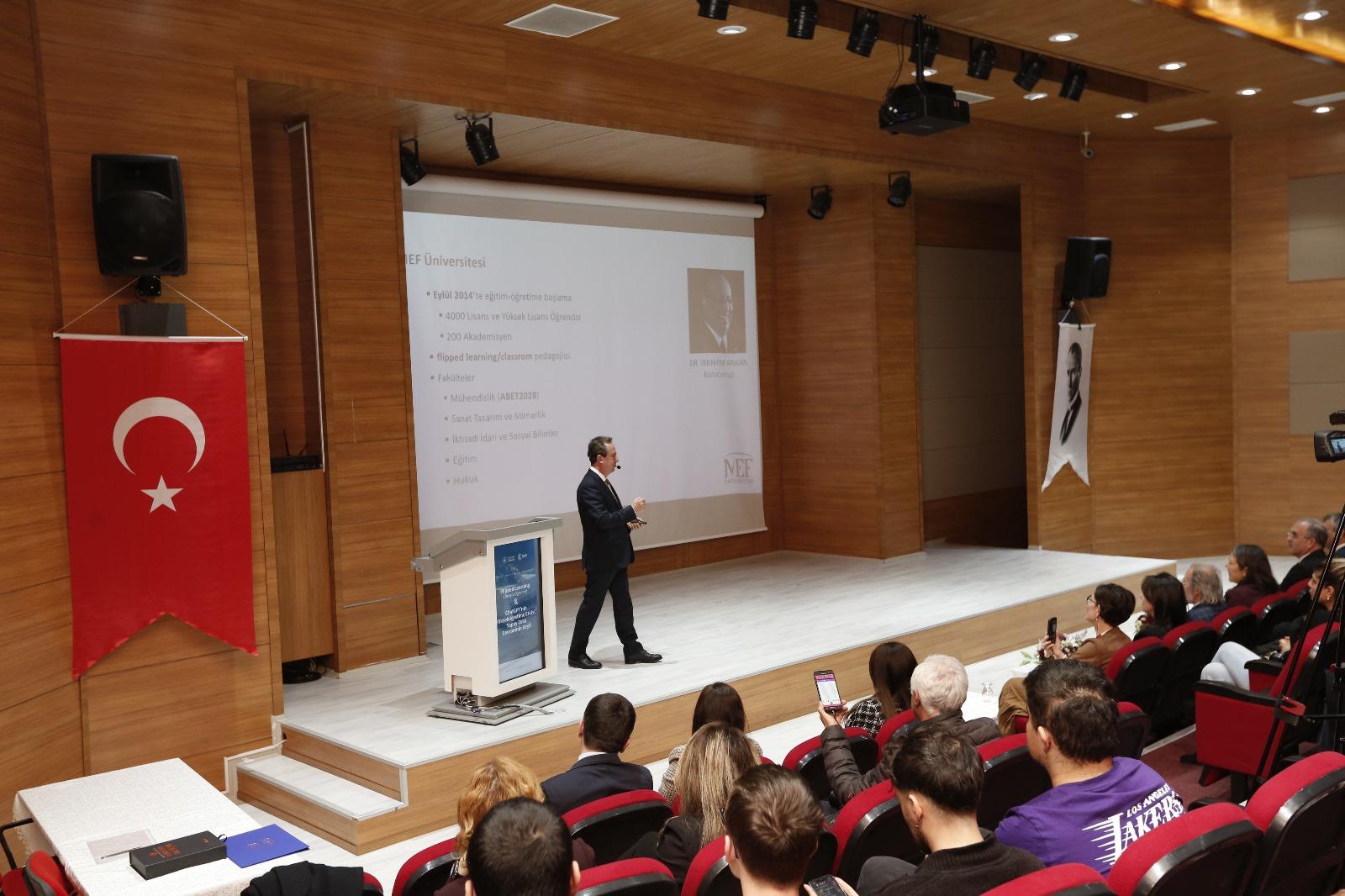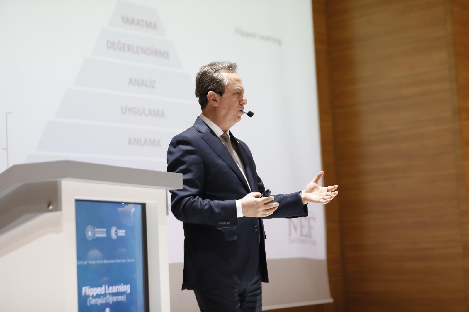Seminerin davetli konuşmacısı Prof. Dr. Muhammed Şahin, gerçekleştirdiği sunum ile önce MEF Üniversitesi’nin eğitim-öğretime başladığı ve 2014 yılından bu yana tüm derslerde uyguladığı Flipped Learning/Tersyüz Öğrenme Modeli’ni anlattı. Rektör Şahin, yükseköğretim süreçlerinde yenilikçi bir yol izlediklerini ve MEF Üniversitesi’nde teknolojik altyapıya önemli yatırımlar yaptıklarını ifade etti. Şahin, yapay zeka destekli ve adaptif öğrenme uyumlu dijital kaynaklar ile öğrencinin öğrenme hızına göre şekillenen alt yapı sayesinde kısa vadede önemli geri dönüş aldıklarını belirtti. Son bir yılda ChatGPT’nin gündeme gelmesiyle birlikte yapay zekanın yükseköğretime etkisini örnekler ve uygulamalar üzerinden bahsederek konuşmasını sürdürdü.
