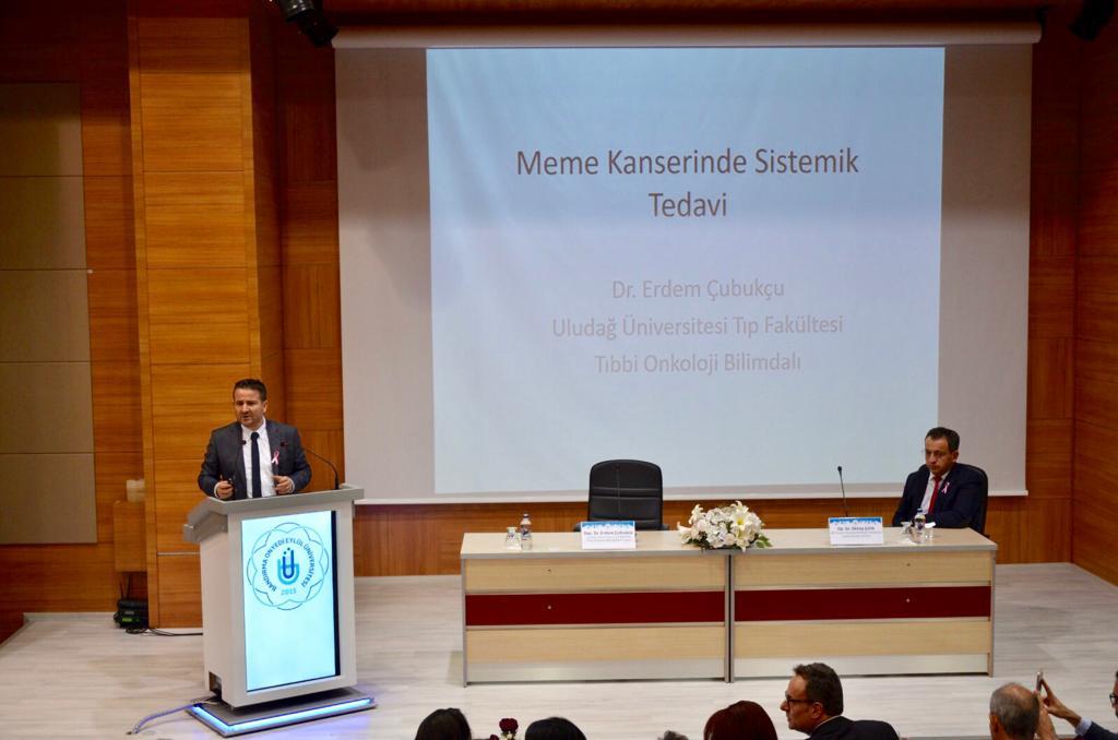Düzenlenen seminerin ilk konuşmacısı ise Uludağ Üniversitesi Tıp Fakültesi Tıbbi Onkoloji Anabilim Dalı Öğretim Üyesi Doç. Dr. Erdem Çubukçu oldu. Onkolojik tedavilerin gelişim süreci, sağ kalım, meme kanseri ve çeşitleri, yaşam kalitesi, tedavi etkinliği ve meme kanserinde kemoterapi hakkında bir sunum yapan Çubukçu, “Bu ay meme sağlığı farkındalık ayı. Bu sebeple hemen hemen her bölgede farkındalığı artırmak adına çeşitli sempozyum ve seminerler düzenleniyor. Kanser son dönemlerde ciddi anlamda büyük bir halk sağlığı sorunu haline gelmeye başladı. Her yıl 17 milyona yakın insan kansere yakalanıyor. Her yıl 7 ila 8 milyon insan kanser sebebiyle hayatını kaybediyor. Meme kanseri ise dünyada her yıl 1.38 milyon insanda karşımıza çıkıyor ve 0.46 milyon insanın ölümüne sebep oluyor. Son dönemlerde yapılan çalışmalar erken tanının önemini bizlere gösteriyor.” dedi.