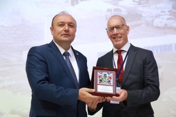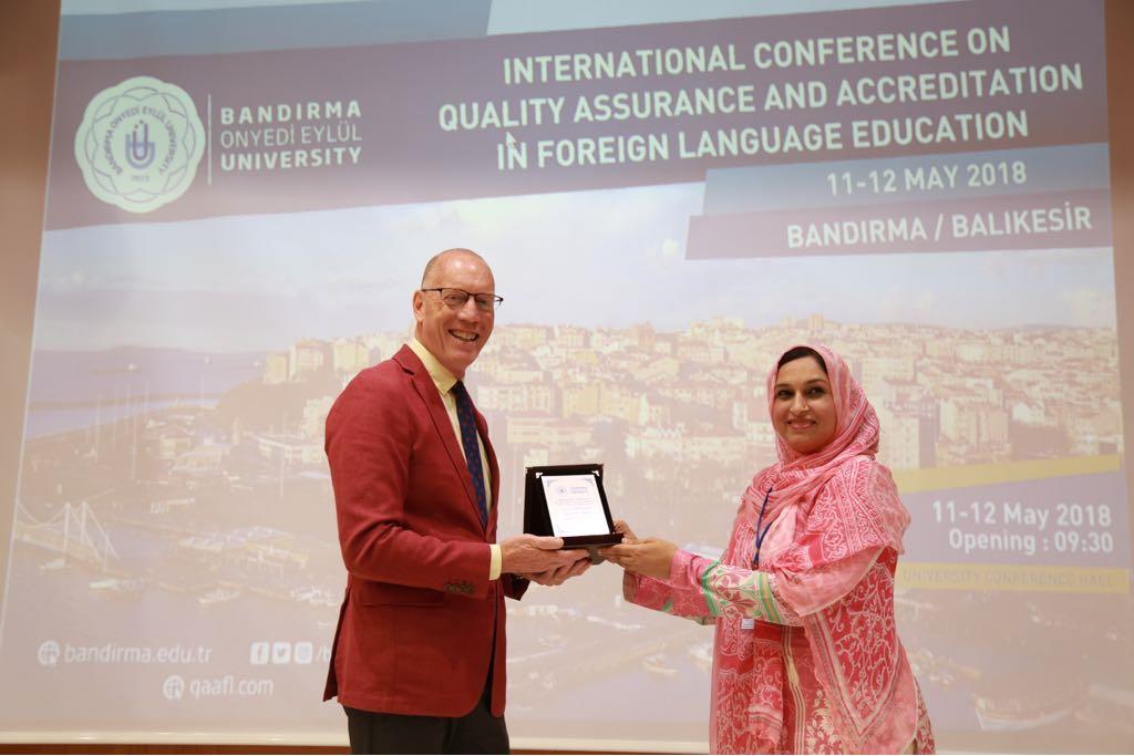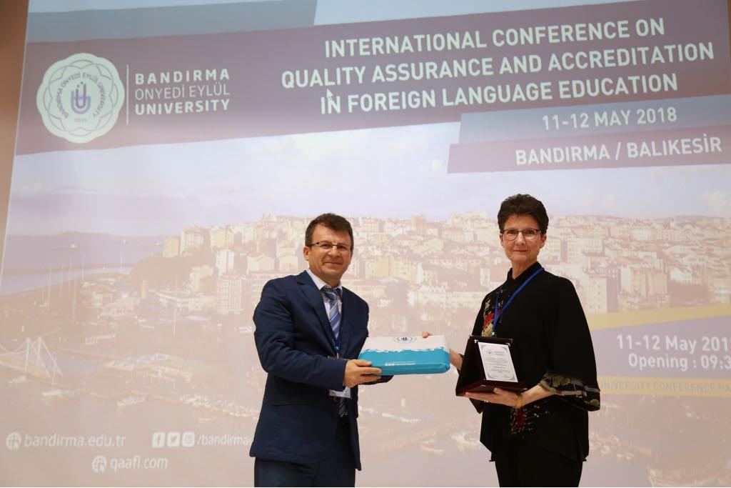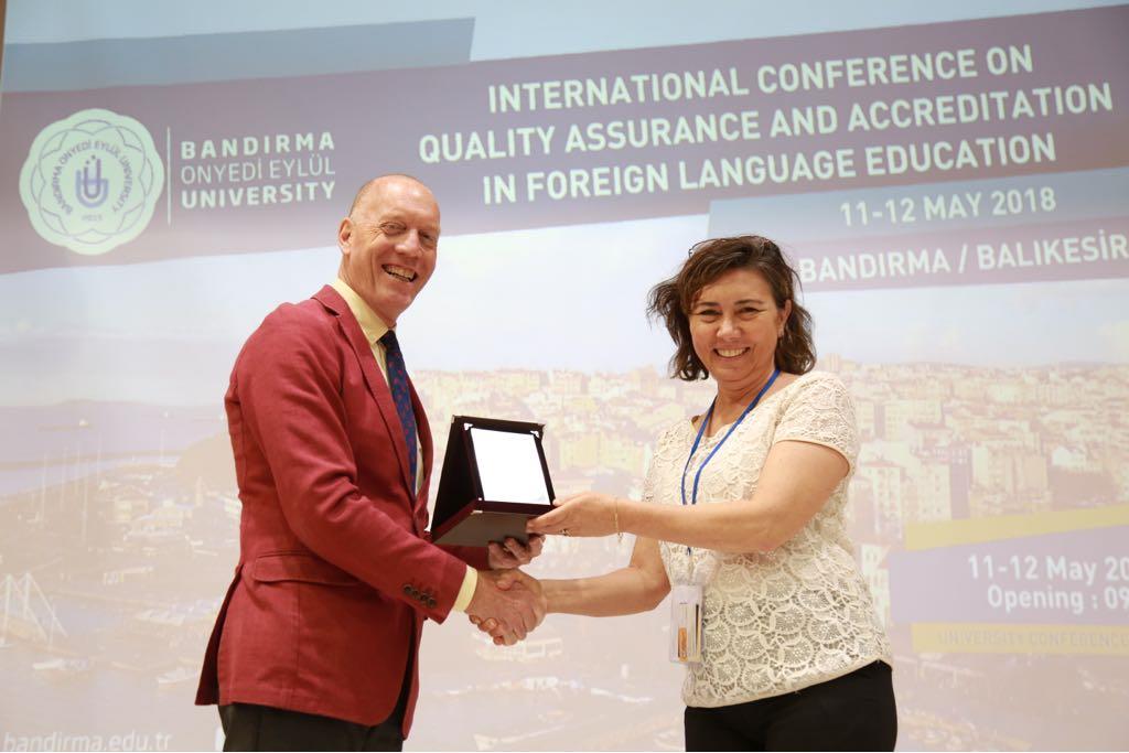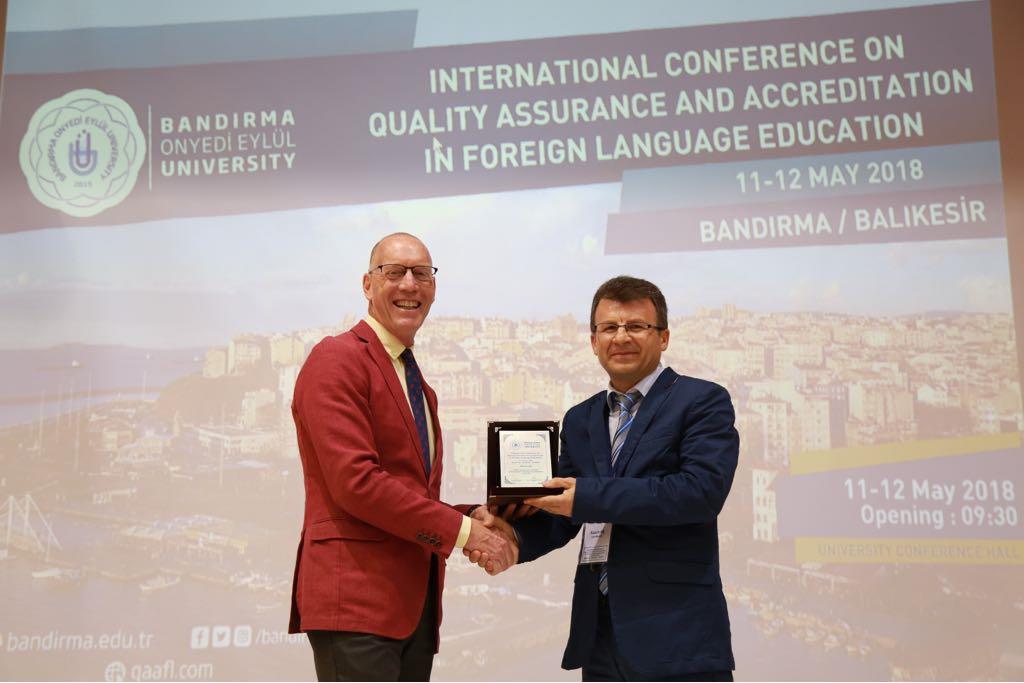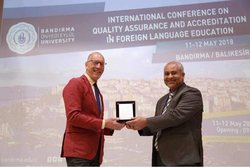 Yabancı dil eğitiminde kalite ve akreditasyonun önemine vurgu yapan Rektörümüz Prof. Dr. Süleyman Özdemir konuşmasının sonunda Düzenleme Komitesi Başkanı Dr. Donald Staub ve Konferans Koordinatörü Öğr. Gör. Kazım Ar’a katkılarından dolayı üniversitemiz adına plaket takdiminde bulundu. Konferans Düzenleme Komitesi Başkanı Dr. Donald Staub’da Rektörümüz Prof. Dr. Süleyman Özdemir’e konferansa vermiş olduğu büyük destek nedeniyle teşekkür plaketi sundu.