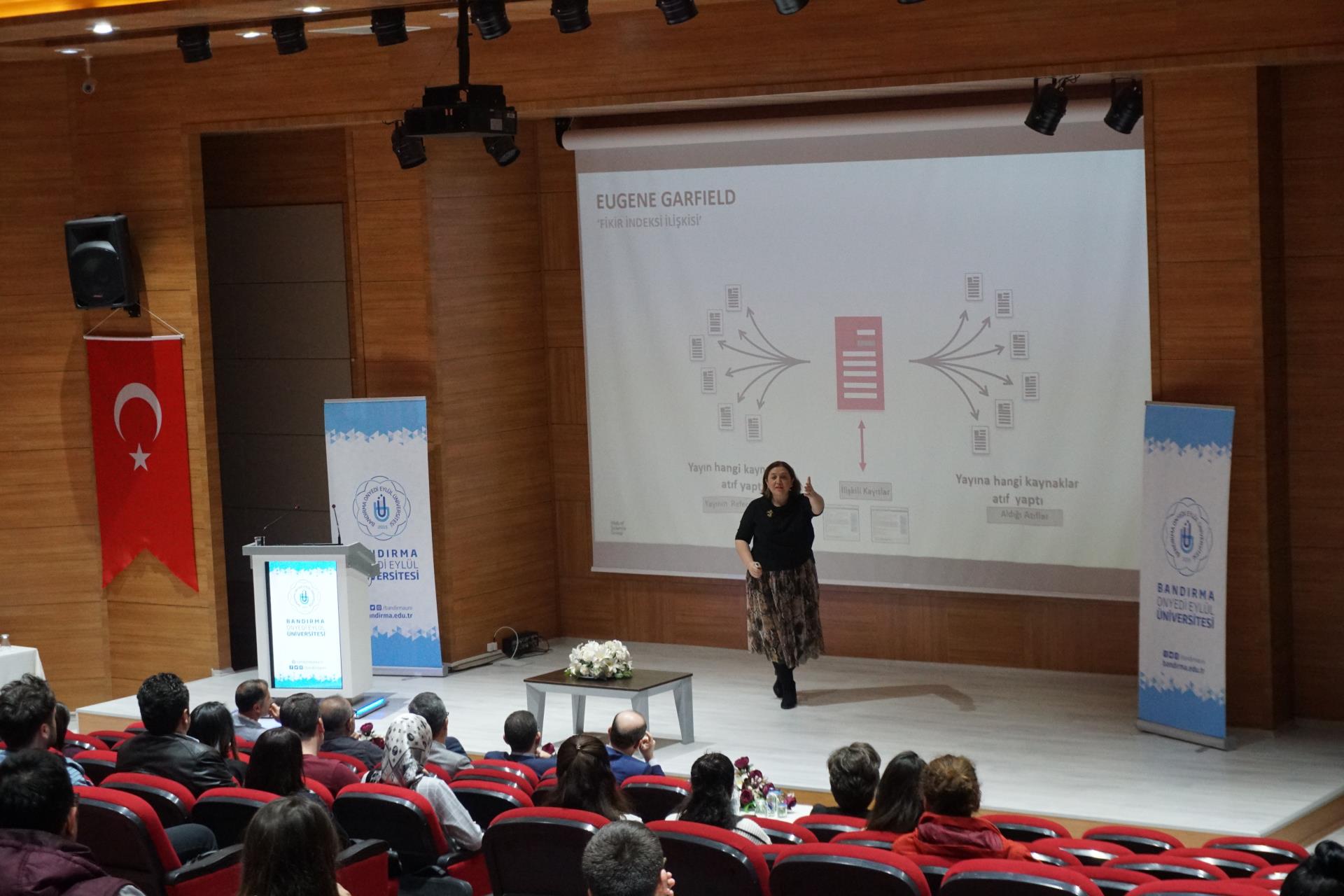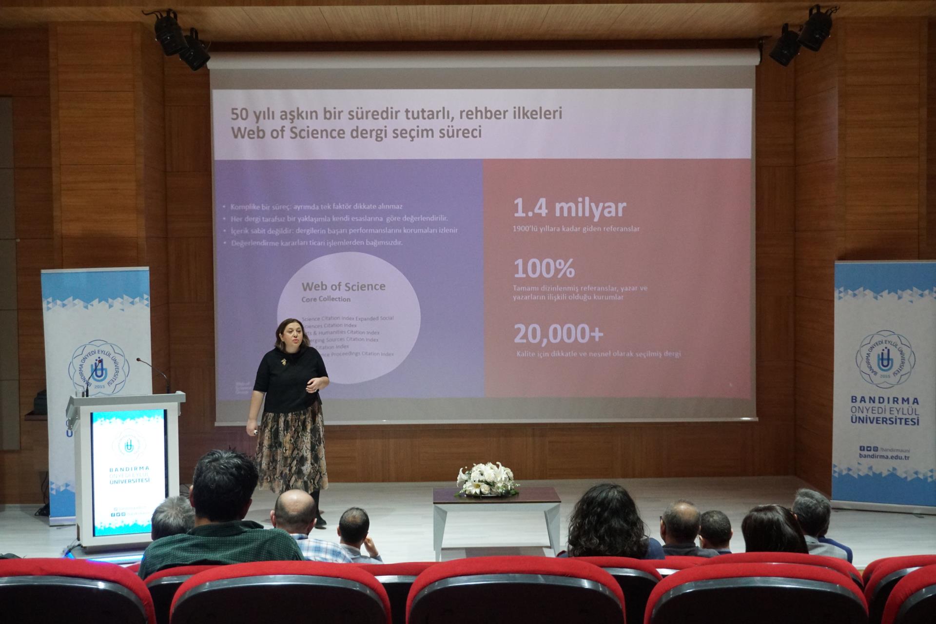 Rektörlük Konferans Salonumuzda düzenlenen eğitimin konuşmacısı, Clarivate Analytics Firması’nın Türkiye Sorumlusu Derya Soğuksu oldu.