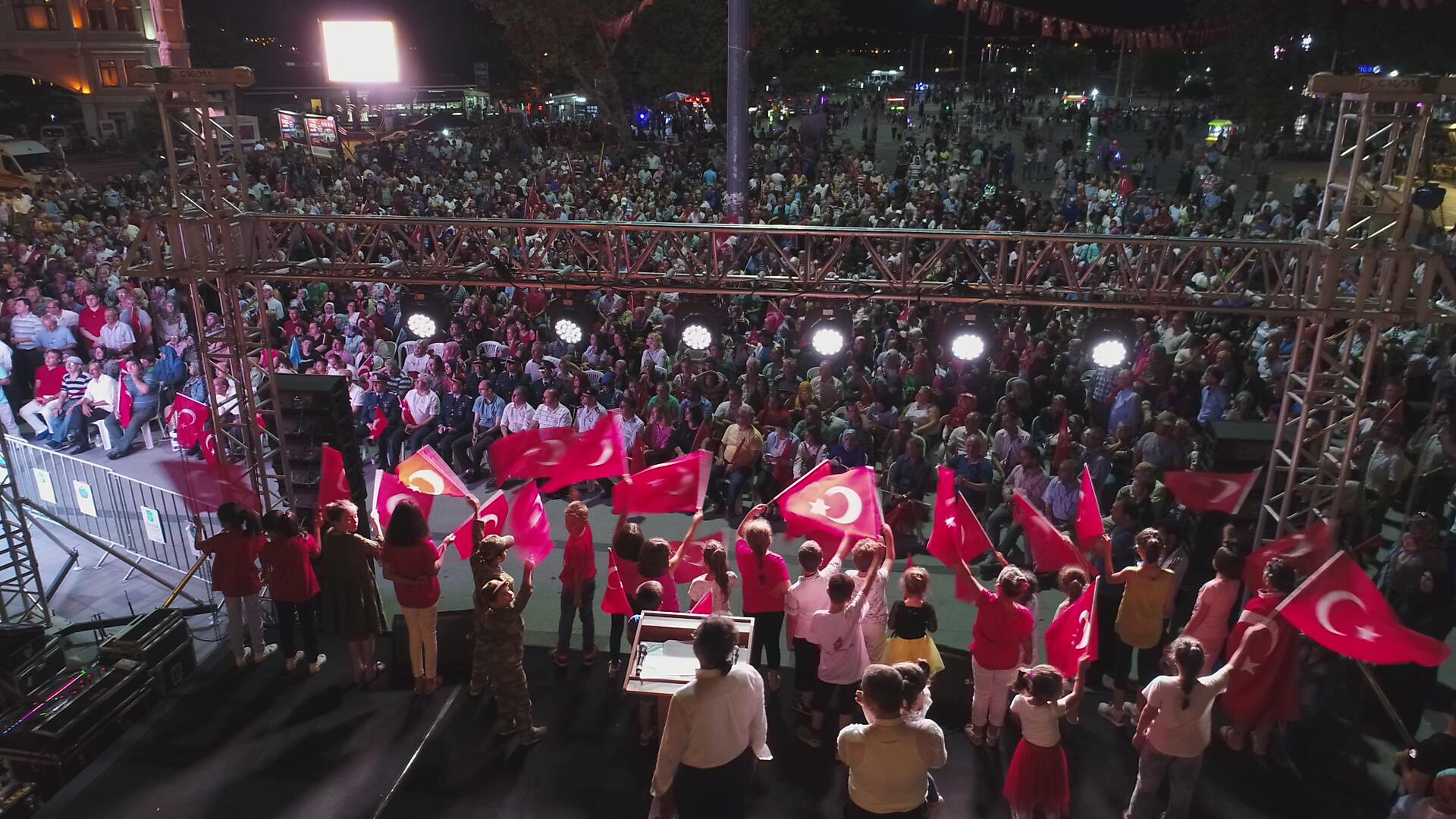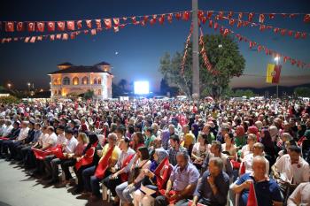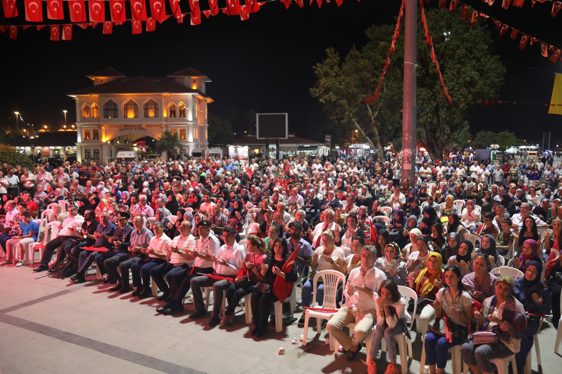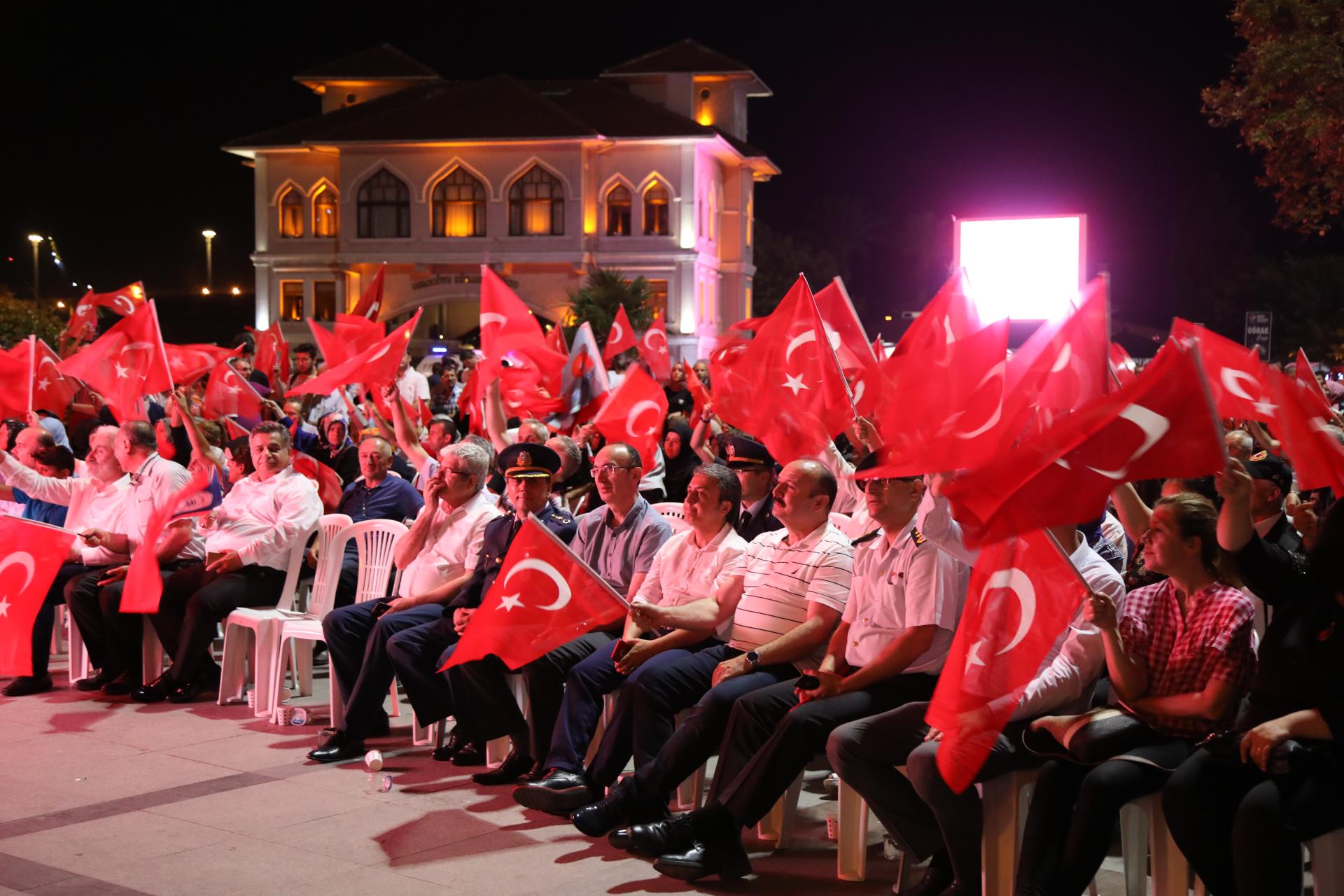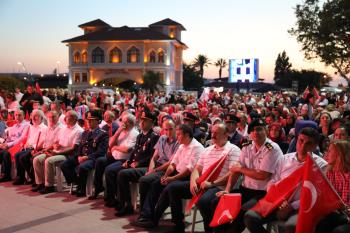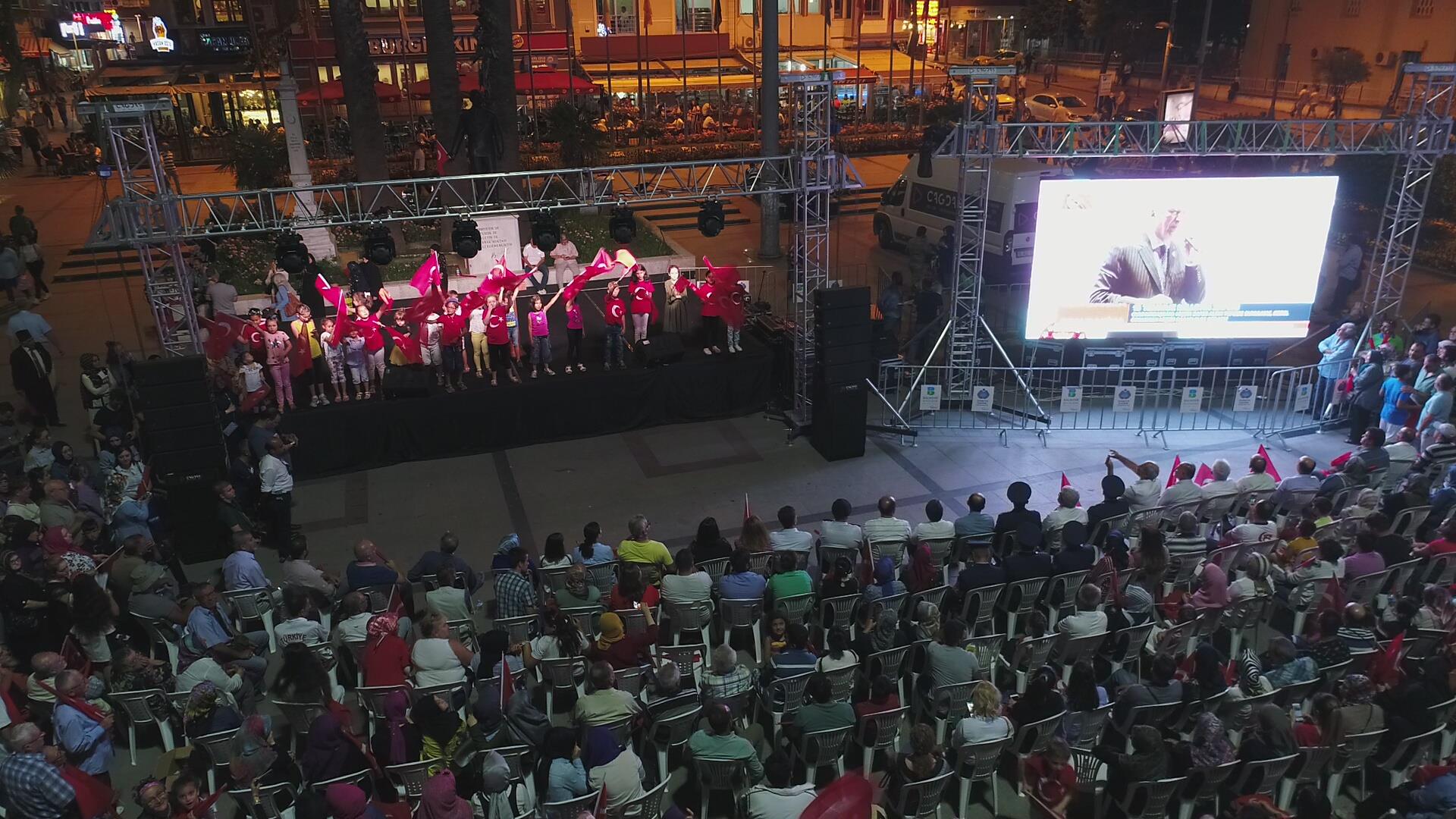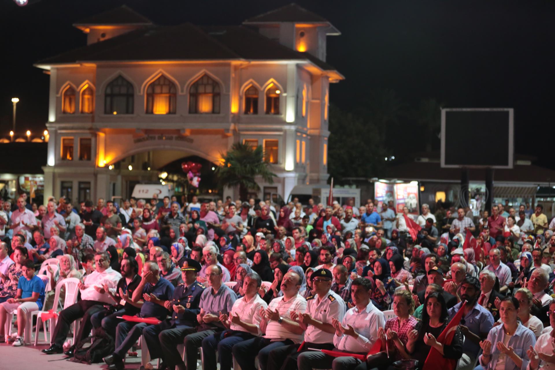 Saygı duruşu ve İstiklal Marşı’mızın okunması ile başlayan program sinevizyon gösterimleriyle devam etti. Belgesel ve sinevizyon gösterimleri esnasında izleyicilerin gözyaşlarına hakim olamadığı duygusal anlar yaşandı. Gecenin ilerleyen saatlerinde Cumhurbaşkanımız Recep Tayyip Erdoğan’ın yaptığı konuşma barkovizyon aracılığıyla katılımcılara izletildi. 15 Temmuz için yazılan marşların çalınması, şiirlerin okunması ve belgesel gösterimleriyle devam etti. Program 00.13’ te okunan selaların dinlenmesinin ardından Bandırma İlçe Müftüsü Süleyman Küçük’ün şehitlerimiz için yaptığı dua ile son buldu.