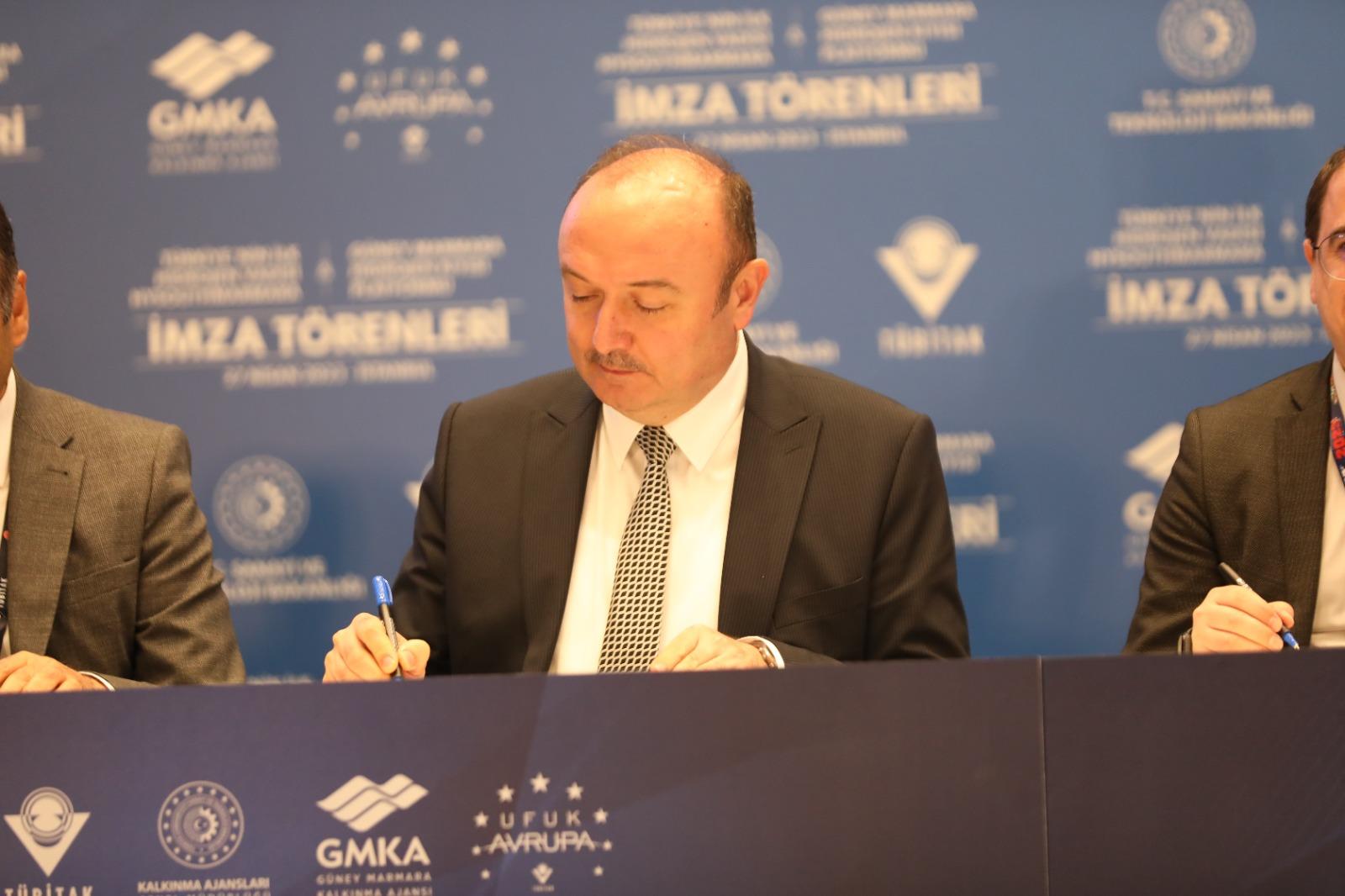 HySouthMarmara ile Güney Marmara Hidrojen Kıyısı Platformu Güdümlü Proje Tanıtım filmlerinin gösterimi ile başlayan programda Güney Marmara Kalkınma Ajansı Genel Sekreteri Abdullah Güç ve TÜBİTAK Başkanı Prof. Dr. Hasan Mandal’ın konuşmalarının ardından Sanayi ve Teknoloji Bakanı Mustafa Varank ‘ın refakatleri ile imza törenleri başladı. Dokuz proje ortağının sahneye davet edilmesi ile Güney Marmara Hidrojen Kıyısı Platformu Güdümlü Projesi İmza Töreni, sonrasında ise 11 proje ortağının sahneye davet edilmesi ile Güney Marmara Hidrojen Kıyısı - HYSouthMarmara Konsorsiyum Anlaşması İmza Töreni gerçekleşti. İki projede de paydaş olarak yer alan Üniversitemiz adına Rektörümüz Prof. Dr. Süleyman Özdemir imza attı.