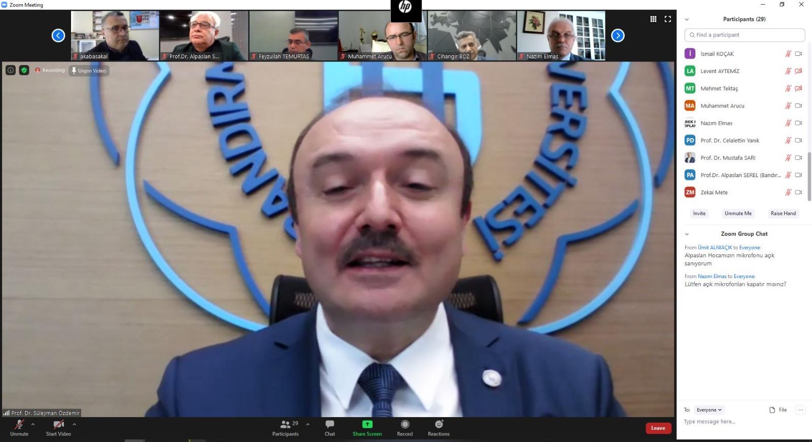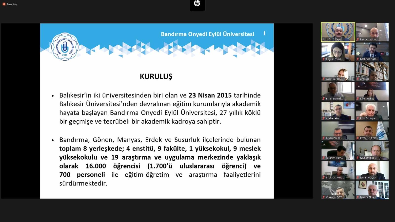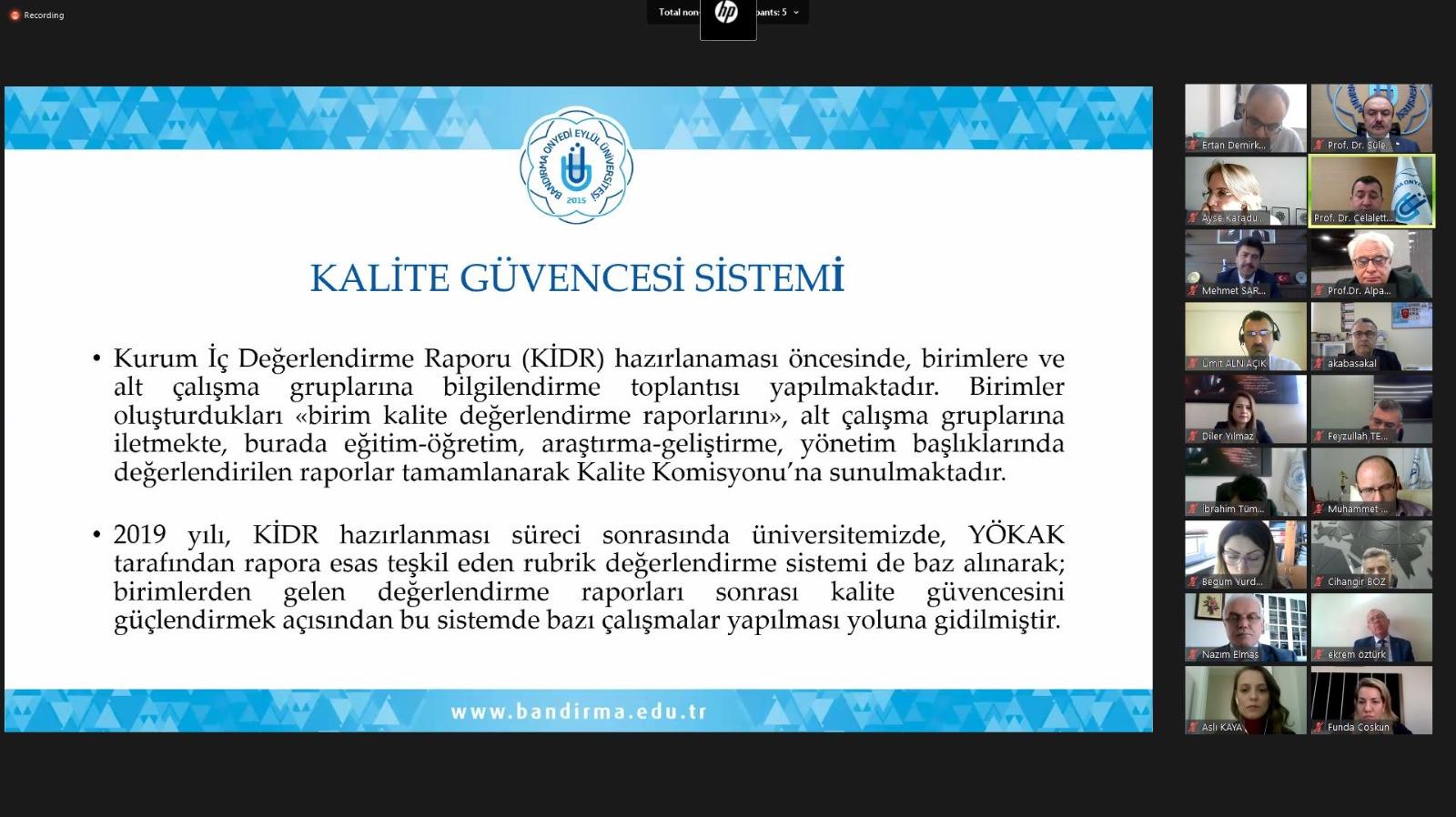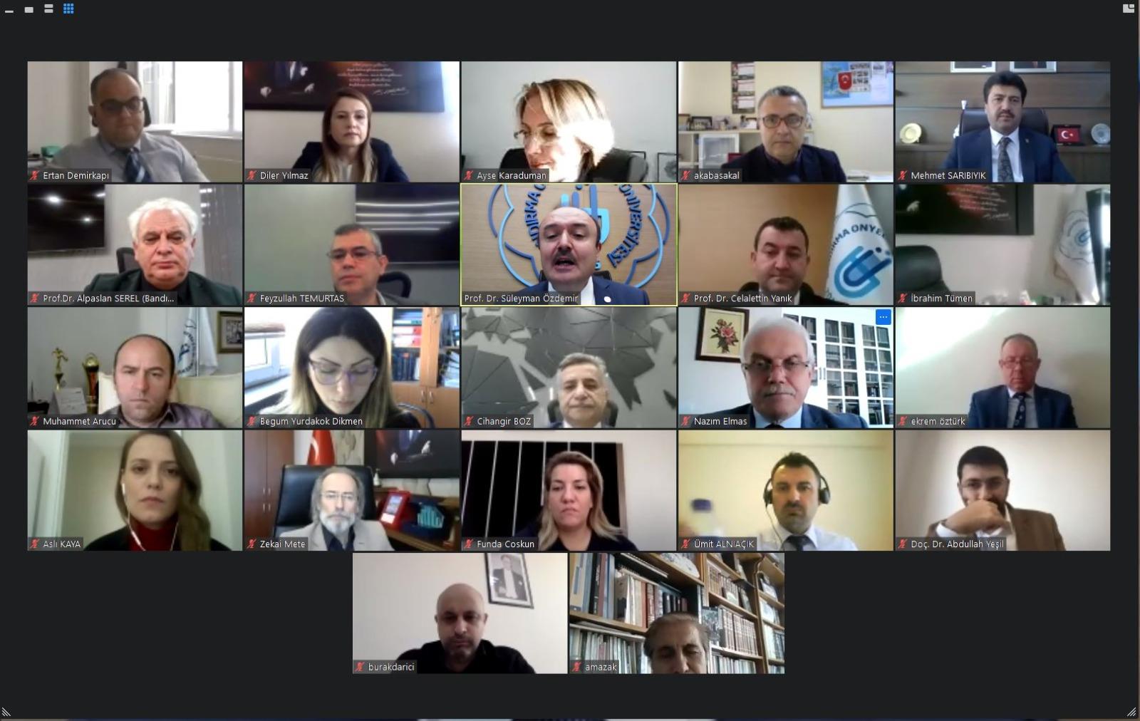 Çevrimiçi gerçekleşen toplantıya Üniversitemiz Senato Salonu’ndan katılan Rektörümüz Prof. Dr. Süleyman Özdemir, Üniversitemizin faaliyetleri, yeni açılan bölümlerimiz, öğrenci ve personel sayılarımız, devam eden inşaatlarımız ve fiziki alan konularını içeren detaylı bir sunum gerçekleştirdi. Toplantının ikinci bölümde ise, Rektör Yardımcımız, aynı zamanda Kalite Koordinatörümüz Prof. Dr. Celalettin Yanık, Üniversitemizin kalite güvence sistemi, uzaktan eğitim politikası ve 2019 yılı kurum içi değerlendirme raporunda yer alan eğitim-öğretim, araştırma-geliştirme, toplumsal katkı ve yönetim sistemleri hakkında hazırlamış olduğu sunumunu paylaştı.