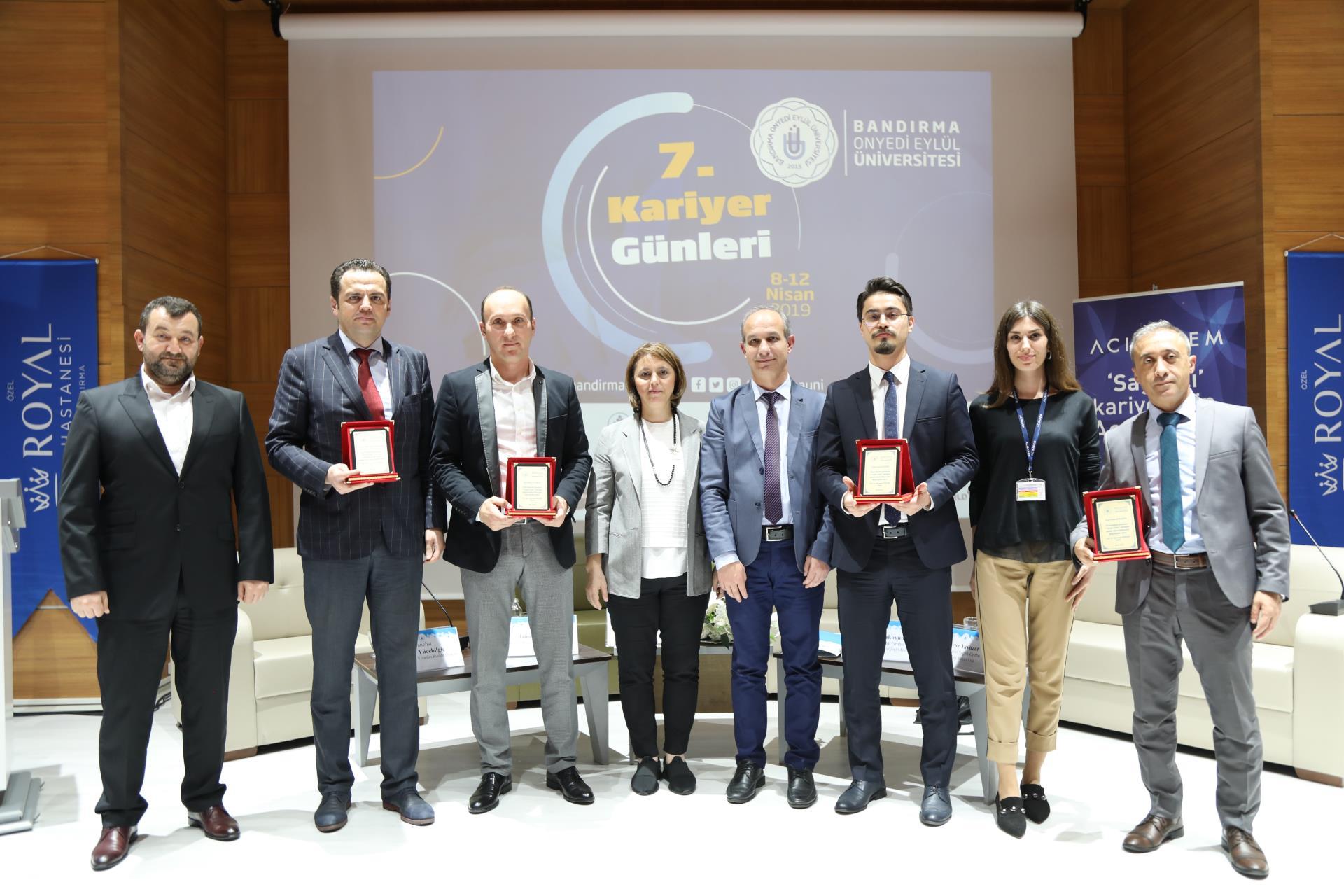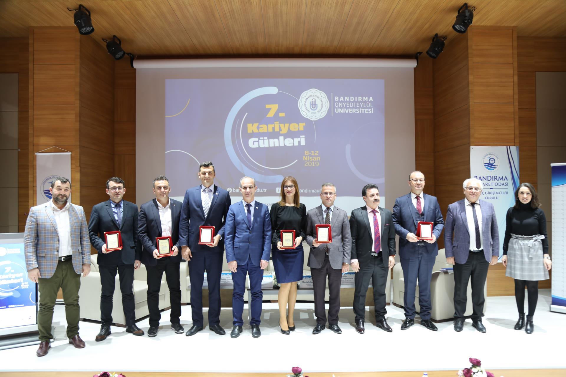 “7. Kariyer Günleri” etkinliğinin ilk gününün sabahki oturumu, gerçekleşen açılış panelinin ardından, Bandırma Kaymakamı Günhan Yazar ve Rektörümüz Prof. Dr. Süleyman Özdemir’in, gerçekleşen panelin panelistleri Balıkesir Sanayi Odası Başkanı Hasan Ali Eğinlioğlu, Balıkesir Ticaret Odası Başkanı Rahmi Kula ve Üniversitemiz Rektör Yardımcısı Prof. Dr. Suat Uğur’a plaket takdimiyle sona erdi.