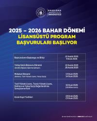 Üniversitemizde 2025–2026 Bahar Dönemi lisansüstü program başvuruları alınmaya başlandı. Tezli Yüksek Lisans, Tezsiz Yüksek Lisans, Doktora ve Yatay Geçiş başvurularına ilişkin süreç ve takvim aşağıda yer almaktadır.