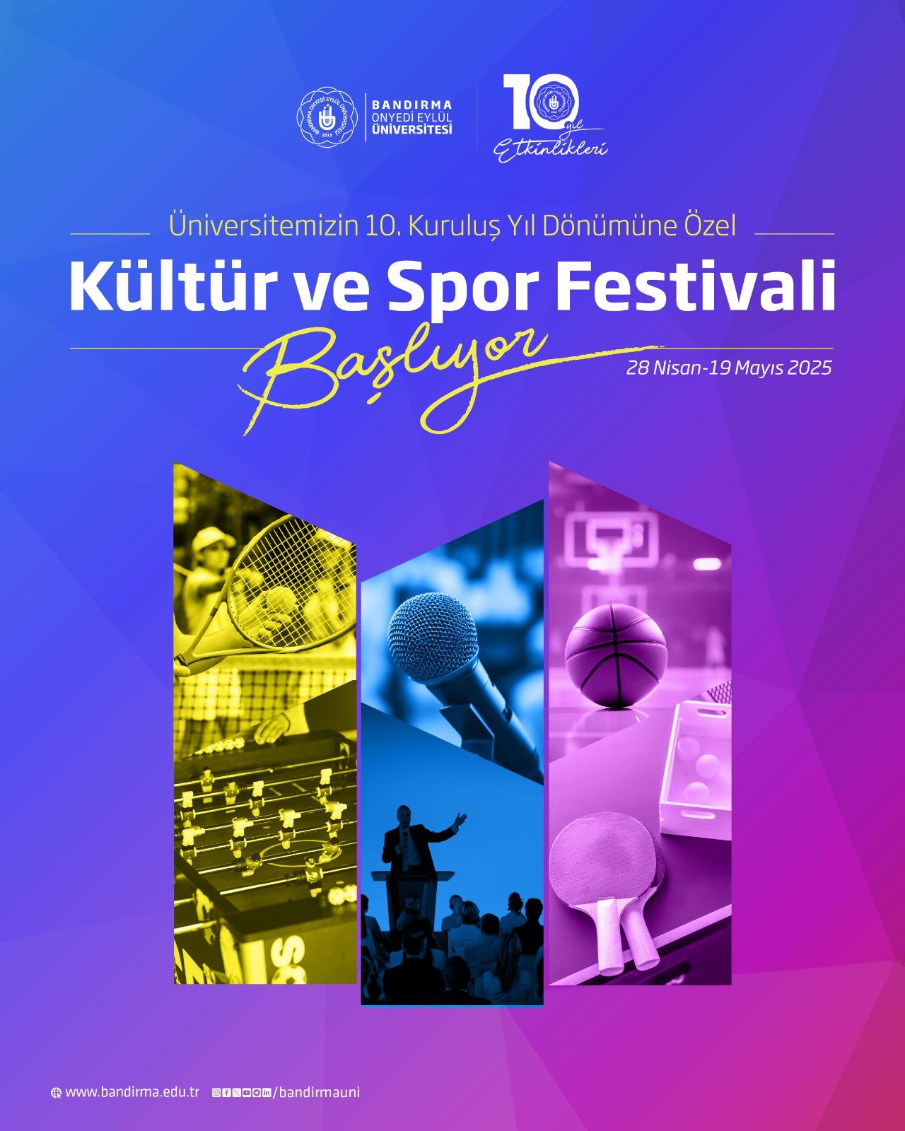 Bandırma Onyedi Eylül Üniversitesi olarak, 10. kuruluş yıl dönümümüzü coşkulu bir etkinlik serisiyle kutluyoruz. Bu anlamlı dönüm noktasına özel olarak düzenleyeceğimiz Kültür ve Spor Festivali, 28 Nisan - 19 Mayıs 2025 tarihleri arasında olacaktır.