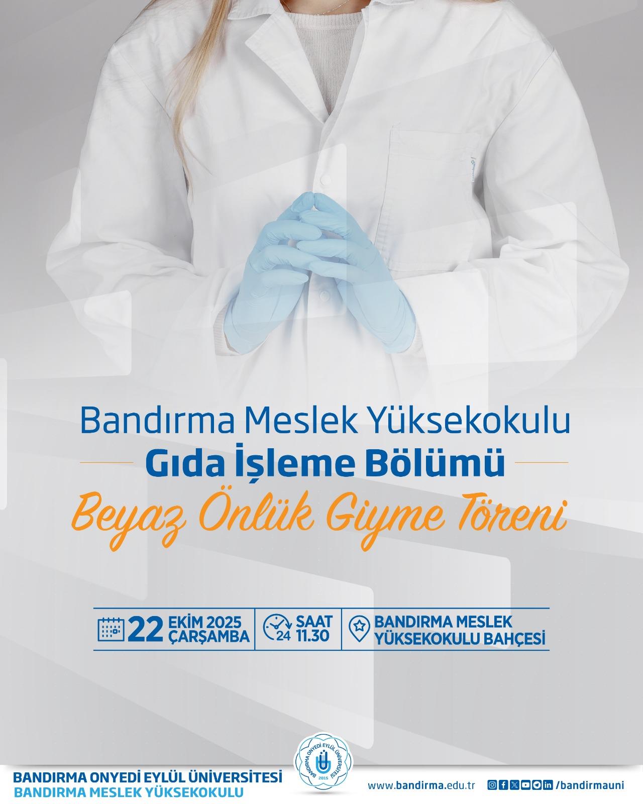 Bandırma Meslek Yüksekokulumuz Gıda İşleme Bölümü tarafından, öğrencilerin mesleki kimlik bilinci kazanmalarına katkı sağlamak amacıyla “Beyaz Önlük Giyme Töreni” gerçekleştirilecektir.